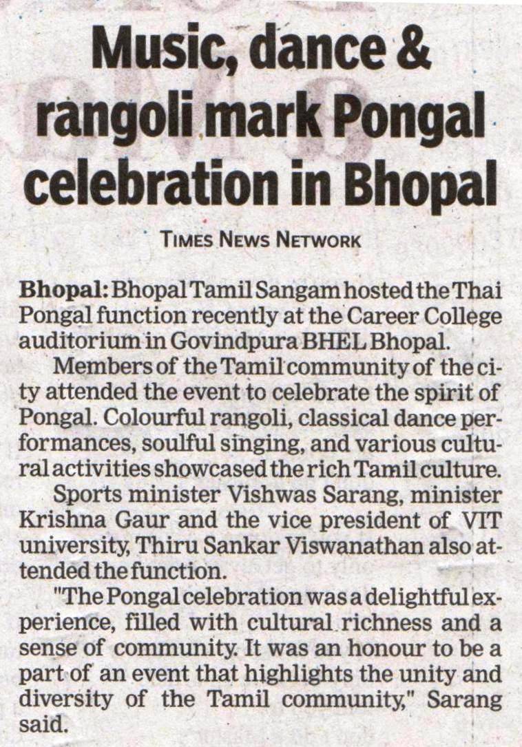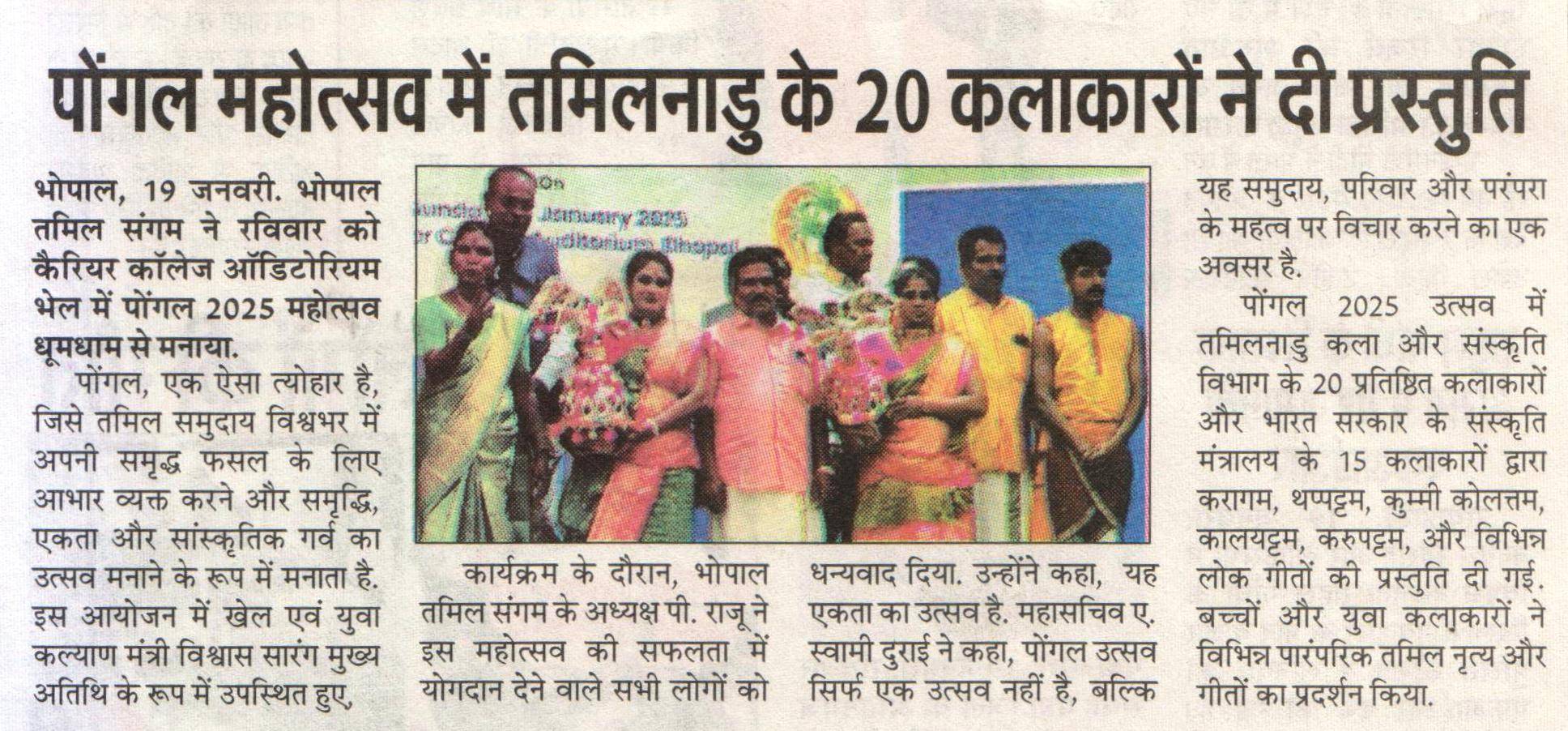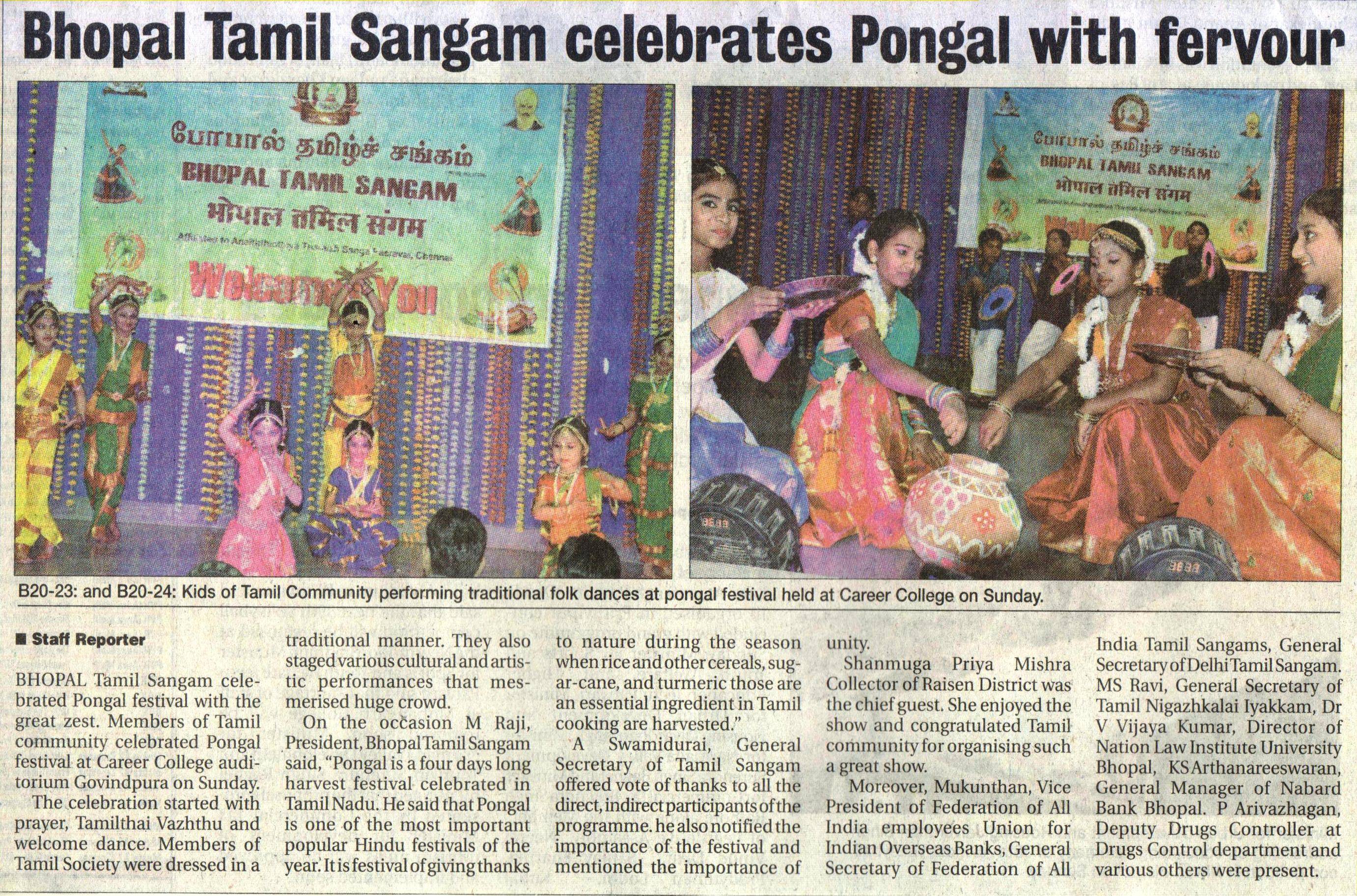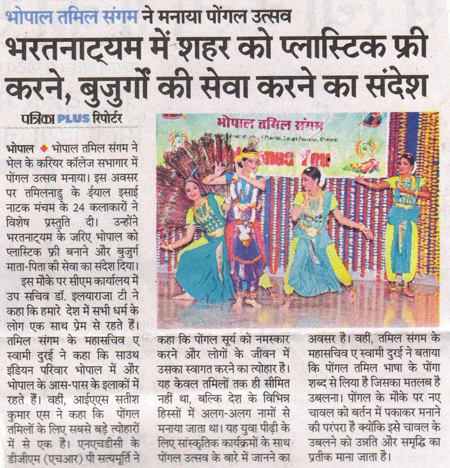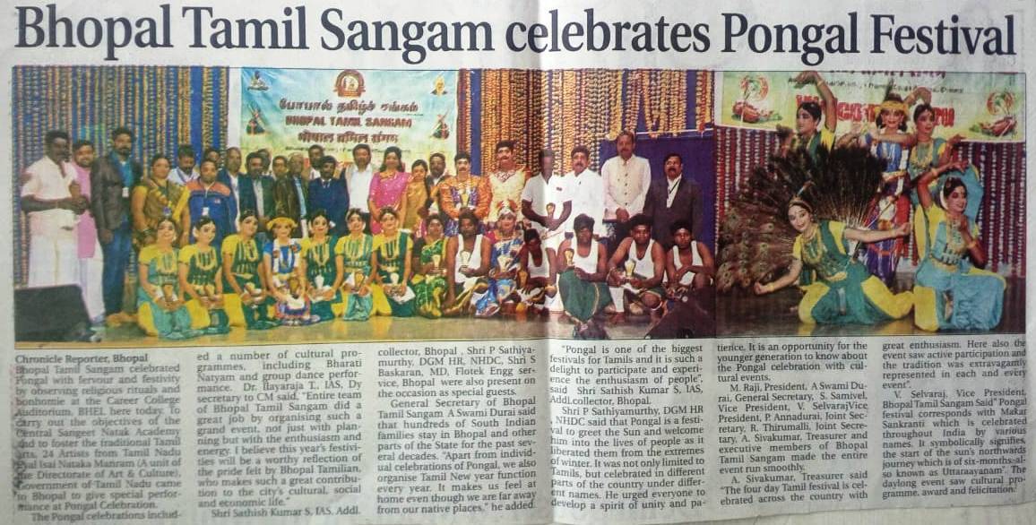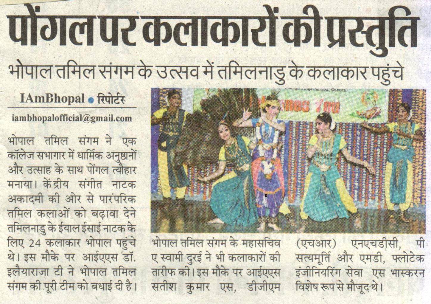 ஜனவரி 19 ஆம் நாள் 2020 ஆம் ஆண்டு போபால் தமிழ்ச் சங்கம் சார்பில் பொங்கல் விழா கொண்டாடப்பட்டது. இந்த பொங்கல் விழாவில் முதன்முறையாக போபாலின் வரலாற்றில், தமிழக அரசின் சார்பாக, தமிழ்நாடு இயல் இசை நாடக மன்றத்தால் அனுப்பப்பட்டது கிராமிய கலைக்குழு. இந்தக்குழுவின் பரத கலைஞர் பரத நாட்டியம் மிகச்சிறப்பாக ஆடினார்கள். கரகாட்டம் மற்றும் கிராமிய கலை நிகழ்ச்சிகள், நடனம், பாடல் மற்றும் கலைநிகழ்ச்சிகளை மக்கள் மனதை கவரும் வகையில் மிகச் சிறப்பாக வழங்கி சிறப்பித்தனர். நடன நிகழ்ச்சி விழா அரங்கை பார்வையாளர்களின் கரவோசையால் அதிர வைத்தது, பார்வையாளர்களை மகிழ்வித்தனர். போபாலில் நடத்திய முதல், தமிழக அரசின் சார்பாக அனுப்பப்பட்ட கிராமிய கலைக்குழு சரித்திரம் நாடகம் இது. தமிழக அரசு அனுப்பிய சிறந்த கலைஞர்களை கௌரவிக்கும் வாய்ப்பும் மற்றும் வருகை தந்த அதிகாரிகளை கௌரவிக்கும் அருமையான வாய்ப்பும் போபால் தமிழ்ச் சங்கத்திற்கு கிடைத்தது.