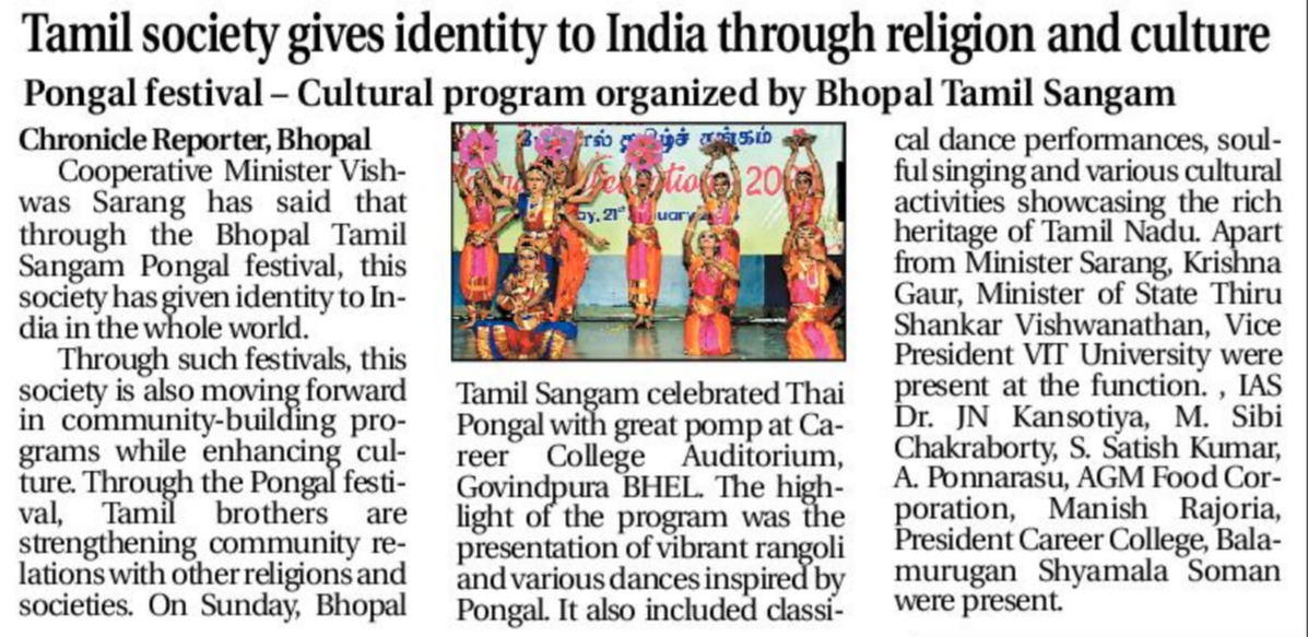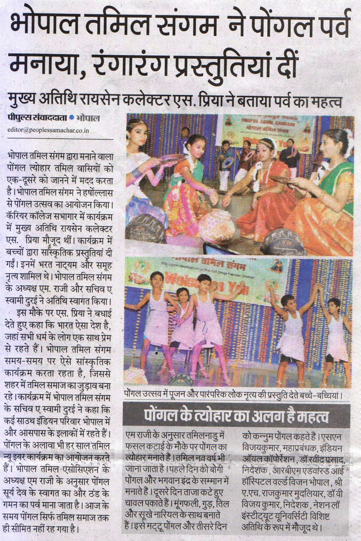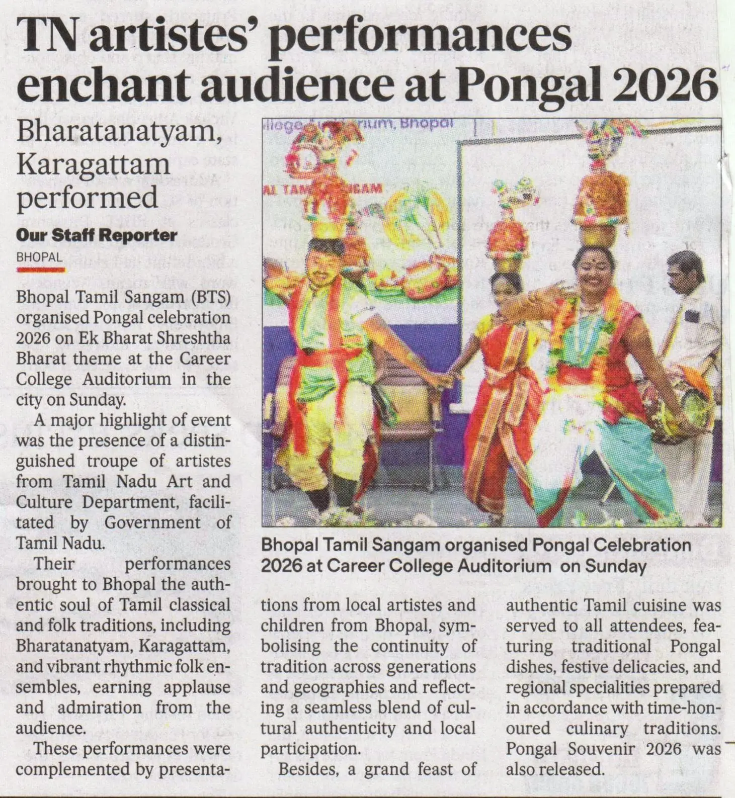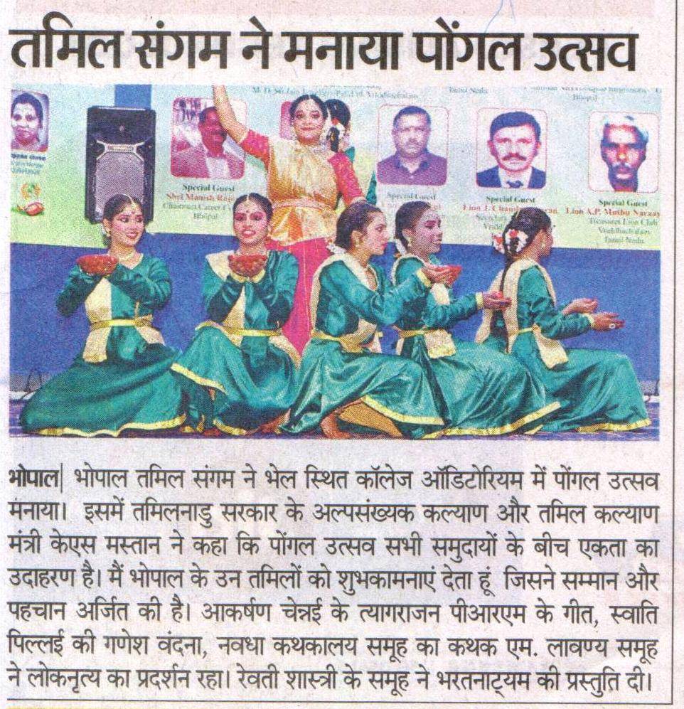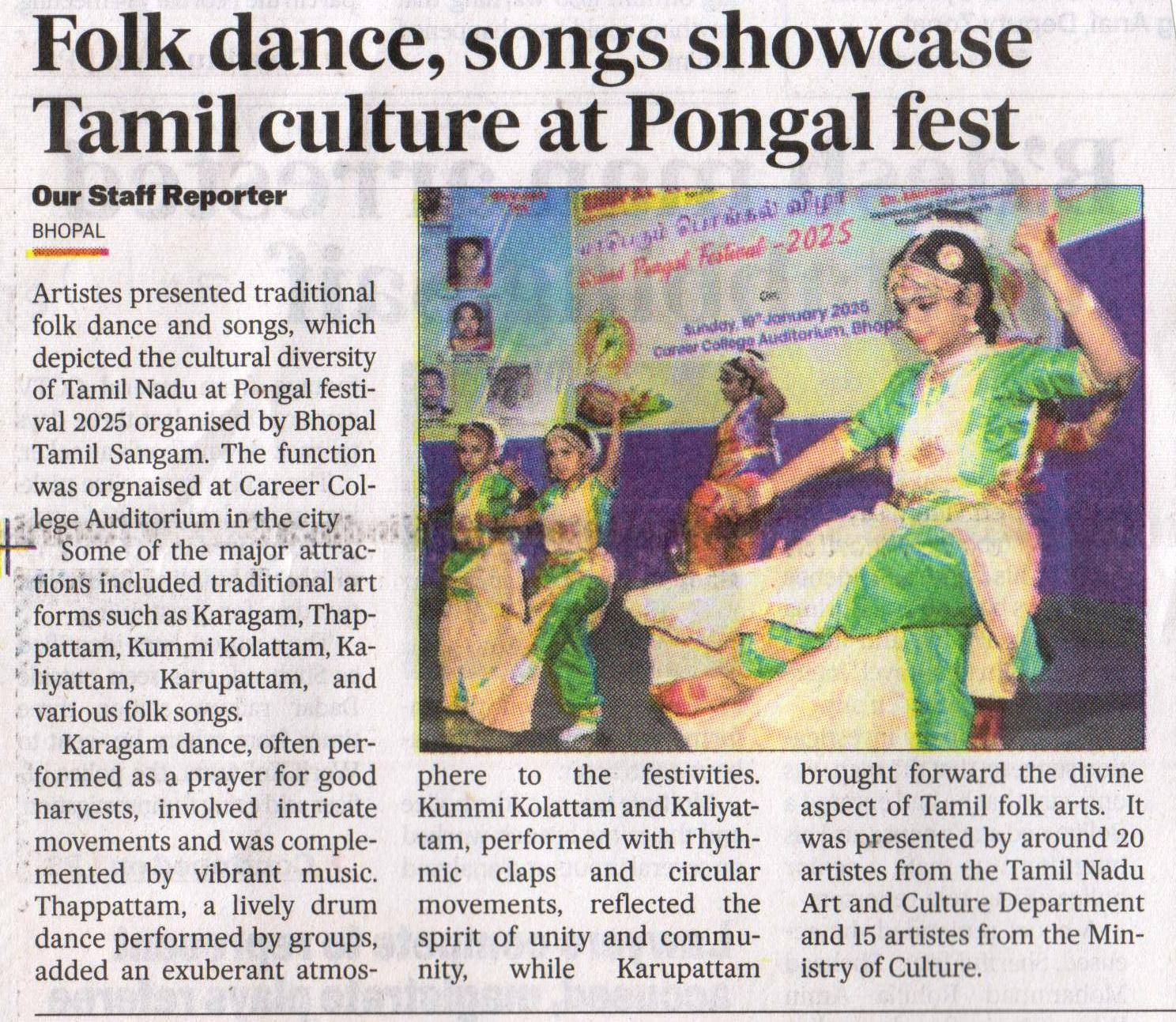 ஜனவரி 19 ஆம் நாள் 2020 ஆம் ஆண்டு போபால் தமிழ்ச் சங்கம் சார்பில் பொங்கல் விழா கொண்டாடப்பட்டது. இந்த பொங்கல் விழாவில் முதன்முறையாக போபாலின் வரலாற்றில், தமிழக அரசின் சார்பாக, தமிழ்நாடு இயல் இசை நாடக மன்றத்தால் அனுப்பப்பட்டது கிராமிய கலைக்குழு. இந்தக்குழுவின் பரத கலைஞர் பரத நாட்டியம் மிகச்சிறப்பாக ஆடினார்கள். கரகாட்டம் மற்றும் கிராமிய கலை நிகழ்ச்சிகள், நடனம், பாடல் மற்றும் கலைநிகழ்ச்சிகளை மக்கள் மனதை கவரும் வகையில் மிகச் சிறப்பாக வழங்கி சிறப்பித்தனர். நடன நிகழ்ச்சி விழா அரங்கை பார்வையாளர்களின் கரவோசையால் அதிர வைத்தது, பார்வையாளர்களை மகிழ்வித்தனர். போபாலில் நடத்திய முதல், தமிழக அரசின் சார்பாக அனுப்பப்பட்ட கிராமிய கலைக்குழு சரித்திரம் நாடகம் இது. தமிழக அரசு அனுப்பிய சிறந்த கலைஞர்களை கௌரவிக்கும் வாய்ப்பும் மற்றும் வருகை தந்த அதிகாரிகளை கௌரவிக்கும் அருமையான வாய்ப்பும் போபால் தமிழ்ச் சங்கத்திற்கு கிடைத்தது.