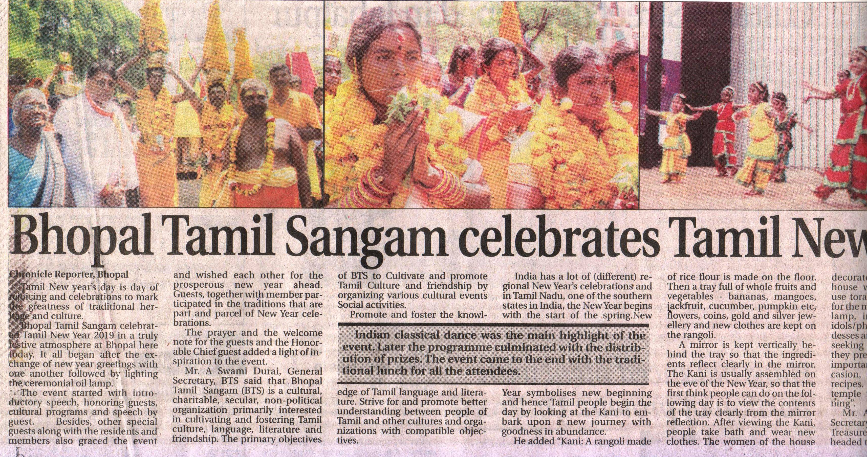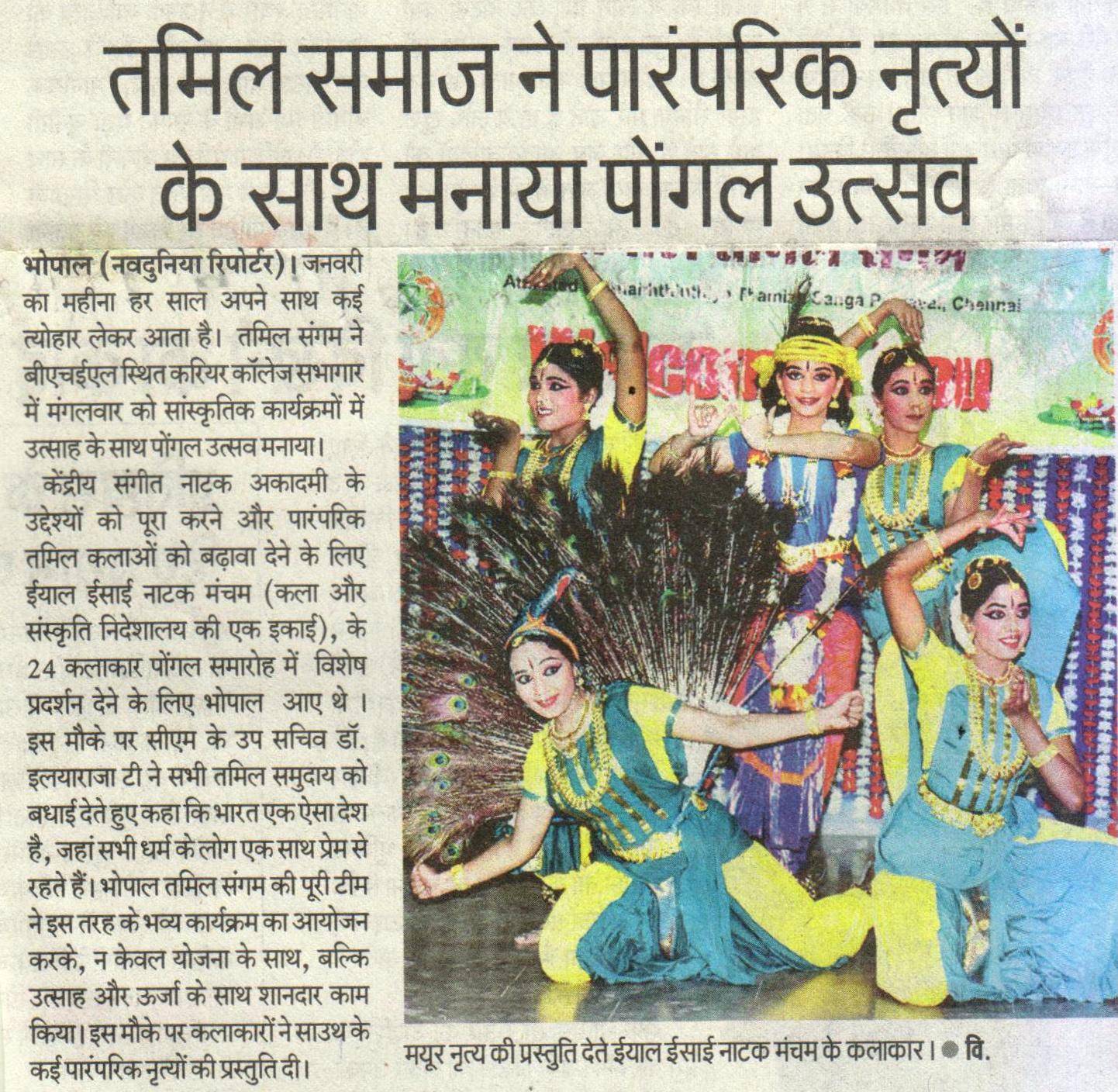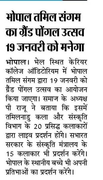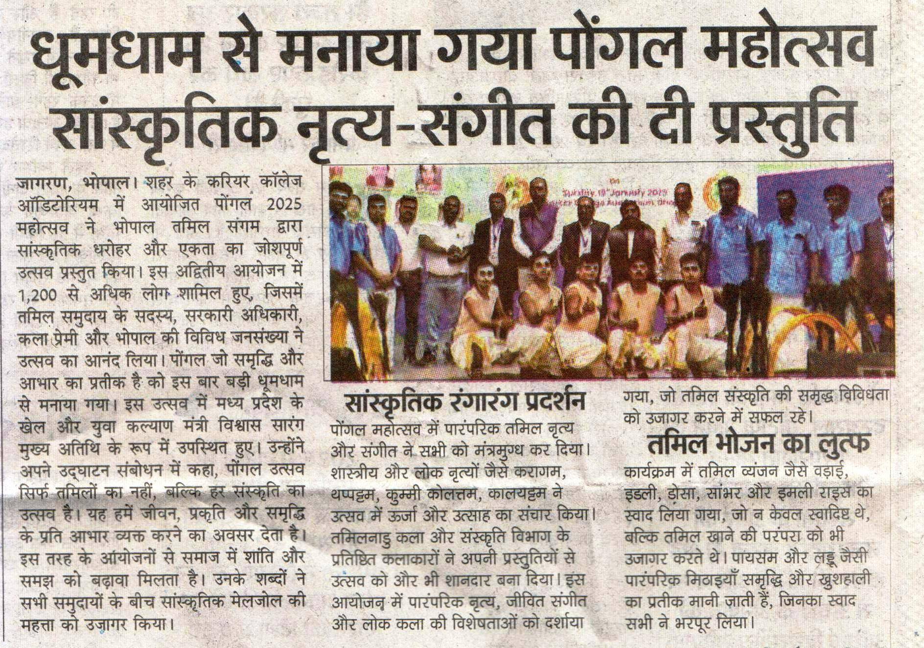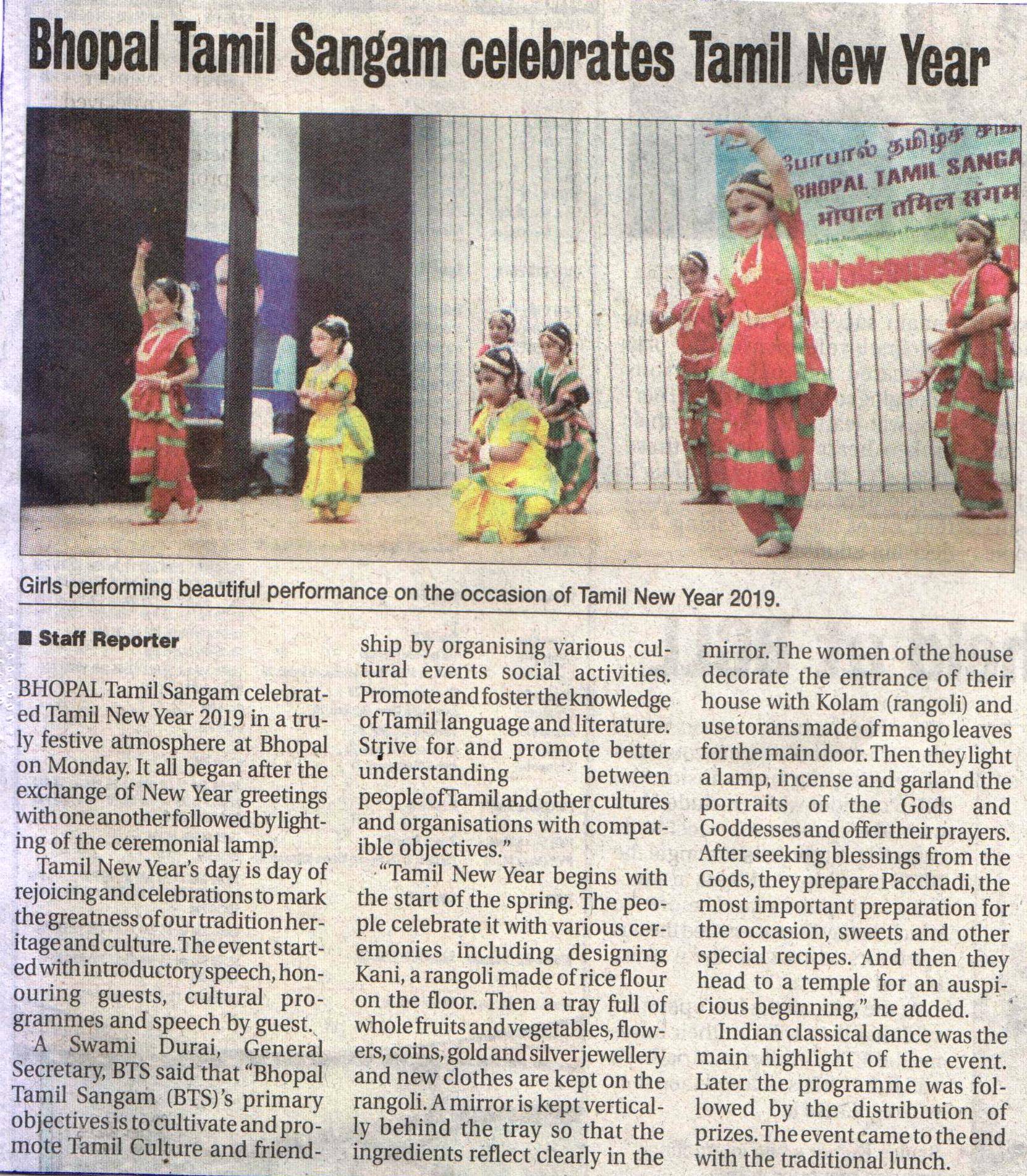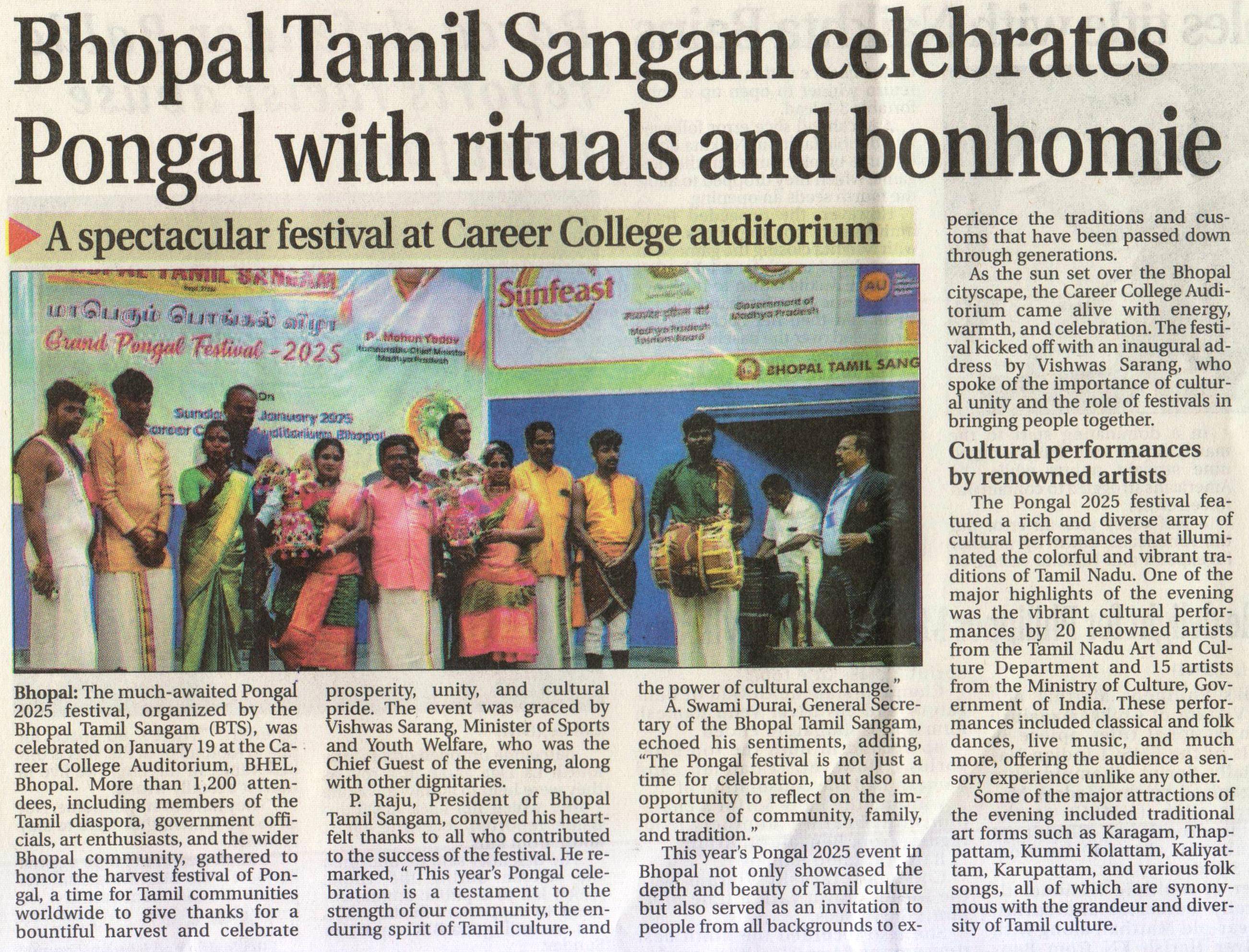 ஜனவரி 19 ஆம் நாள் 2020 ஆம் ஆண்டு போபால் தமிழ்ச் சங்கம் சார்பில் பொங்கல் விழா கொண்டாடப்பட்டது. இந்த பொங்கல் விழாவில் முதன்முறையாக போபாலின் வரலாற்றில், தமிழக அரசின் சார்பாக, தமிழ்நாடு இயல் இசை நாடக மன்றத்தால் அனுப்பப்பட்டது கிராமிய கலைக்குழு. இந்தக்குழுவின் பரத கலைஞர் பரத நாட்டியம் மிகச்சிறப்பாக ஆடினார்கள். கரகாட்டம் மற்றும் கிராமிய கலை நிகழ்ச்சிகள், நடனம், பாடல் மற்றும் கலைநிகழ்ச்சிகளை மக்கள் மனதை கவரும் வகையில் மிகச் சிறப்பாக வழங்கி சிறப்பித்தனர். நடன நிகழ்ச்சி விழா அரங்கை பார்வையாளர்களின் கரவோசையால் அதிர வைத்தது, பார்வையாளர்களை மகிழ்வித்தனர். போபாலில் நடத்திய முதல், தமிழக அரசின் சார்பாக அனுப்பப்பட்ட கிராமிய கலைக்குழு சரித்திரம் நாடகம் இது. தமிழக அரசு அனுப்பிய சிறந்த கலைஞர்களை கௌரவிக்கும் வாய்ப்பும் மற்றும் வருகை தந்த அதிகாரிகளை கௌரவிக்கும் அருமையான வாய்ப்பும் போபால் தமிழ்ச் சங்கத்திற்கு கிடைத்தது.