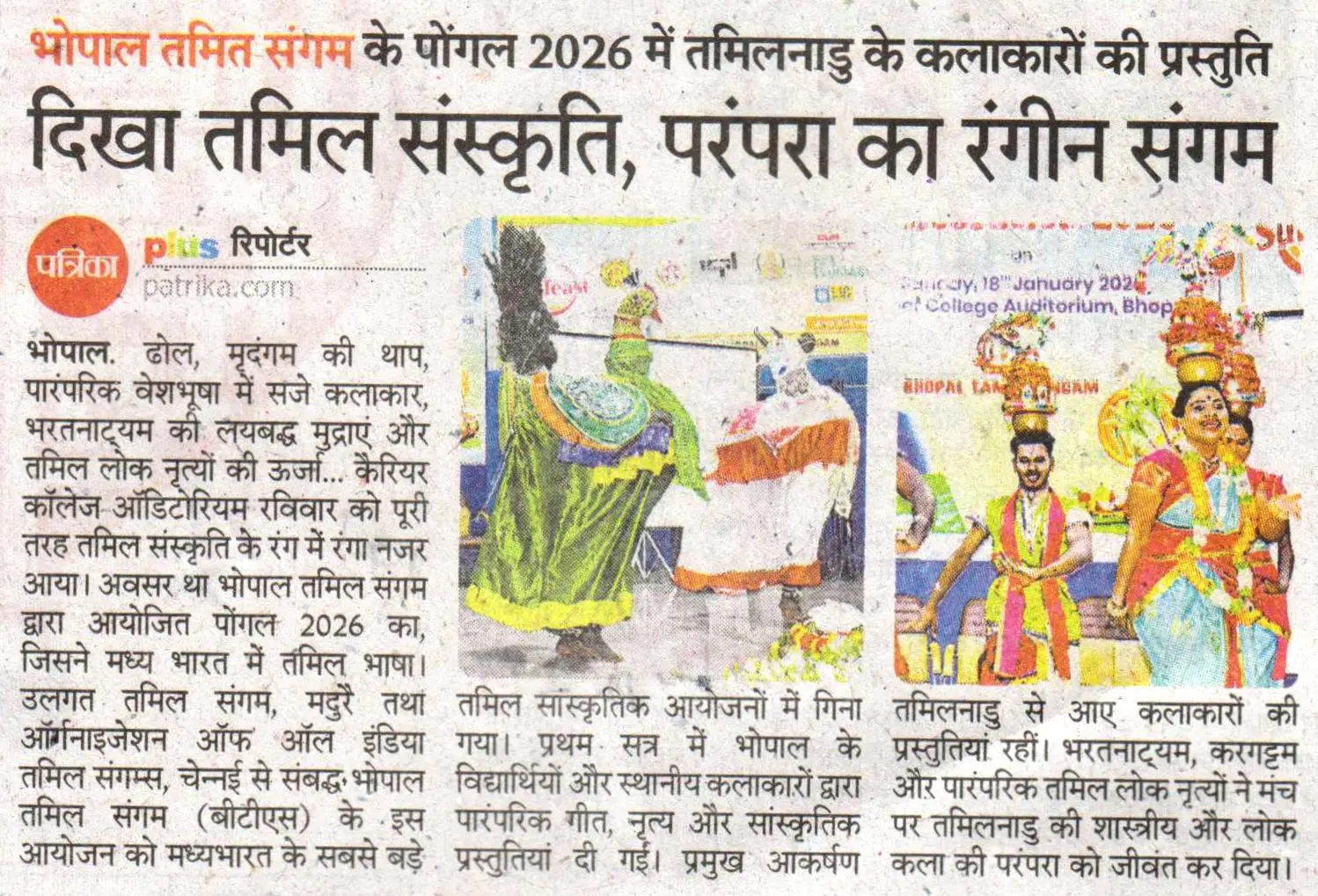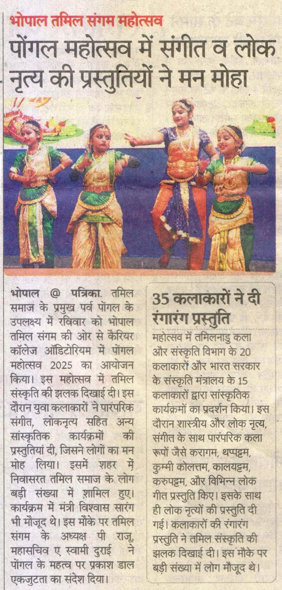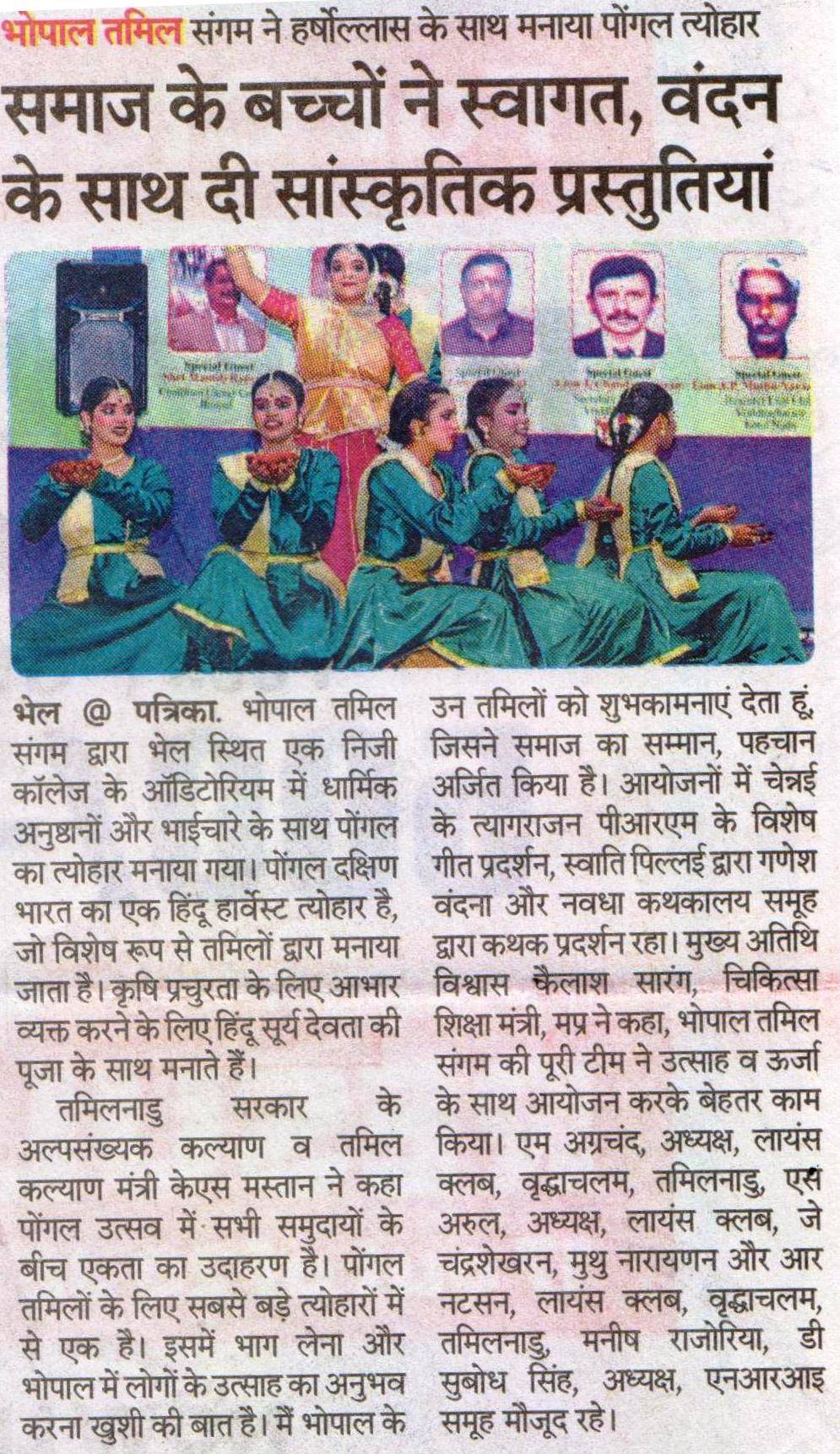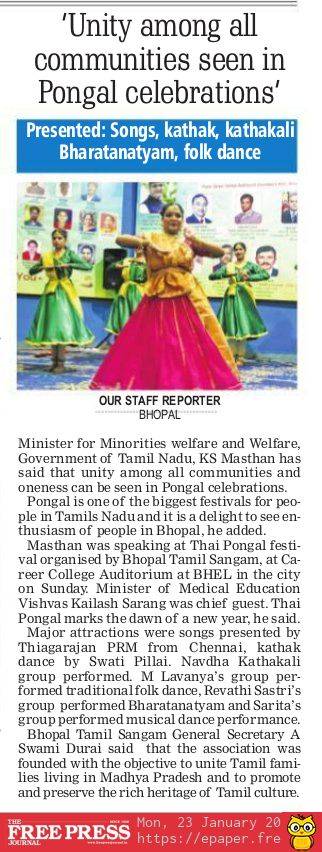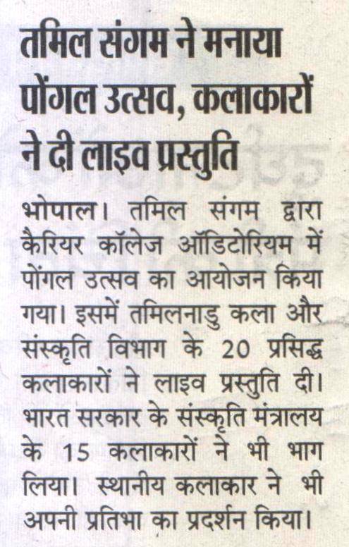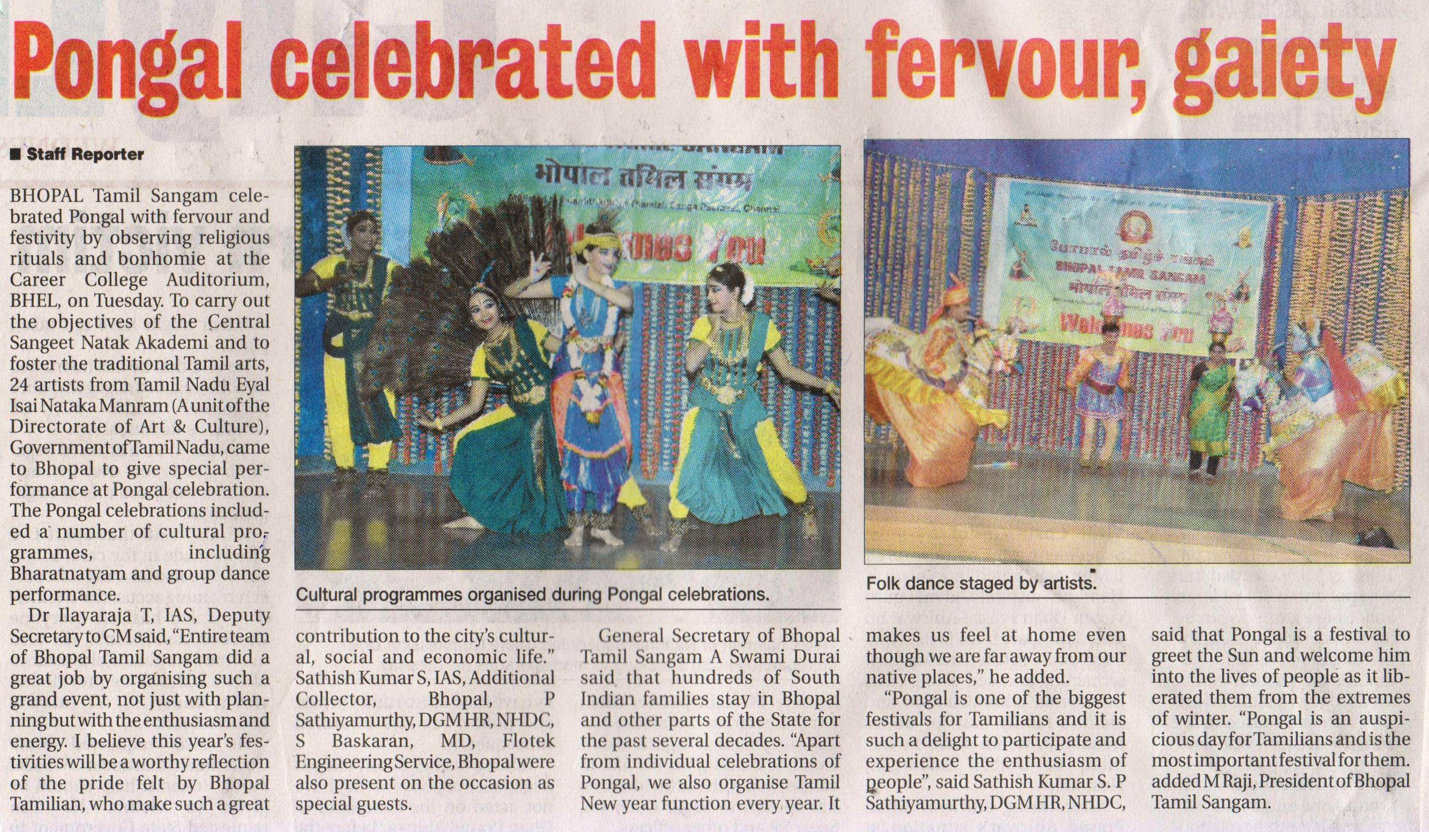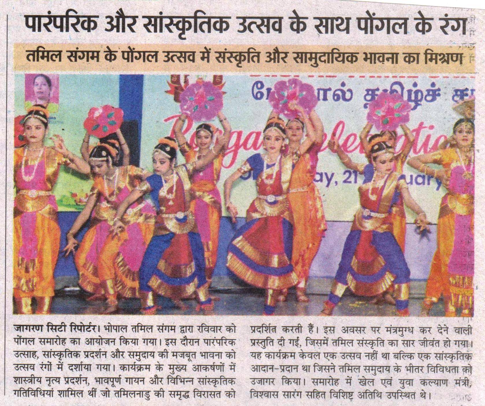 ஜனவரி 19 ஆம் நாள் 2020 ஆம் ஆண்டு போபால் தமிழ்ச் சங்கம் சார்பில் பொங்கல் விழா கொண்டாடப்பட்டது. இந்த பொங்கல் விழாவில் முதன்முறையாக போபாலின் வரலாற்றில், தமிழக அரசின் சார்பாக, தமிழ்நாடு இயல் இசை நாடக மன்றத்தால் அனுப்பப்பட்டது கிராமிய கலைக்குழு. இந்தக்குழுவின் பரத கலைஞர் பரத நாட்டியம் மிகச்சிறப்பாக ஆடினார்கள். கரகாட்டம் மற்றும் கிராமிய கலை நிகழ்ச்சிகள், நடனம், பாடல் மற்றும் கலைநிகழ்ச்சிகளை மக்கள் மனதை கவரும் வகையில் மிகச் சிறப்பாக வழங்கி சிறப்பித்தனர். நடன நிகழ்ச்சி விழா அரங்கை பார்வையாளர்களின் கரவோசையால் அதிர வைத்தது, பார்வையாளர்களை மகிழ்வித்தனர். போபாலில் நடத்திய முதல், தமிழக அரசின் சார்பாக அனுப்பப்பட்ட கிராமிய கலைக்குழு சரித்திரம் நாடகம் இது. தமிழக அரசு அனுப்பிய சிறந்த கலைஞர்களை கௌரவிக்கும் வாய்ப்பும் மற்றும் வருகை தந்த அதிகாரிகளை கௌரவிக்கும் அருமையான வாய்ப்பும் போபால் தமிழ்ச் சங்கத்திற்கு கிடைத்தது.