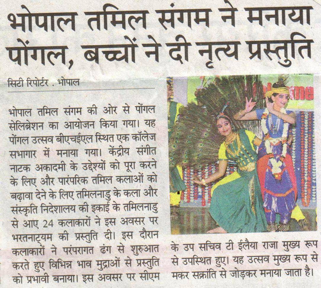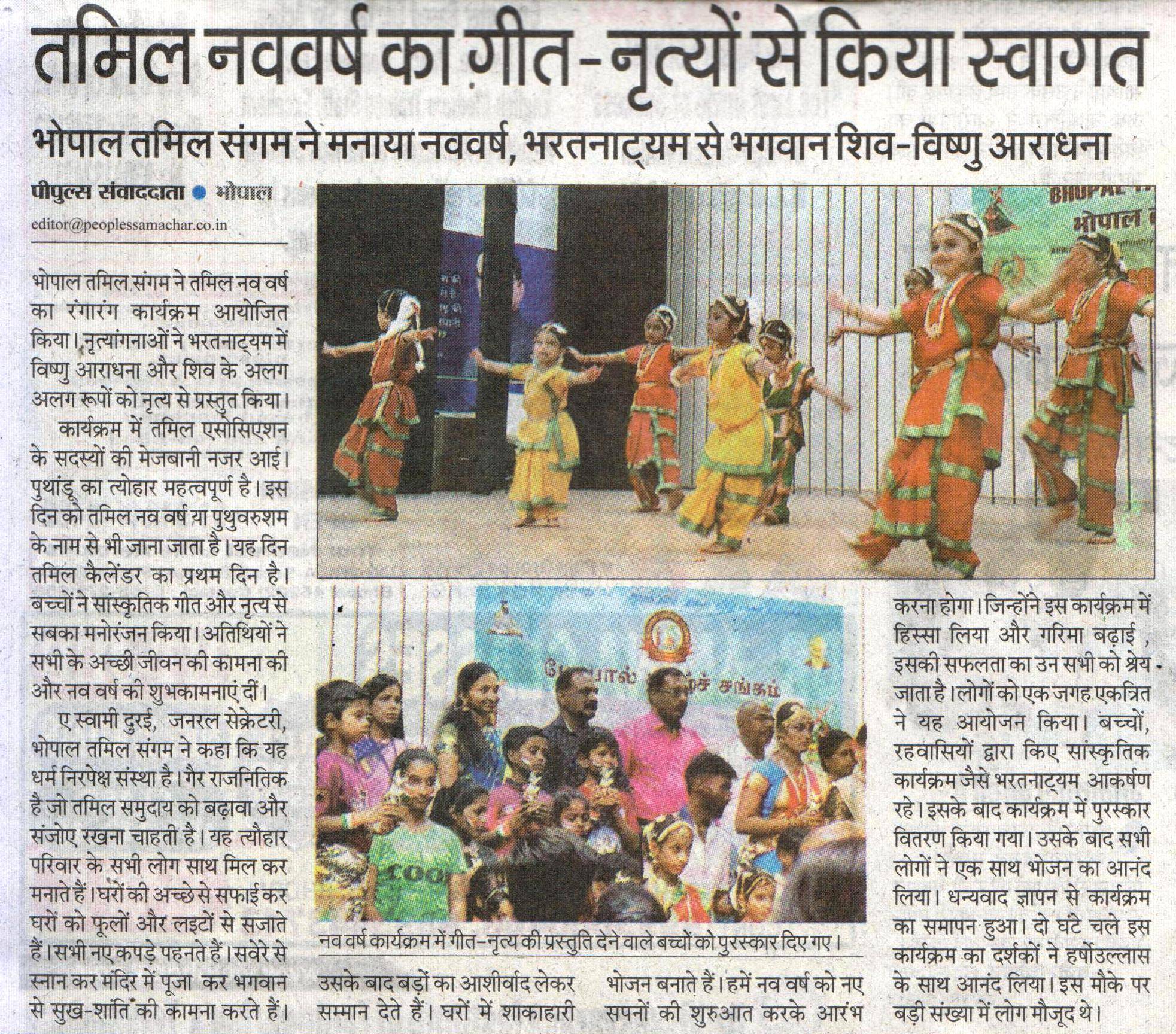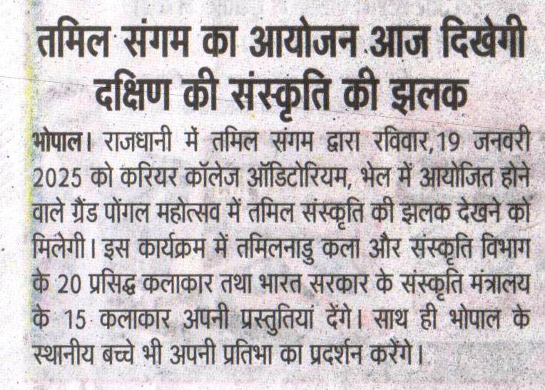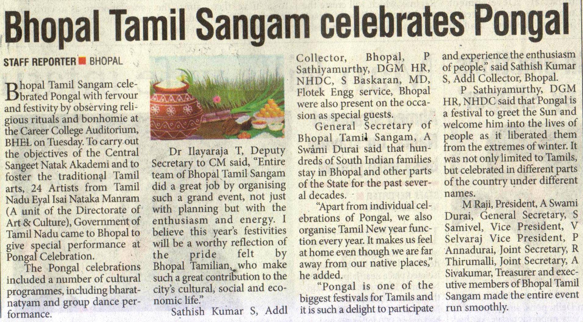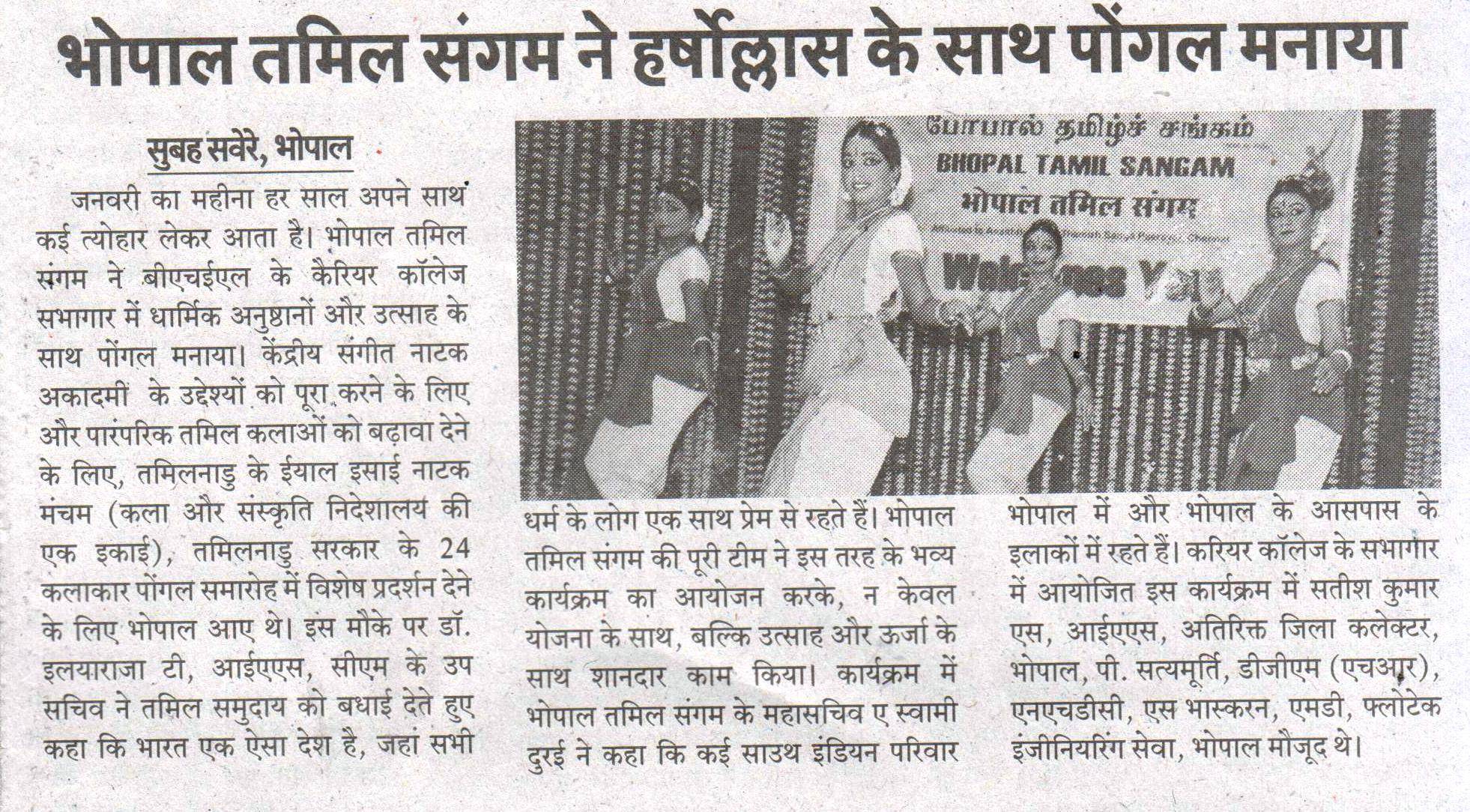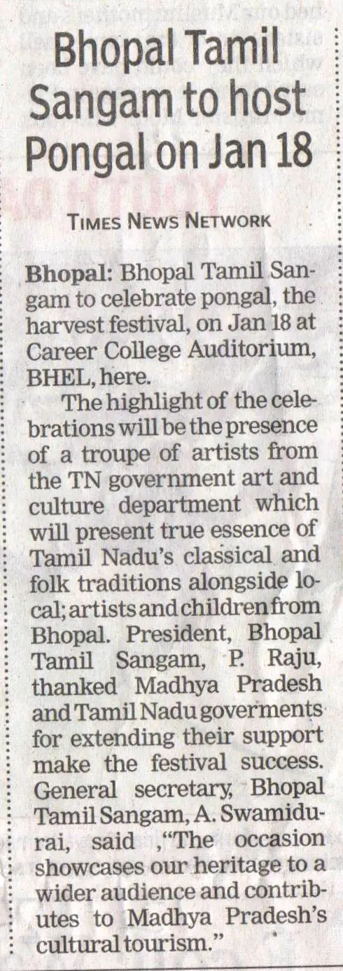 ஜனவரி 19 ஆம் நாள் 2020 ஆம் ஆண்டு போபால் தமிழ்ச் சங்கம் சார்பில் பொங்கல் விழா கொண்டாடப்பட்டது. இந்த பொங்கல் விழாவில் முதன்முறையாக போபாலின் வரலாற்றில், தமிழக அரசின் சார்பாக, தமிழ்நாடு இயல் இசை நாடக மன்றத்தால் அனுப்பப்பட்டது கிராமிய கலைக்குழு. இந்தக்குழுவின் பரத கலைஞர் பரத நாட்டியம் மிகச்சிறப்பாக ஆடினார்கள். கரகாட்டம் மற்றும் கிராமிய கலை நிகழ்ச்சிகள், நடனம், பாடல் மற்றும் கலைநிகழ்ச்சிகளை மக்கள் மனதை கவரும் வகையில் மிகச் சிறப்பாக வழங்கி சிறப்பித்தனர். நடன நிகழ்ச்சி விழா அரங்கை பார்வையாளர்களின் கரவோசையால் அதிர வைத்தது, பார்வையாளர்களை மகிழ்வித்தனர். போபாலில் நடத்திய முதல், தமிழக அரசின் சார்பாக அனுப்பப்பட்ட கிராமிய கலைக்குழு சரித்திரம் நாடகம் இது. தமிழக அரசு அனுப்பிய சிறந்த கலைஞர்களை கௌரவிக்கும் வாய்ப்பும் மற்றும் வருகை தந்த அதிகாரிகளை கௌரவிக்கும் அருமையான வாய்ப்பும் போபால் தமிழ்ச் சங்கத்திற்கு கிடைத்தது.