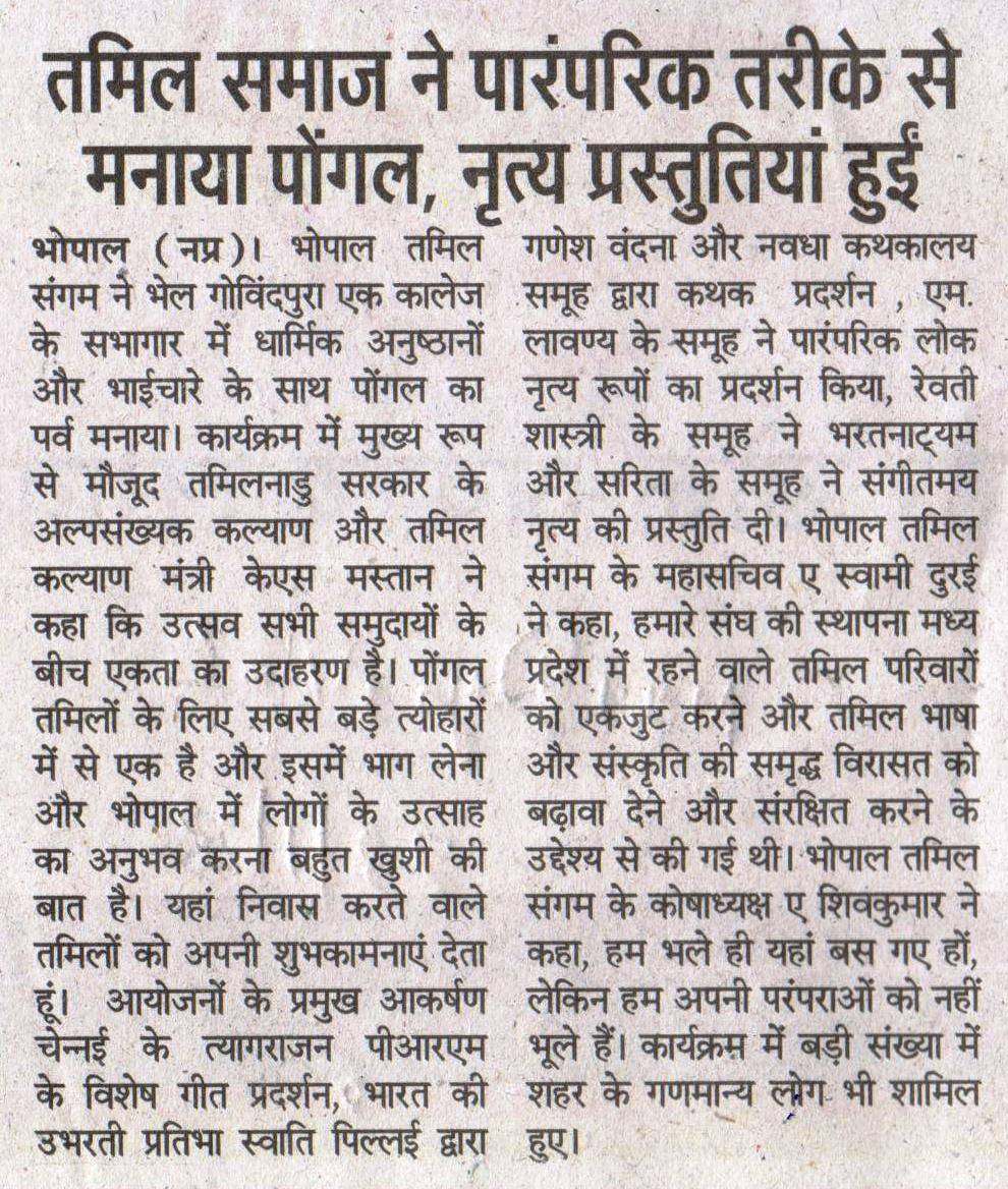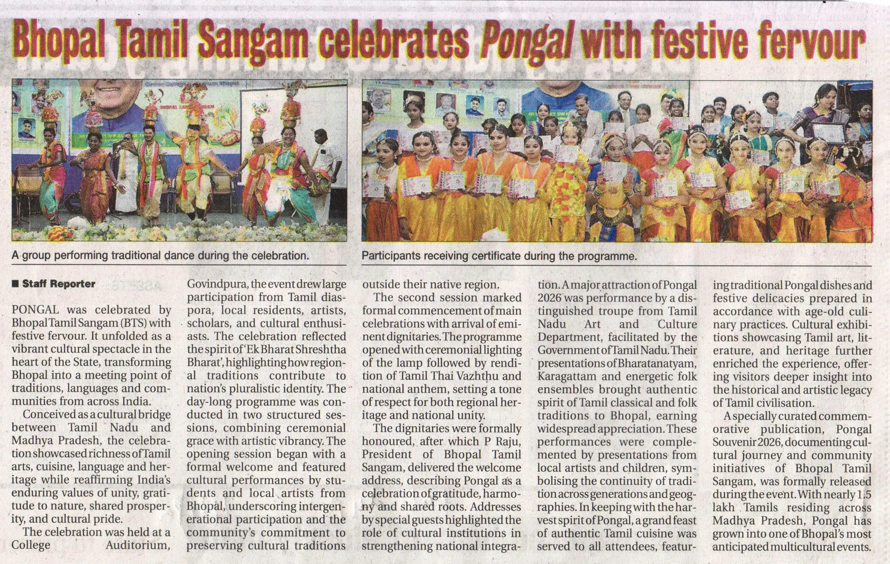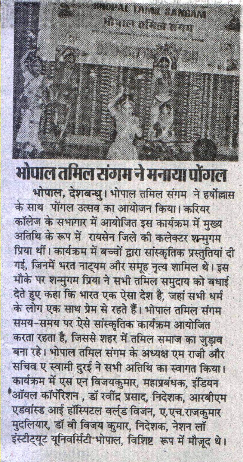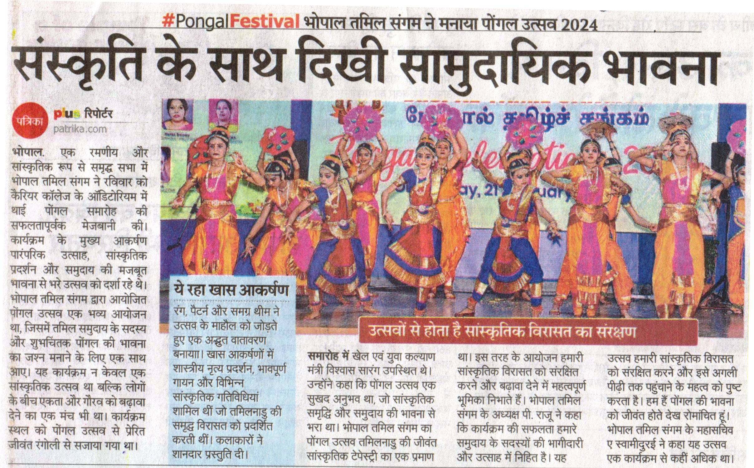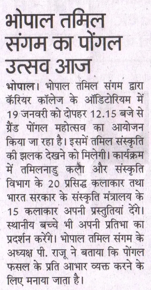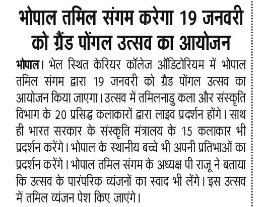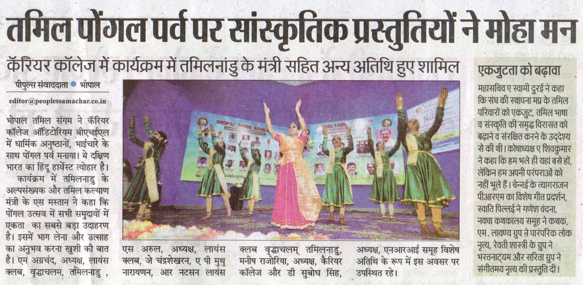 ஜனவரி 19 ஆம் நாள் 2020 ஆம் ஆண்டு போபால் தமிழ்ச் சங்கம் சார்பில் பொங்கல் விழா கொண்டாடப்பட்டது. இந்த பொங்கல் விழாவில் முதன்முறையாக போபாலின் வரலாற்றில், தமிழக அரசின் சார்பாக, தமிழ்நாடு இயல் இசை நாடக மன்றத்தால் அனுப்பப்பட்டது கிராமிய கலைக்குழு. இந்தக்குழுவின் பரத கலைஞர் பரத நாட்டியம் மிகச்சிறப்பாக ஆடினார்கள். கரகாட்டம் மற்றும் கிராமிய கலை நிகழ்ச்சிகள், நடனம், பாடல் மற்றும் கலைநிகழ்ச்சிகளை மக்கள் மனதை கவரும் வகையில் மிகச் சிறப்பாக வழங்கி சிறப்பித்தனர். நடன நிகழ்ச்சி விழா அரங்கை பார்வையாளர்களின் கரவோசையால் அதிர வைத்தது, பார்வையாளர்களை மகிழ்வித்தனர். போபாலில் நடத்திய முதல், தமிழக அரசின் சார்பாக அனுப்பப்பட்ட கிராமிய கலைக்குழு சரித்திரம் நாடகம் இது. தமிழக அரசு அனுப்பிய சிறந்த கலைஞர்களை கௌரவிக்கும் வாய்ப்பும் மற்றும் வருகை தந்த அதிகாரிகளை கௌரவிக்கும் அருமையான வாய்ப்பும் போபால் தமிழ்ச் சங்கத்திற்கு கிடைத்தது.