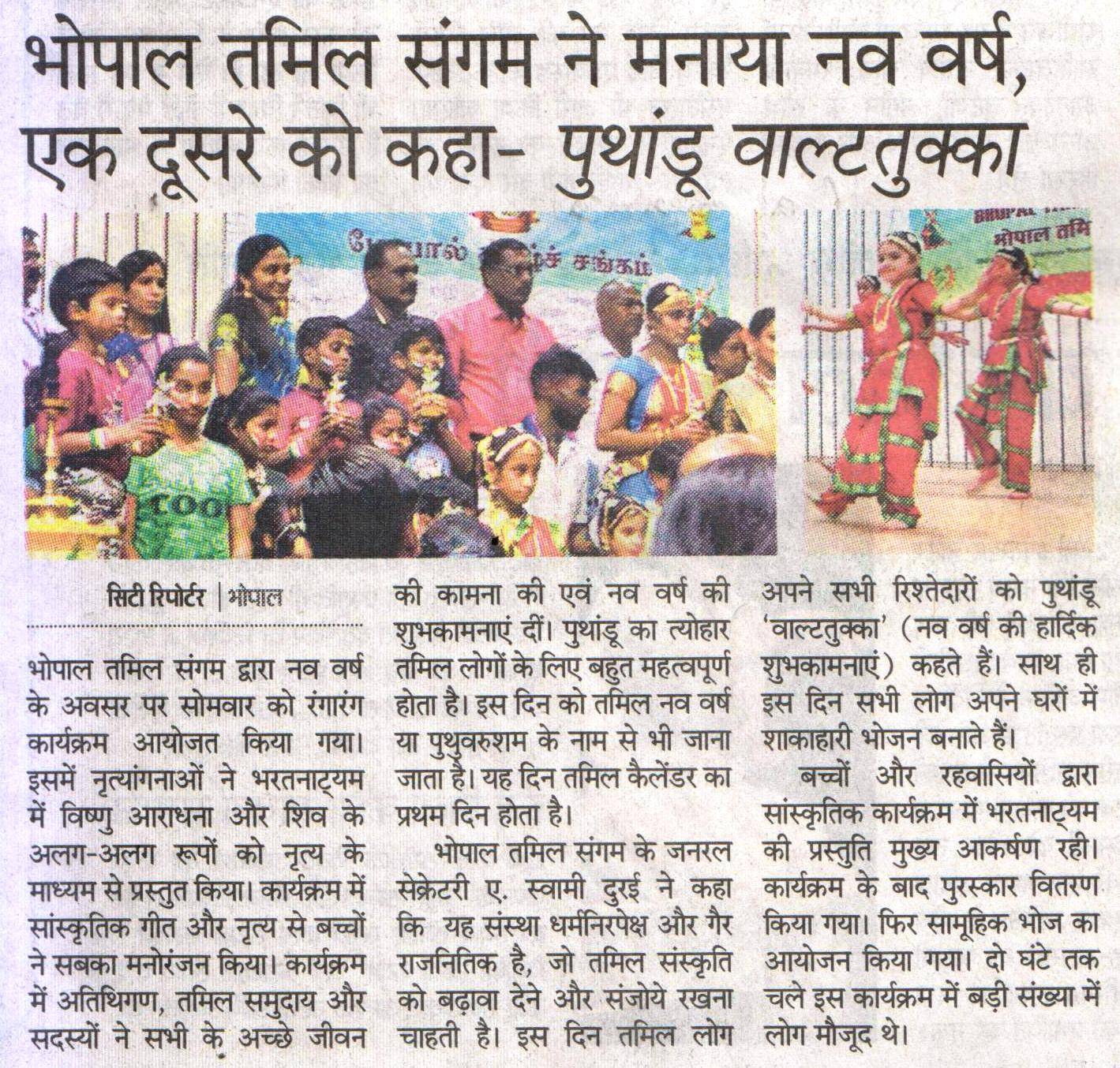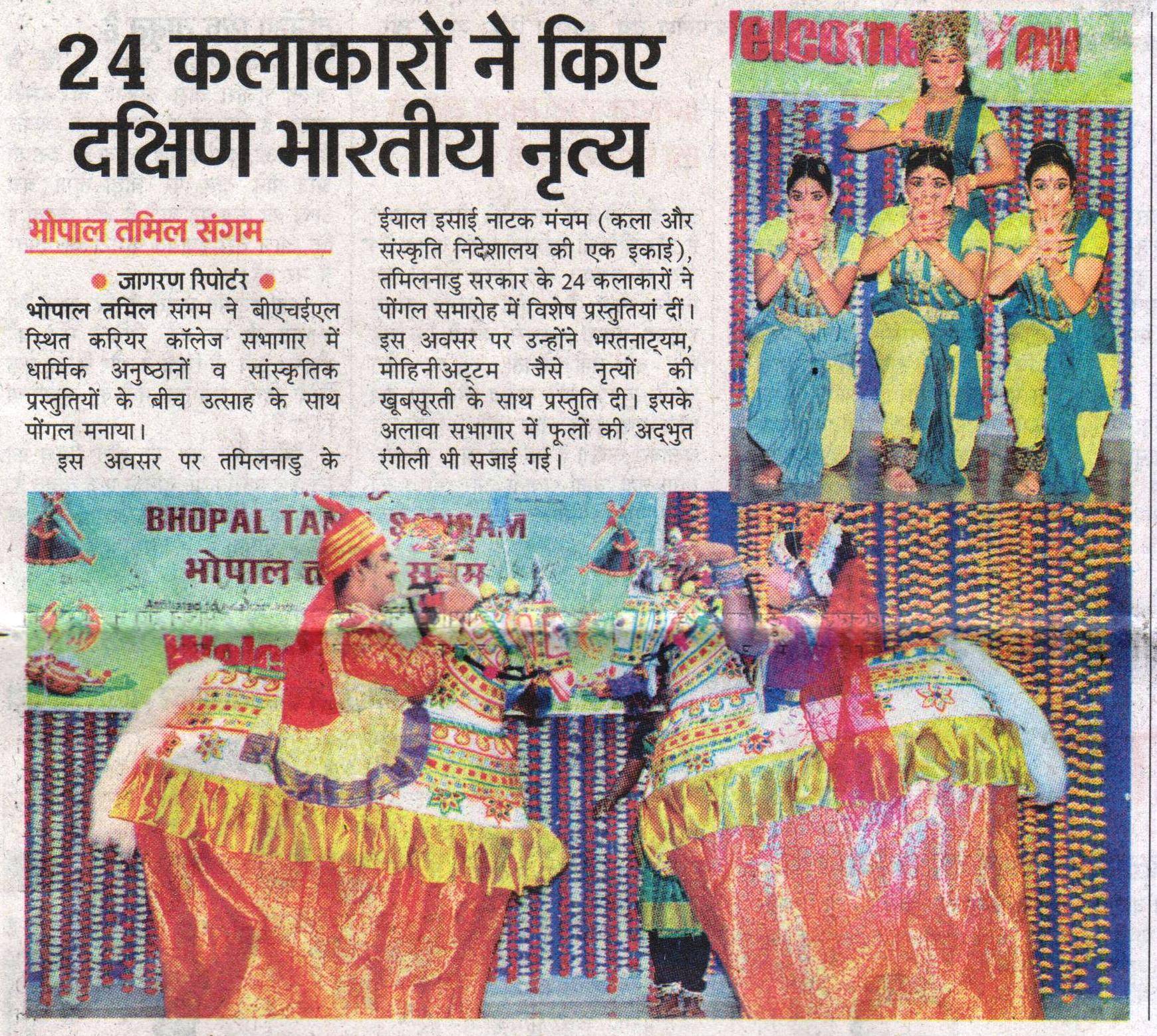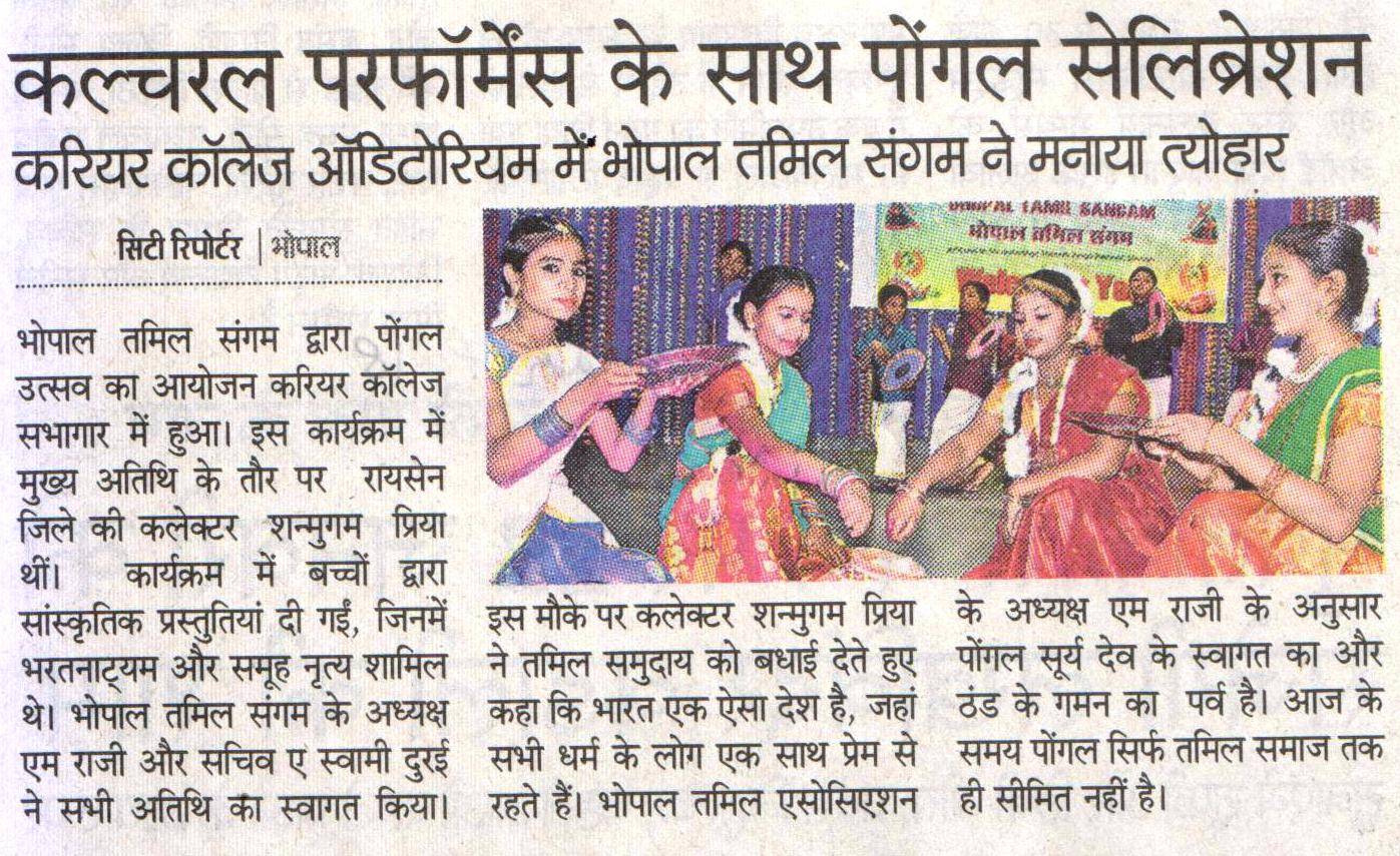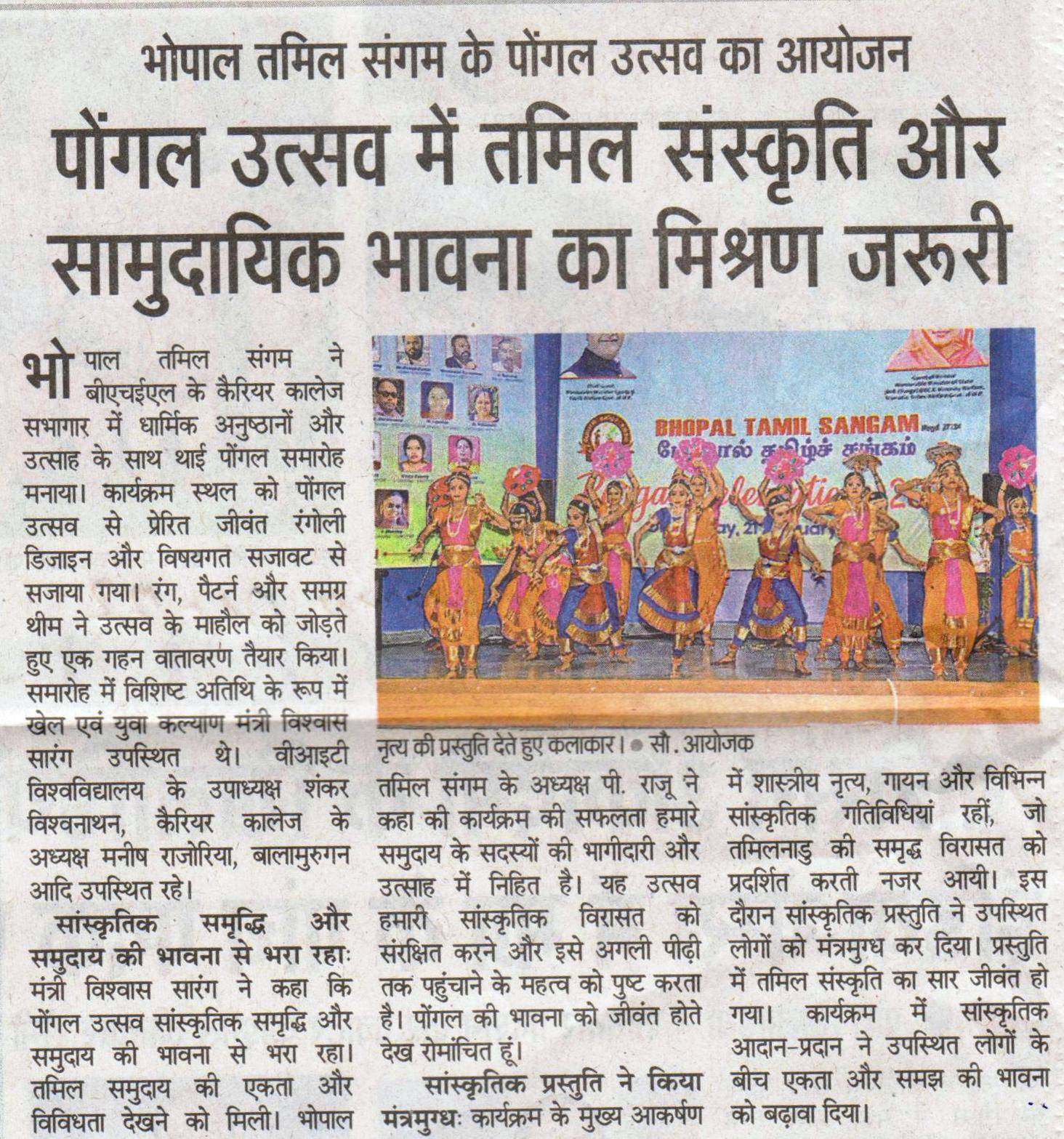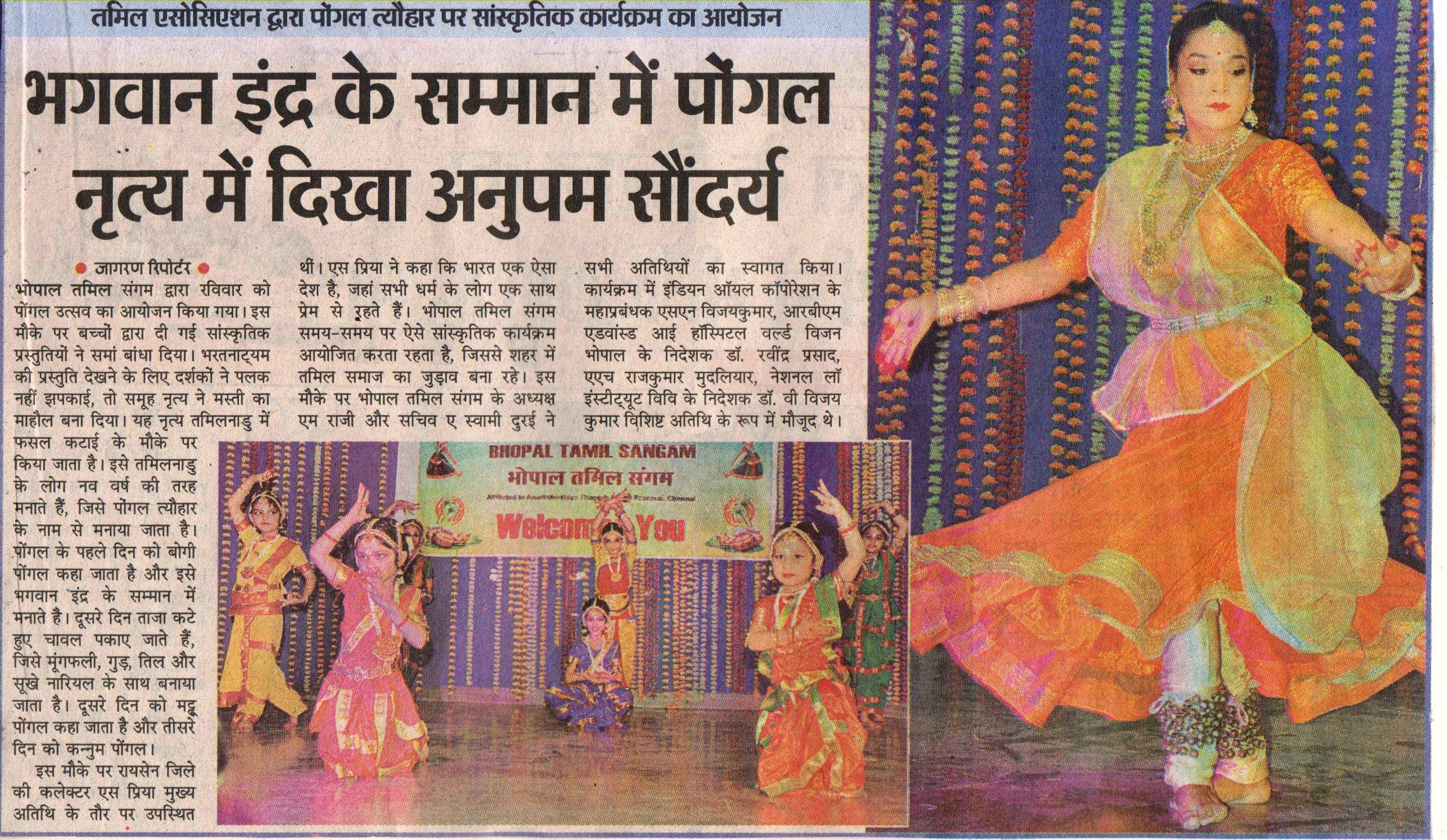 ஜனவரி 19 ஆம் நாள் 2020 ஆம் ஆண்டு போபால் தமிழ்ச் சங்கம் சார்பில் பொங்கல் விழா கொண்டாடப்பட்டது. இந்த பொங்கல் விழாவில் முதன்முறையாக போபாலின் வரலாற்றில், தமிழக அரசின் சார்பாக, தமிழ்நாடு இயல் இசை நாடக மன்றத்தால் அனுப்பப்பட்டது கிராமிய கலைக்குழு. இந்தக்குழுவின் பரத கலைஞர் பரத நாட்டியம் மிகச்சிறப்பாக ஆடினார்கள். கரகாட்டம் மற்றும் கிராமிய கலை நிகழ்ச்சிகள், நடனம், பாடல் மற்றும் கலைநிகழ்ச்சிகளை மக்கள் மனதை கவரும் வகையில் மிகச் சிறப்பாக வழங்கி சிறப்பித்தனர். நடன நிகழ்ச்சி விழா அரங்கை பார்வையாளர்களின் கரவோசையால் அதிர வைத்தது, பார்வையாளர்களை மகிழ்வித்தனர். போபாலில் நடத்திய முதல், தமிழக அரசின் சார்பாக அனுப்பப்பட்ட கிராமிய கலைக்குழு சரித்திரம் நாடகம் இது. தமிழக அரசு அனுப்பிய சிறந்த கலைஞர்களை கௌரவிக்கும் வாய்ப்பும் மற்றும் வருகை தந்த அதிகாரிகளை கௌரவிக்கும் அருமையான வாய்ப்பும் போபால் தமிழ்ச் சங்கத்திற்கு கிடைத்தது.