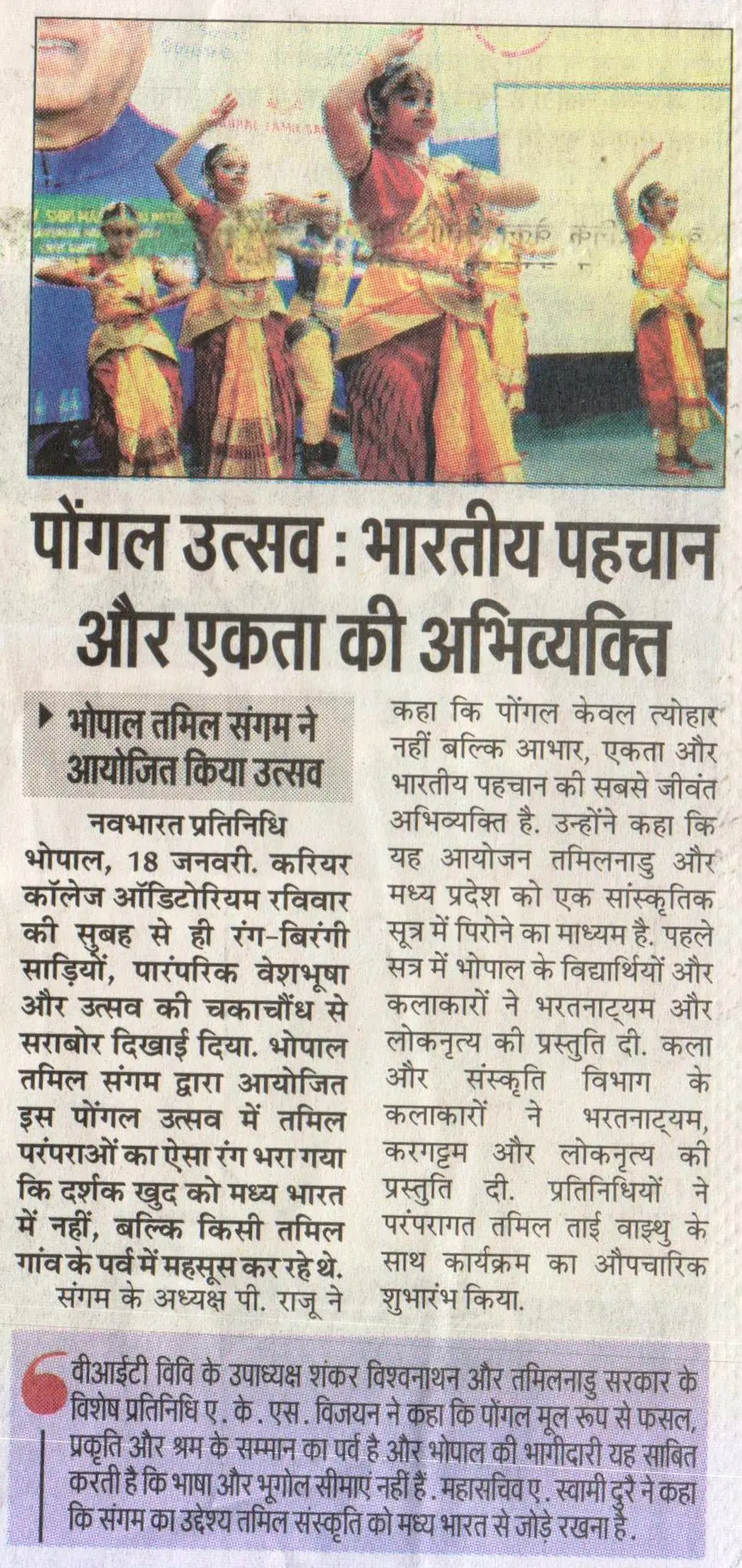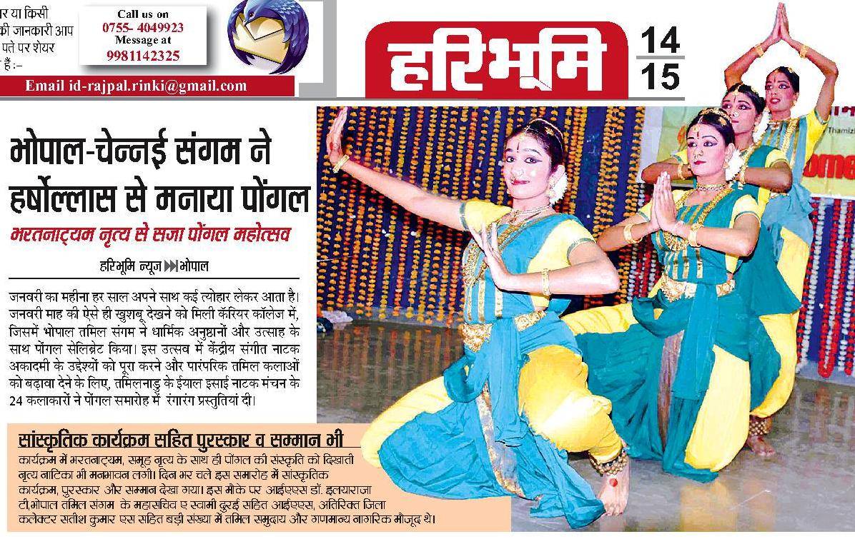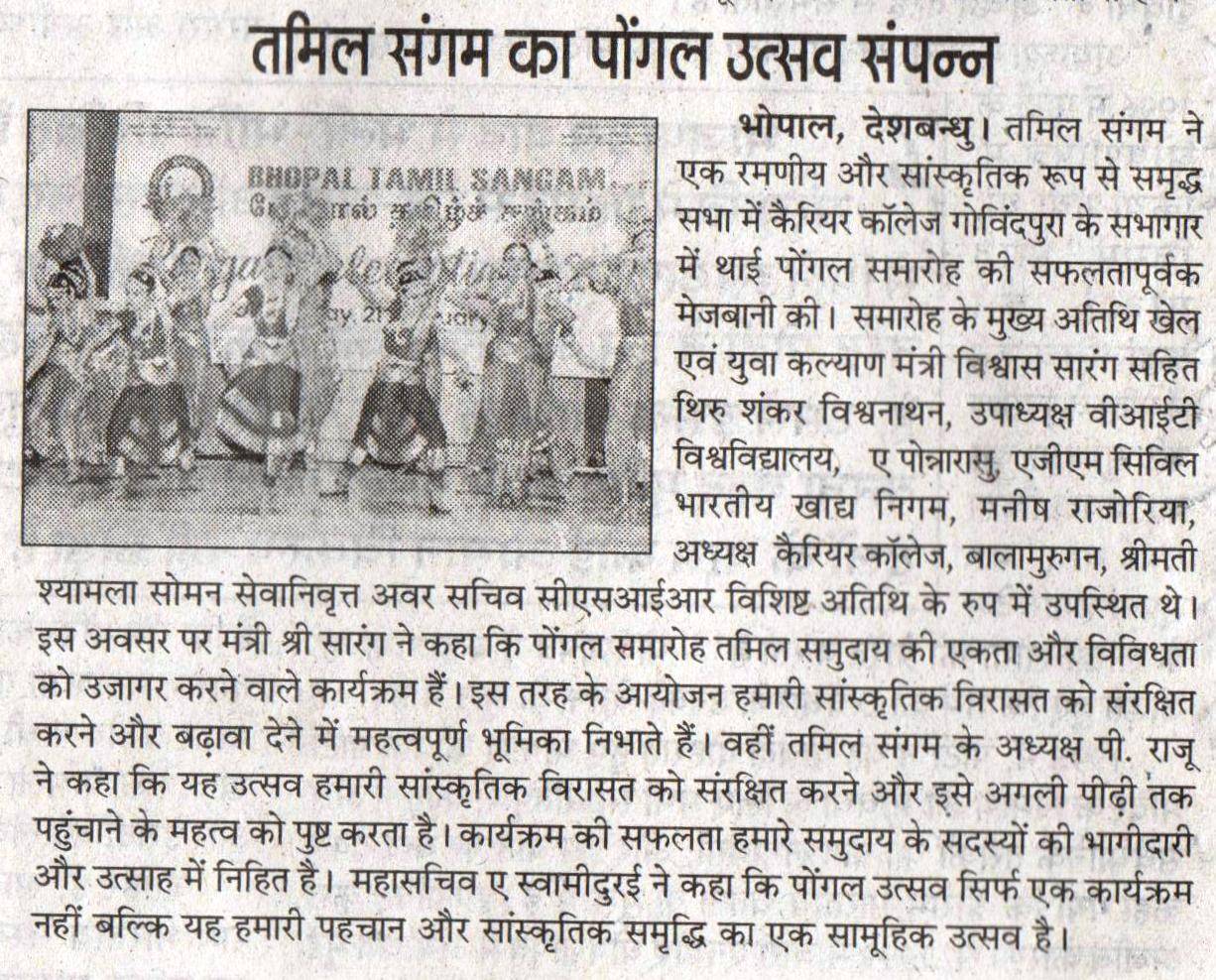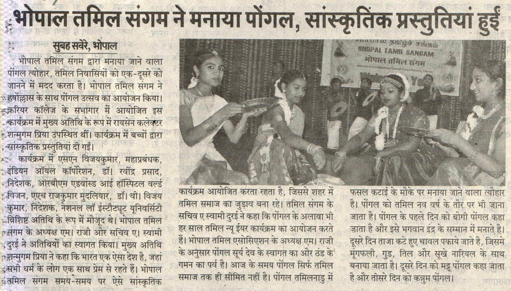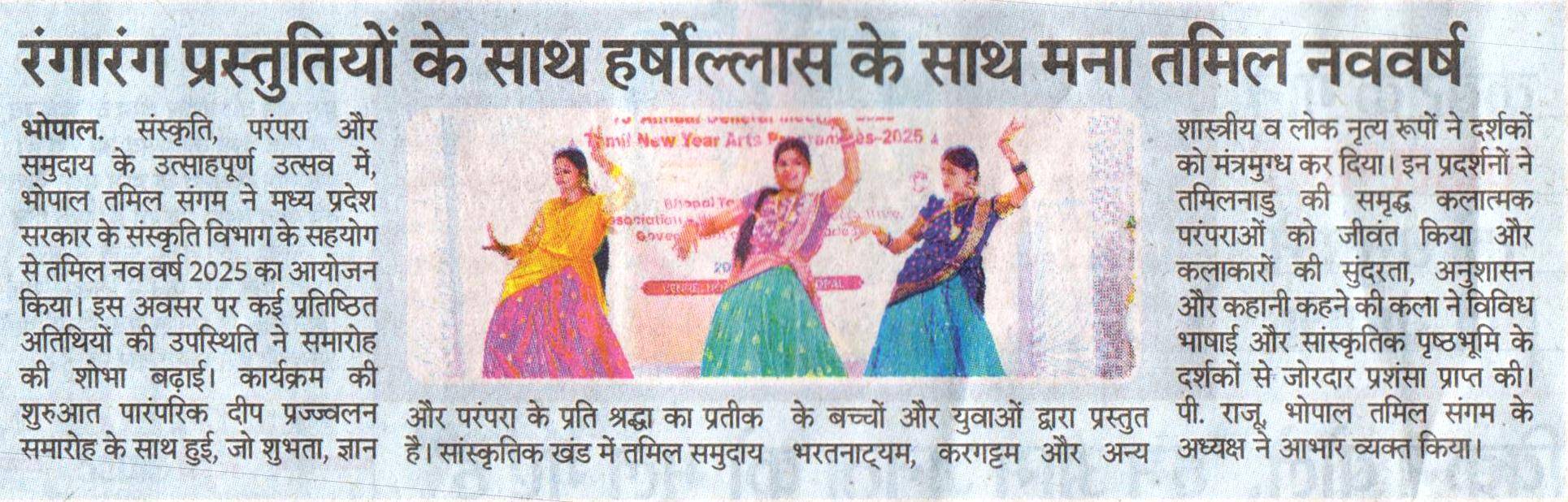ஜனவரி 19 ஆம் நாள் 2020 ஆம் ஆண்டு போபால் தமிழ்ச் சங்கம் சார்பில் பொங்கல் விழா கொண்டாடப்பட்டது. இந்த பொங்கல் விழாவில் முதன்முறையாக போபாலின் வரலாற்றில், தமிழக அரசின் சார்பாக, தமிழ்நாடு இயல் இசை நாடக மன்றத்தால் அனுப்பப்பட்டது கிராமிய கலைக்குழு. இந்தக்குழுவின் பரத கலைஞர் பரத நாட்டியம் மிகச்சிறப்பாக ஆடினார்கள். கரகாட்டம் மற்றும் கிராமிய கலை நிகழ்ச்சிகள், நடனம், பாடல் மற்றும் கலைநிகழ்ச்சிகளை மக்கள் மனதை கவரும் வகையில் மிகச் சிறப்பாக வழங்கி சிறப்பித்தனர். நடன நிகழ்ச்சி விழா அரங்கை பார்வையாளர்களின் கரவோசையால் அதிர வைத்தது, பார்வையாளர்களை மகிழ்வித்தனர். போபாலில் நடத்திய முதல், தமிழக அரசின் சார்பாக அனுப்பப்பட்ட கிராமிய கலைக்குழு சரித்திரம் நாடகம் இது. தமிழக அரசு அனுப்பிய சிறந்த கலைஞர்களை கௌரவிக்கும் வாய்ப்பும் மற்றும் வருகை தந்த அதிகாரிகளை கௌரவிக்கும் அருமையான வாய்ப்பும் போபால் தமிழ்ச் சங்கத்திற்கு கிடைத்தது.