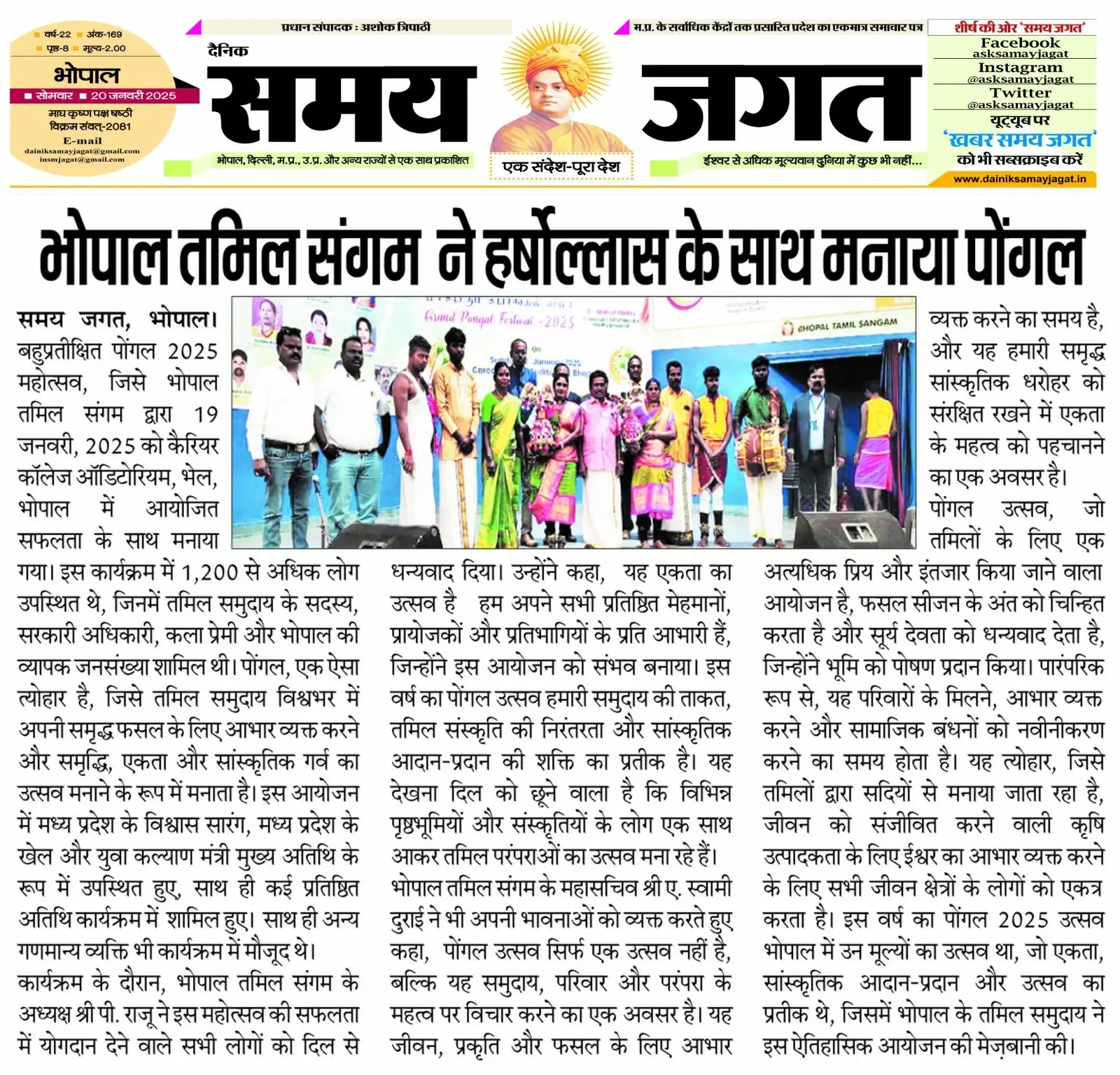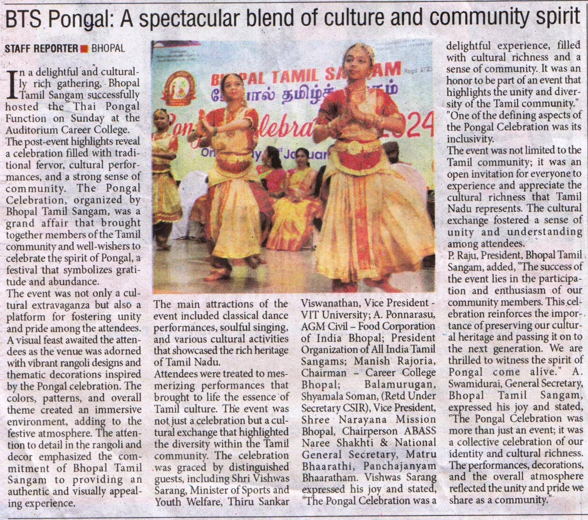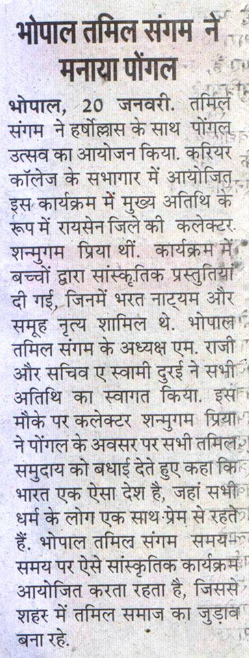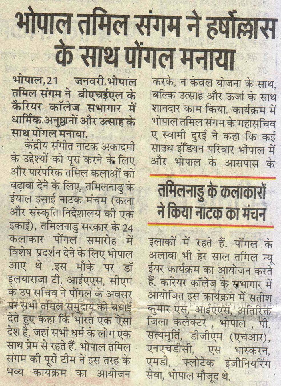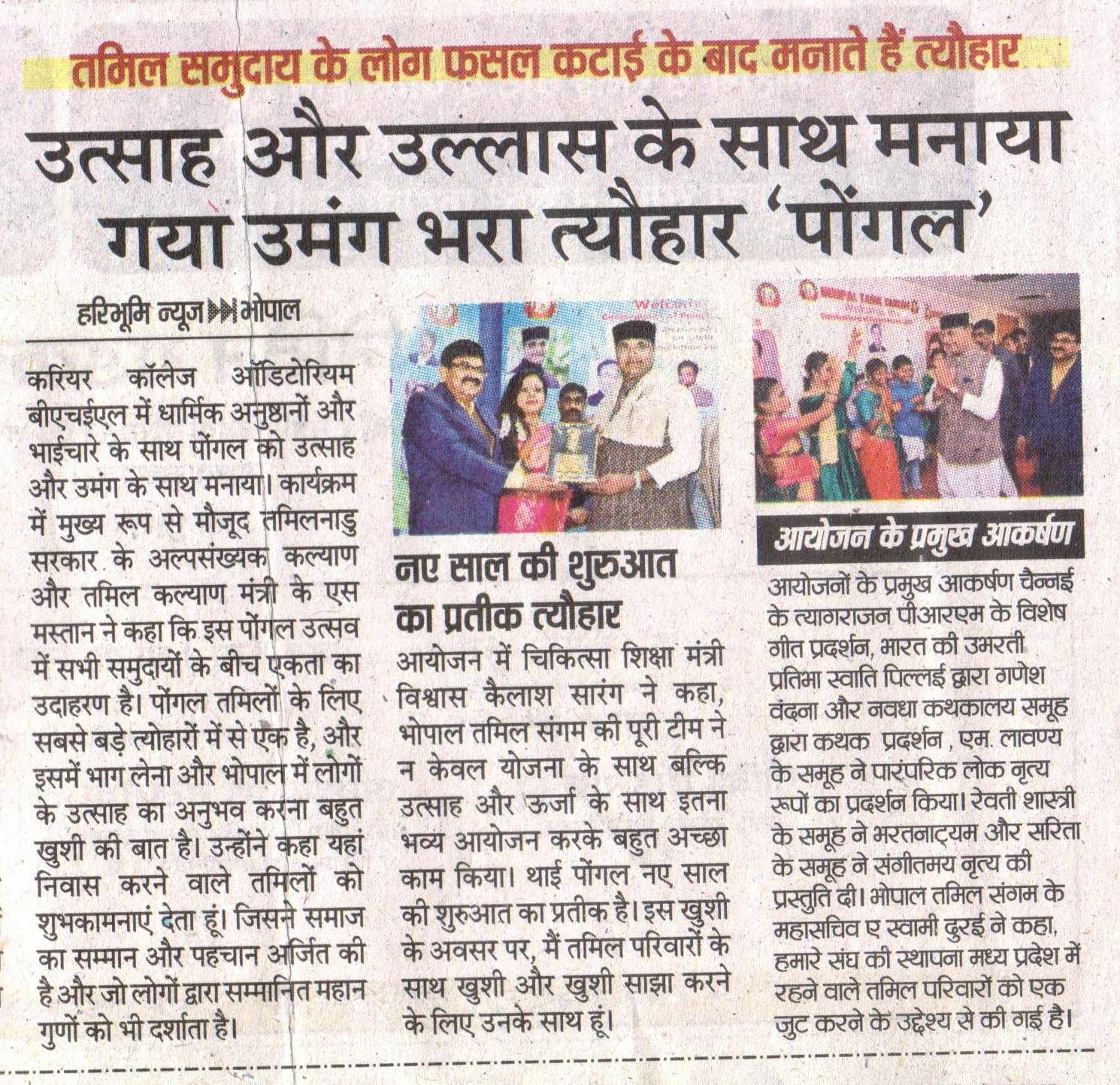 ஜனவரி 19 ஆம் நாள் 2020 ஆம் ஆண்டு போபால் தமிழ்ச் சங்கம் சார்பில் பொங்கல் விழா கொண்டாடப்பட்டது. இந்த பொங்கல் விழாவில் முதன்முறையாக போபாலின் வரலாற்றில், தமிழக அரசின் சார்பாக, தமிழ்நாடு இயல் இசை நாடக மன்றத்தால் அனுப்பப்பட்டது கிராமிய கலைக்குழு. இந்தக்குழுவின் பரத கலைஞர் பரத நாட்டியம் மிகச்சிறப்பாக ஆடினார்கள். கரகாட்டம் மற்றும் கிராமிய கலை நிகழ்ச்சிகள், நடனம், பாடல் மற்றும் கலைநிகழ்ச்சிகளை மக்கள் மனதை கவரும் வகையில் மிகச் சிறப்பாக வழங்கி சிறப்பித்தனர். நடன நிகழ்ச்சி விழா அரங்கை பார்வையாளர்களின் கரவோசையால் அதிர வைத்தது, பார்வையாளர்களை மகிழ்வித்தனர். போபாலில் நடத்திய முதல், தமிழக அரசின் சார்பாக அனுப்பப்பட்ட கிராமிய கலைக்குழு சரித்திரம் நாடகம் இது. தமிழக அரசு அனுப்பிய சிறந்த கலைஞர்களை கௌரவிக்கும் வாய்ப்பும் மற்றும் வருகை தந்த அதிகாரிகளை கௌரவிக்கும் அருமையான வாய்ப்பும் போபால் தமிழ்ச் சங்கத்திற்கு கிடைத்தது.