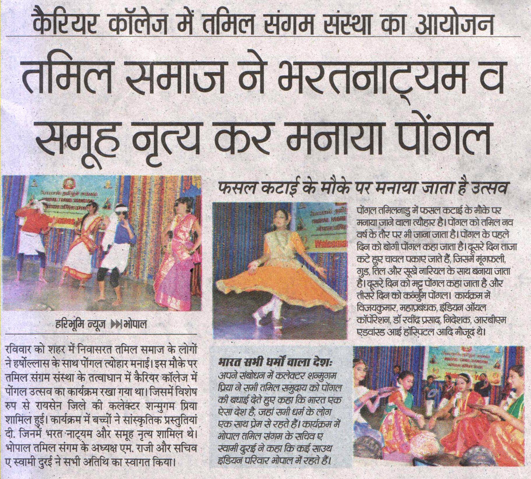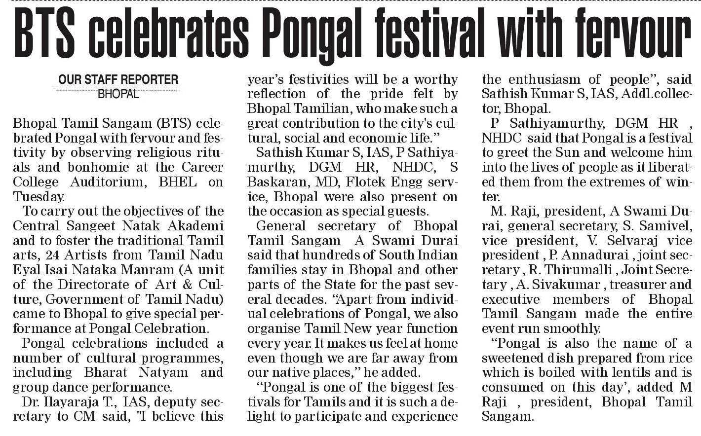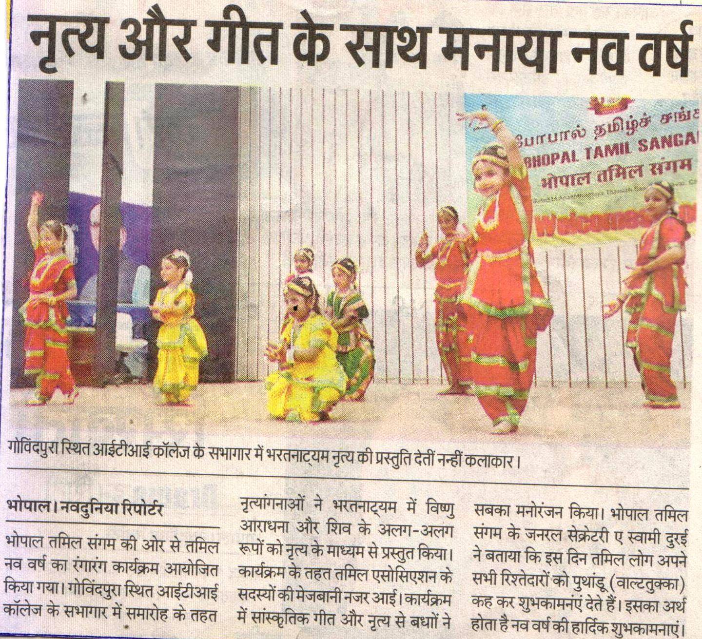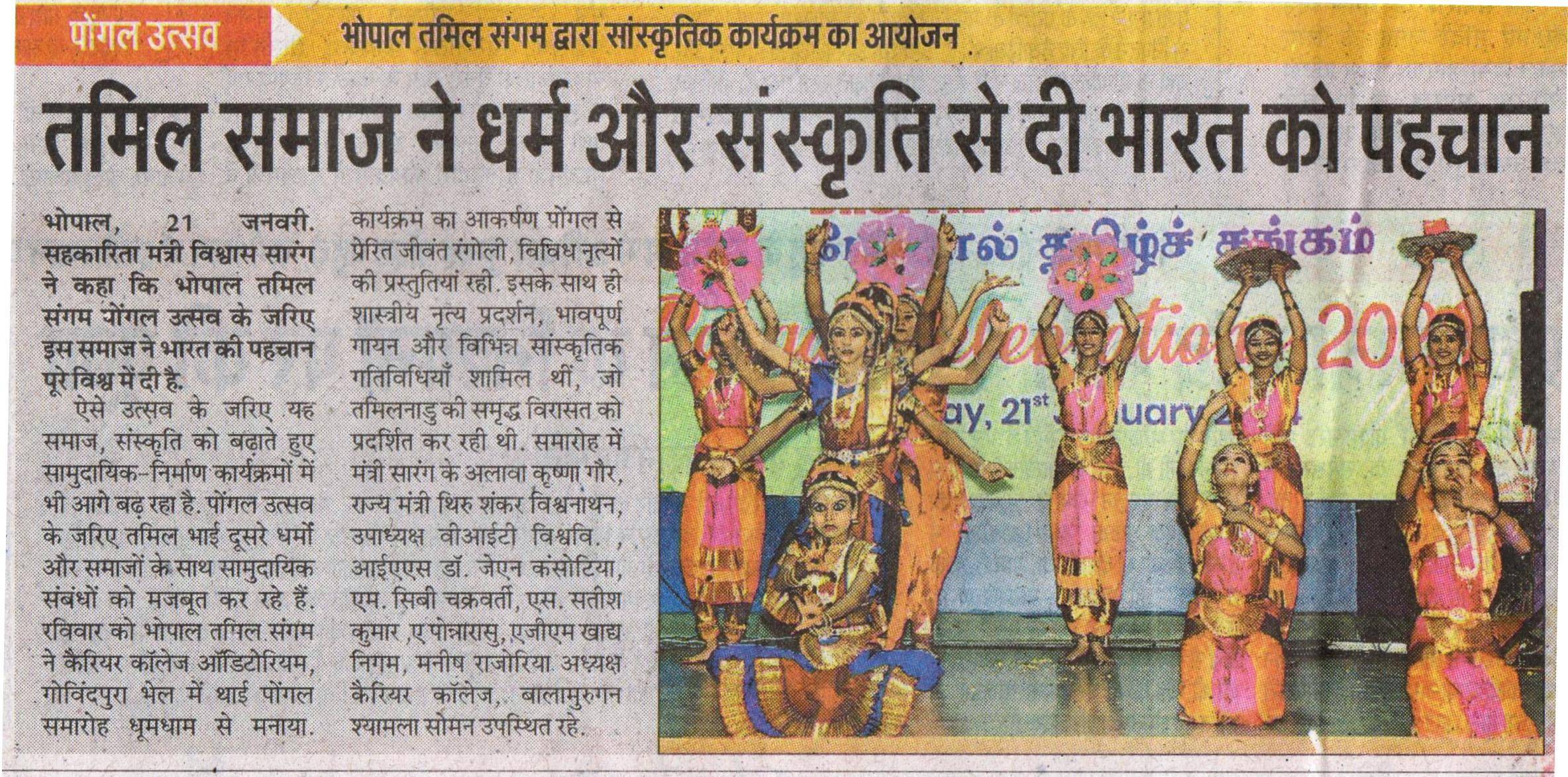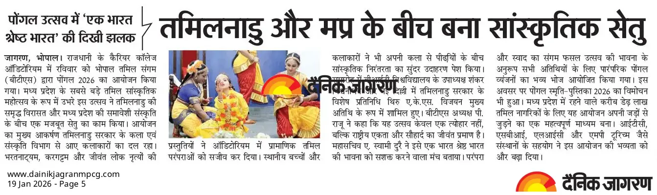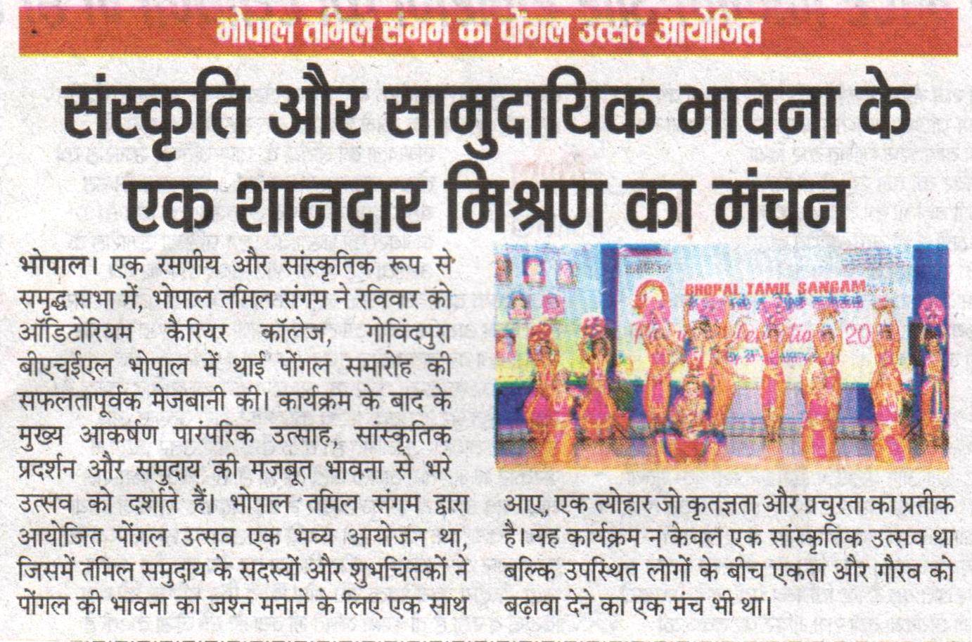 ஜனவரி 19 ஆம் நாள் 2020 ஆம் ஆண்டு போபால் தமிழ்ச் சங்கம் சார்பில் பொங்கல் விழா கொண்டாடப்பட்டது. இந்த பொங்கல் விழாவில் முதன்முறையாக போபாலின் வரலாற்றில், தமிழக அரசின் சார்பாக, தமிழ்நாடு இயல் இசை நாடக மன்றத்தால் அனுப்பப்பட்டது கிராமிய கலைக்குழு. இந்தக்குழுவின் பரத கலைஞர் பரத நாட்டியம் மிகச்சிறப்பாக ஆடினார்கள். கரகாட்டம் மற்றும் கிராமிய கலை நிகழ்ச்சிகள், நடனம், பாடல் மற்றும் கலைநிகழ்ச்சிகளை மக்கள் மனதை கவரும் வகையில் மிகச் சிறப்பாக வழங்கி சிறப்பித்தனர். நடன நிகழ்ச்சி விழா அரங்கை பார்வையாளர்களின் கரவோசையால் அதிர வைத்தது, பார்வையாளர்களை மகிழ்வித்தனர். போபாலில் நடத்திய முதல், தமிழக அரசின் சார்பாக அனுப்பப்பட்ட கிராமிய கலைக்குழு சரித்திரம் நாடகம் இது. தமிழக அரசு அனுப்பிய சிறந்த கலைஞர்களை கௌரவிக்கும் வாய்ப்பும் மற்றும் வருகை தந்த அதிகாரிகளை கௌரவிக்கும் அருமையான வாய்ப்பும் போபால் தமிழ்ச் சங்கத்திற்கு கிடைத்தது.