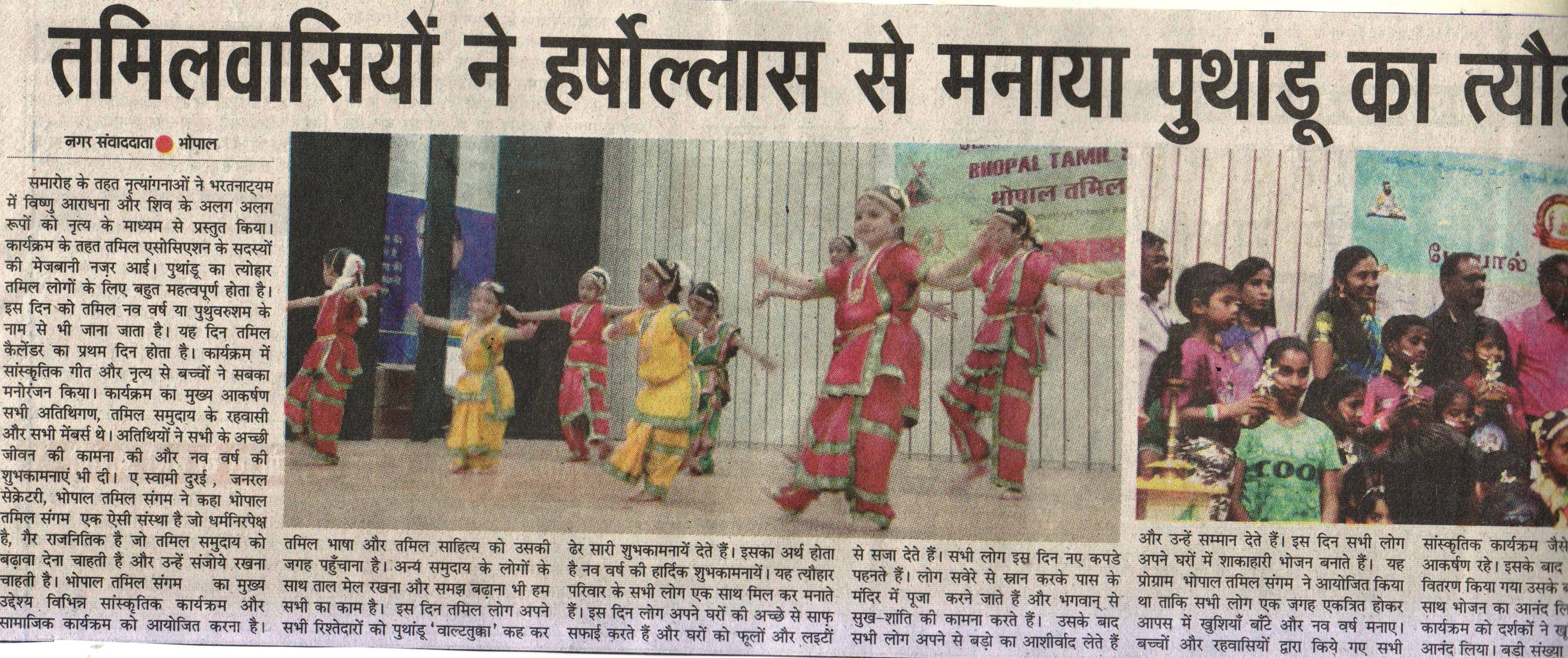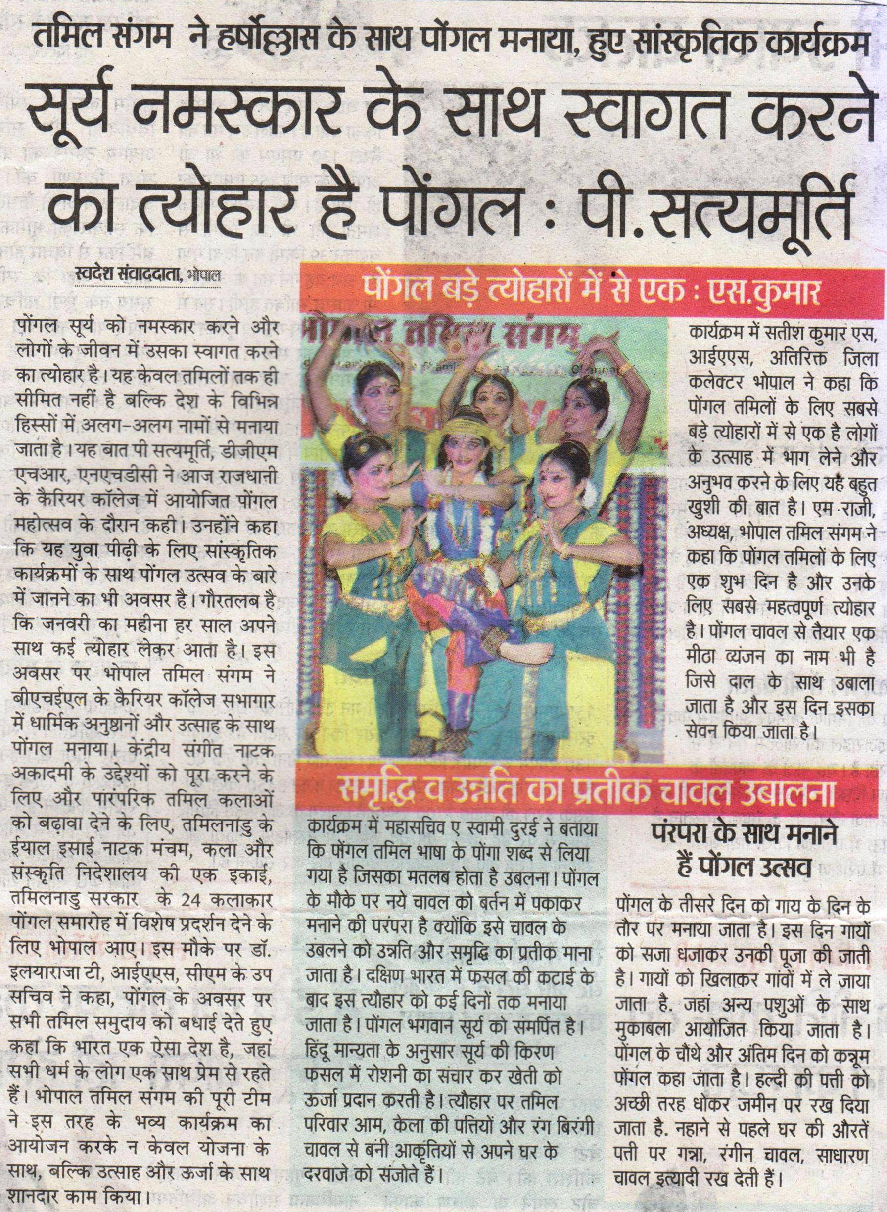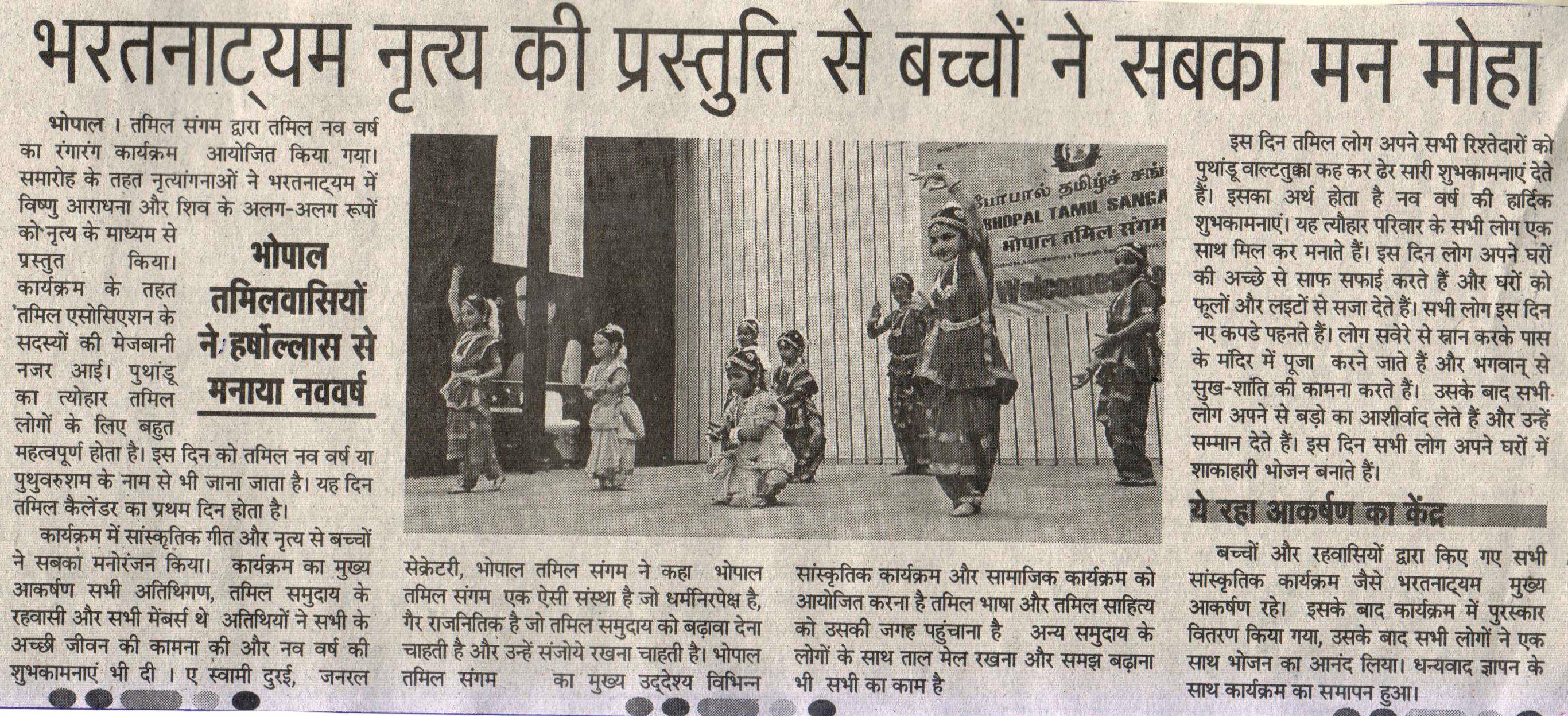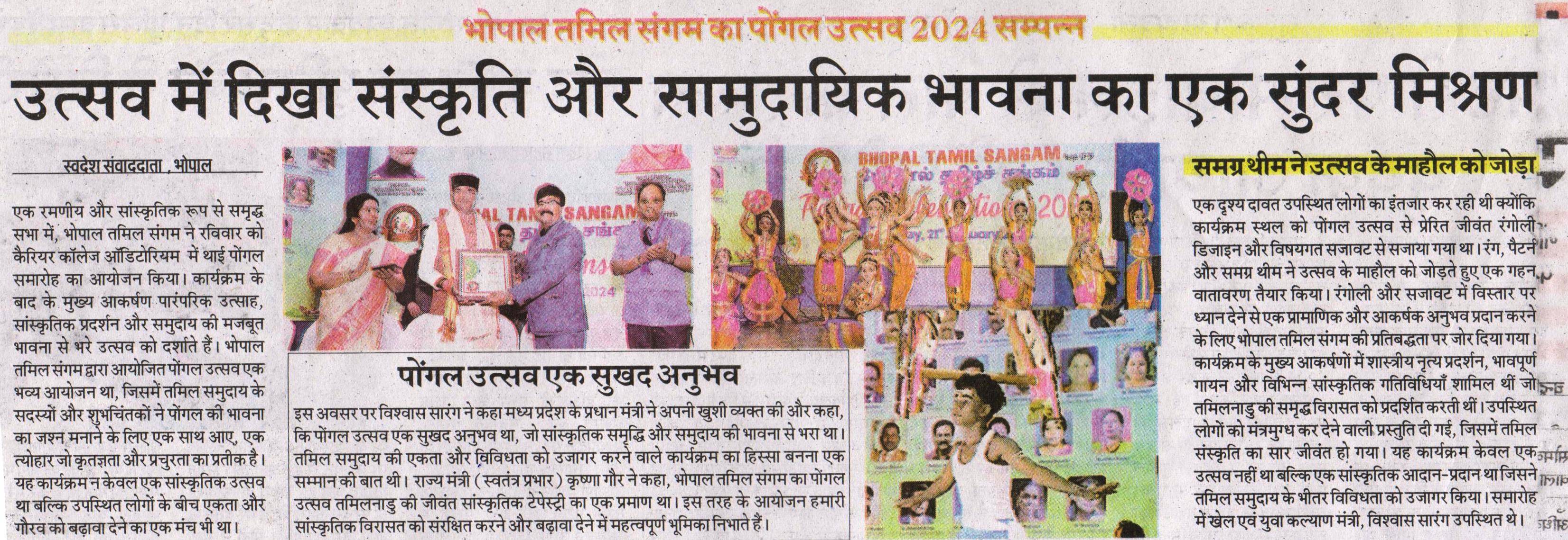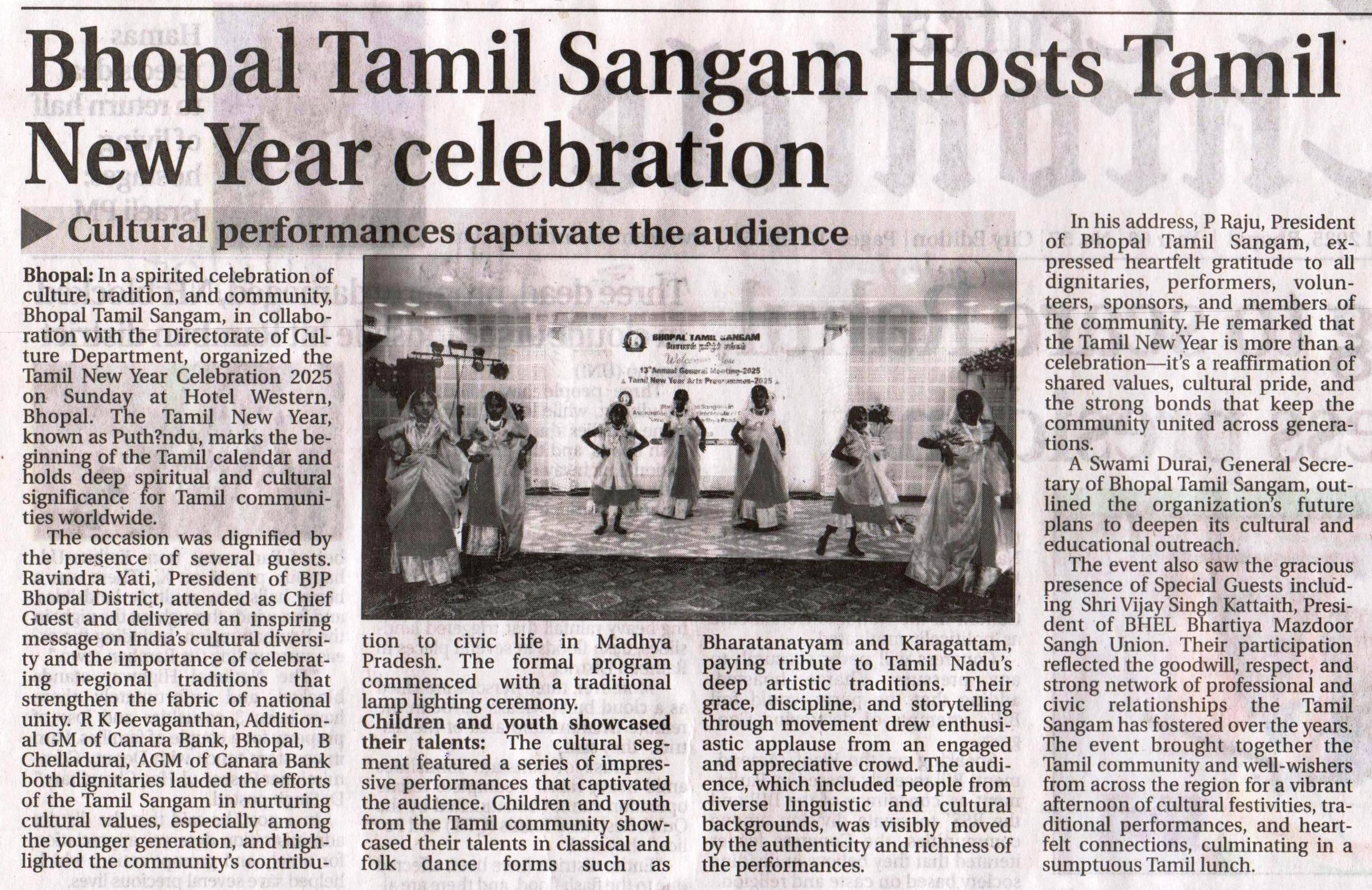 ஜனவரி 19 ஆம் நாள் 2020 ஆம் ஆண்டு போபால் தமிழ்ச் சங்கம் சார்பில் பொங்கல் விழா கொண்டாடப்பட்டது. இந்த பொங்கல் விழாவில் முதன்முறையாக போபாலின் வரலாற்றில், தமிழக அரசின் சார்பாக, தமிழ்நாடு இயல் இசை நாடக மன்றத்தால் அனுப்பப்பட்டது கிராமிய கலைக்குழு. இந்தக்குழுவின் பரத கலைஞர் பரத நாட்டியம் மிகச்சிறப்பாக ஆடினார்கள். கரகாட்டம் மற்றும் கிராமிய கலை நிகழ்ச்சிகள், நடனம், பாடல் மற்றும் கலைநிகழ்ச்சிகளை மக்கள் மனதை கவரும் வகையில் மிகச் சிறப்பாக வழங்கி சிறப்பித்தனர். நடன நிகழ்ச்சி விழா அரங்கை பார்வையாளர்களின் கரவோசையால் அதிர வைத்தது, பார்வையாளர்களை மகிழ்வித்தனர். போபாலில் நடத்திய முதல், தமிழக அரசின் சார்பாக அனுப்பப்பட்ட கிராமிய கலைக்குழு சரித்திரம் நாடகம் இது. தமிழக அரசு அனுப்பிய சிறந்த கலைஞர்களை கௌரவிக்கும் வாய்ப்பும் மற்றும் வருகை தந்த அதிகாரிகளை கௌரவிக்கும் அருமையான வாய்ப்பும் போபால் தமிழ்ச் சங்கத்திற்கு கிடைத்தது.