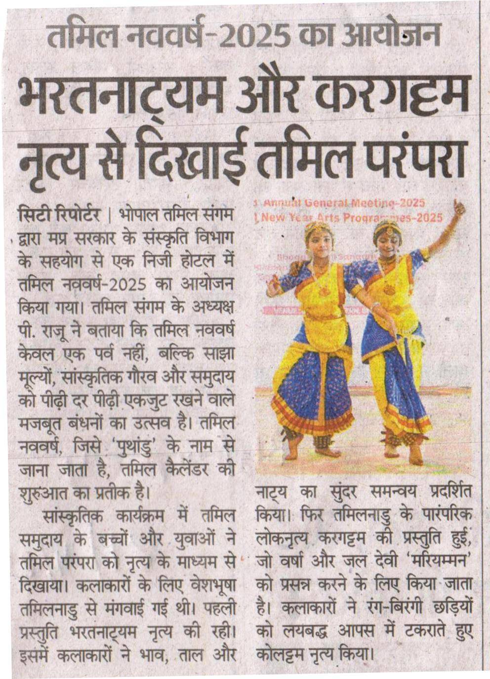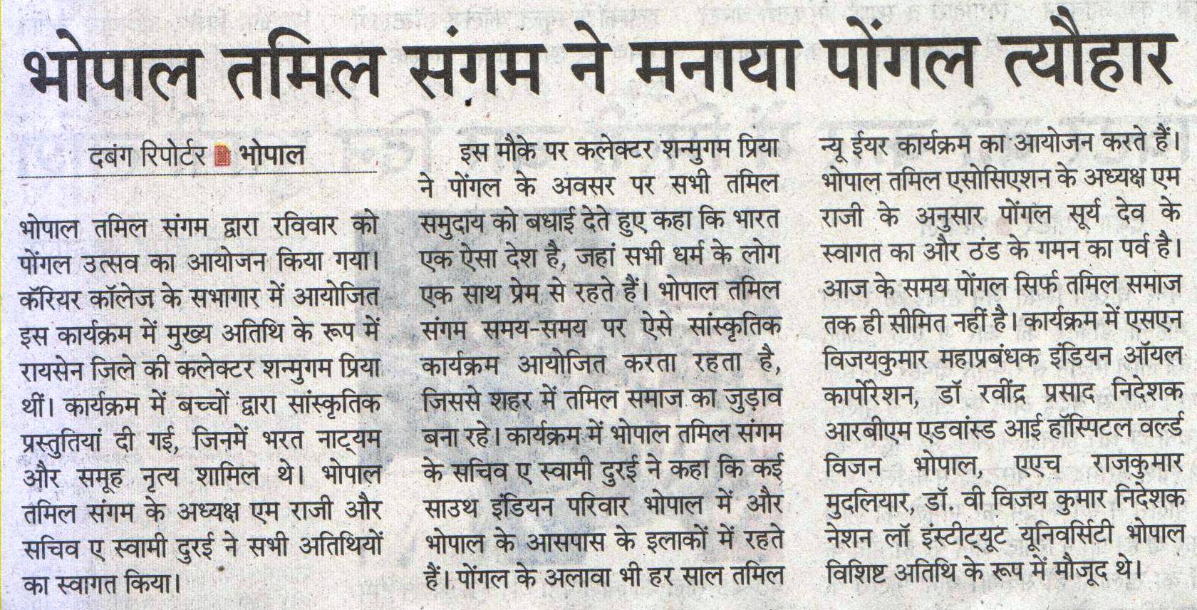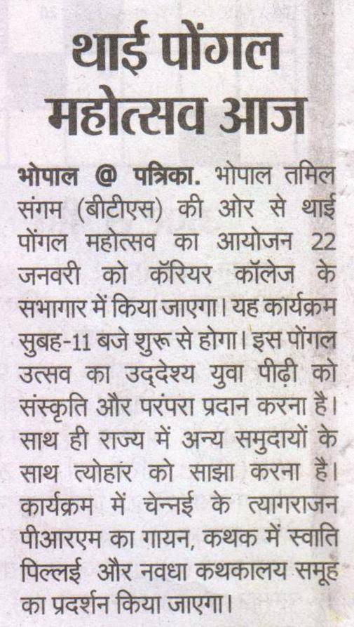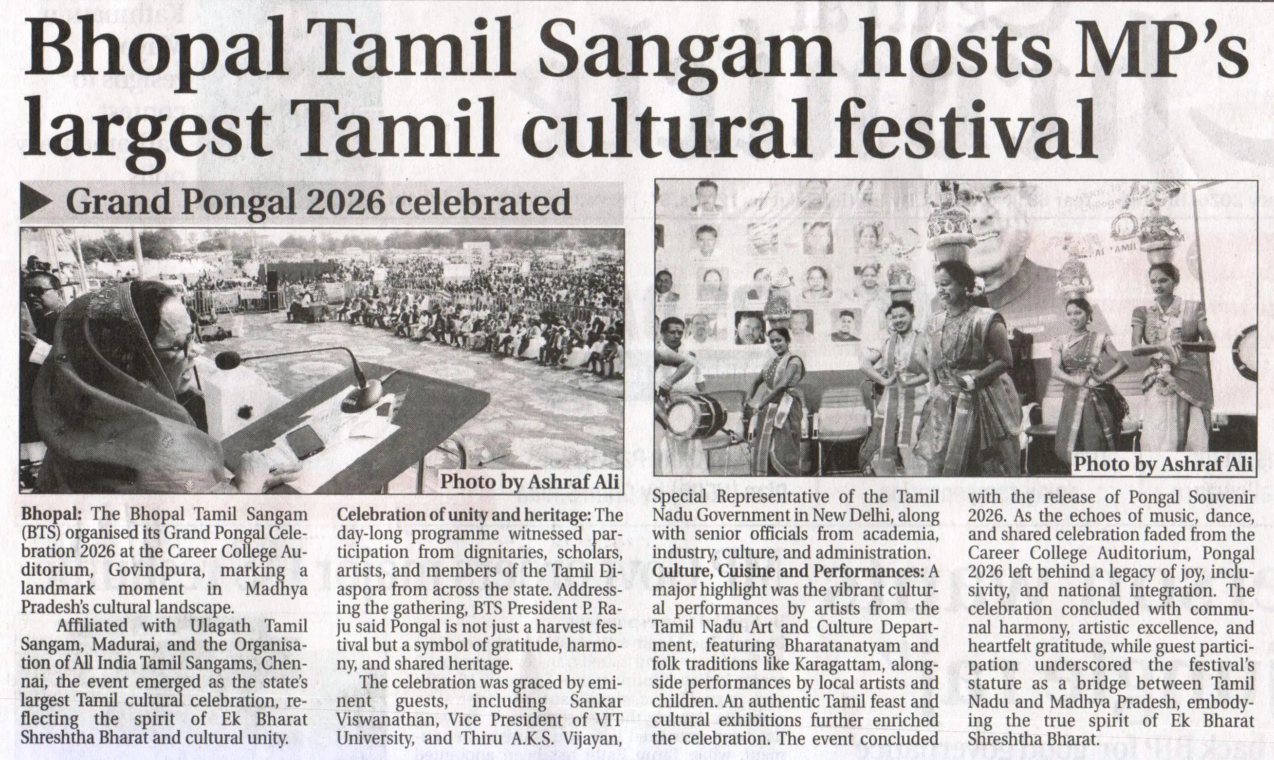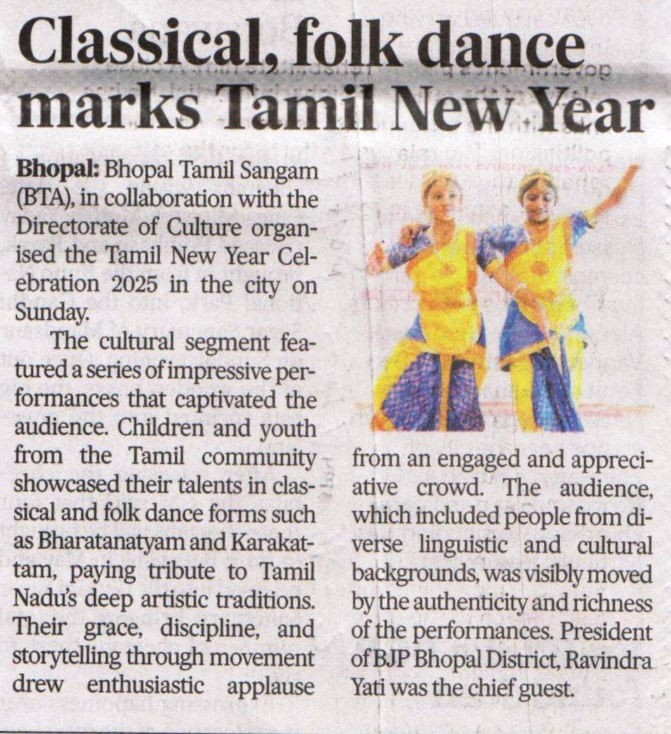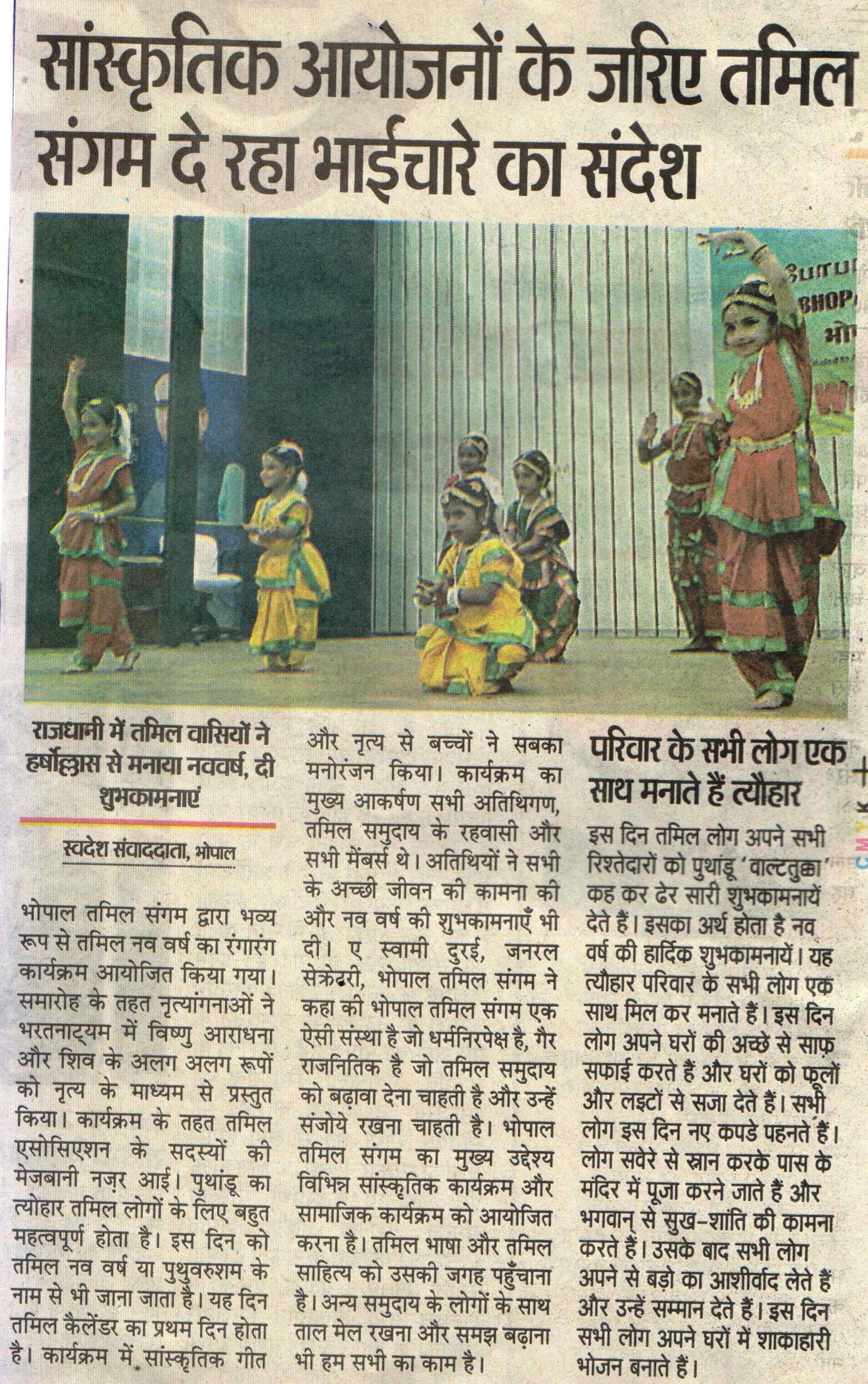 ஜனவரி 19 ஆம் நாள் 2020 ஆம் ஆண்டு போபால் தமிழ்ச் சங்கம் சார்பில் பொங்கல் விழா கொண்டாடப்பட்டது. இந்த பொங்கல் விழாவில் முதன்முறையாக போபாலின் வரலாற்றில், தமிழக அரசின் சார்பாக, தமிழ்நாடு இயல் இசை நாடக மன்றத்தால் அனுப்பப்பட்டது கிராமிய கலைக்குழு. இந்தக்குழுவின் பரத கலைஞர் பரத நாட்டியம் மிகச்சிறப்பாக ஆடினார்கள். கரகாட்டம் மற்றும் கிராமிய கலை நிகழ்ச்சிகள், நடனம், பாடல் மற்றும் கலைநிகழ்ச்சிகளை மக்கள் மனதை கவரும் வகையில் மிகச் சிறப்பாக வழங்கி சிறப்பித்தனர். நடன நிகழ்ச்சி விழா அரங்கை பார்வையாளர்களின் கரவோசையால் அதிர வைத்தது, பார்வையாளர்களை மகிழ்வித்தனர். போபாலில் நடத்திய முதல், தமிழக அரசின் சார்பாக அனுப்பப்பட்ட கிராமிய கலைக்குழு சரித்திரம் நாடகம் இது. தமிழக அரசு அனுப்பிய சிறந்த கலைஞர்களை கௌரவிக்கும் வாய்ப்பும் மற்றும் வருகை தந்த அதிகாரிகளை கௌரவிக்கும் அருமையான வாய்ப்பும் போபால் தமிழ்ச் சங்கத்திற்கு கிடைத்தது.