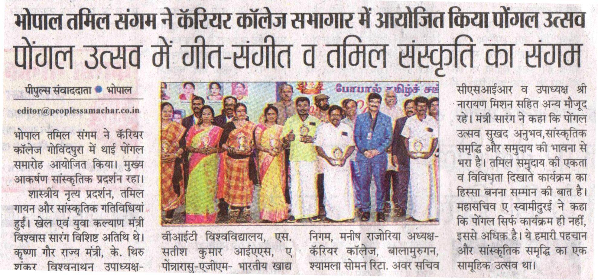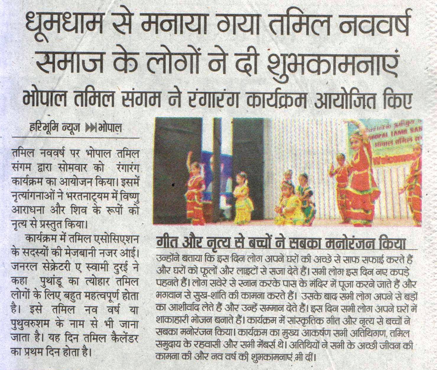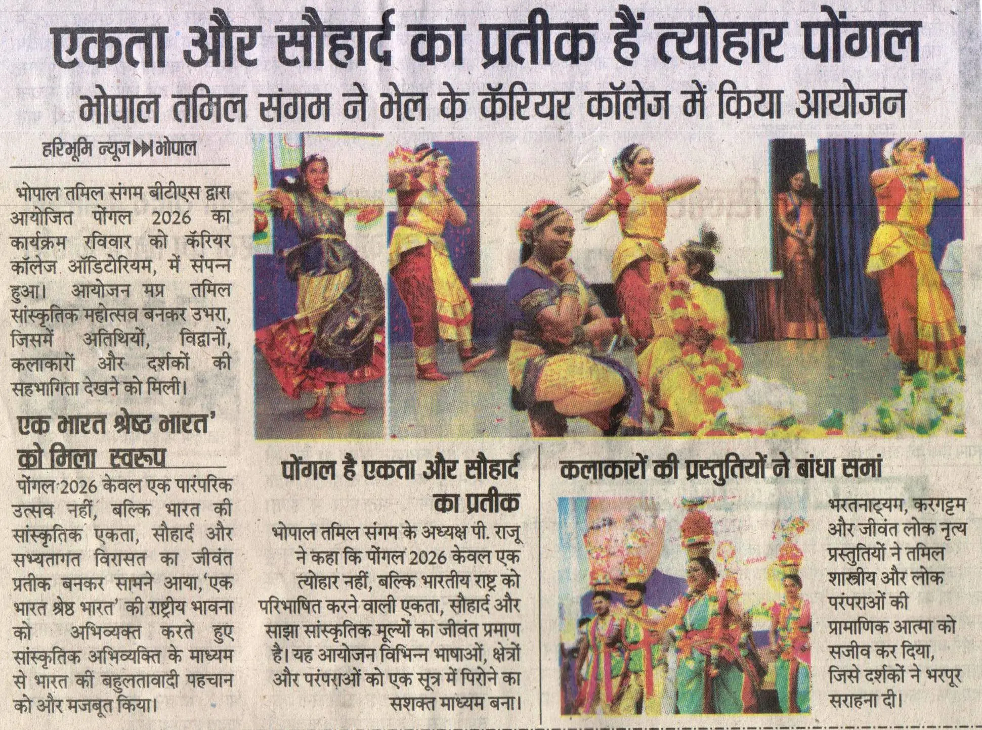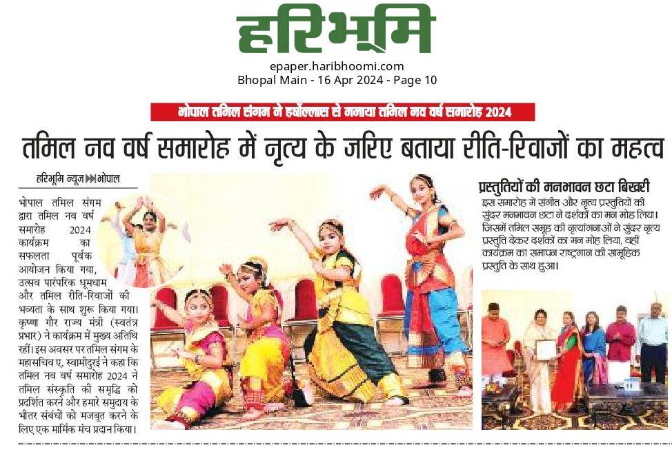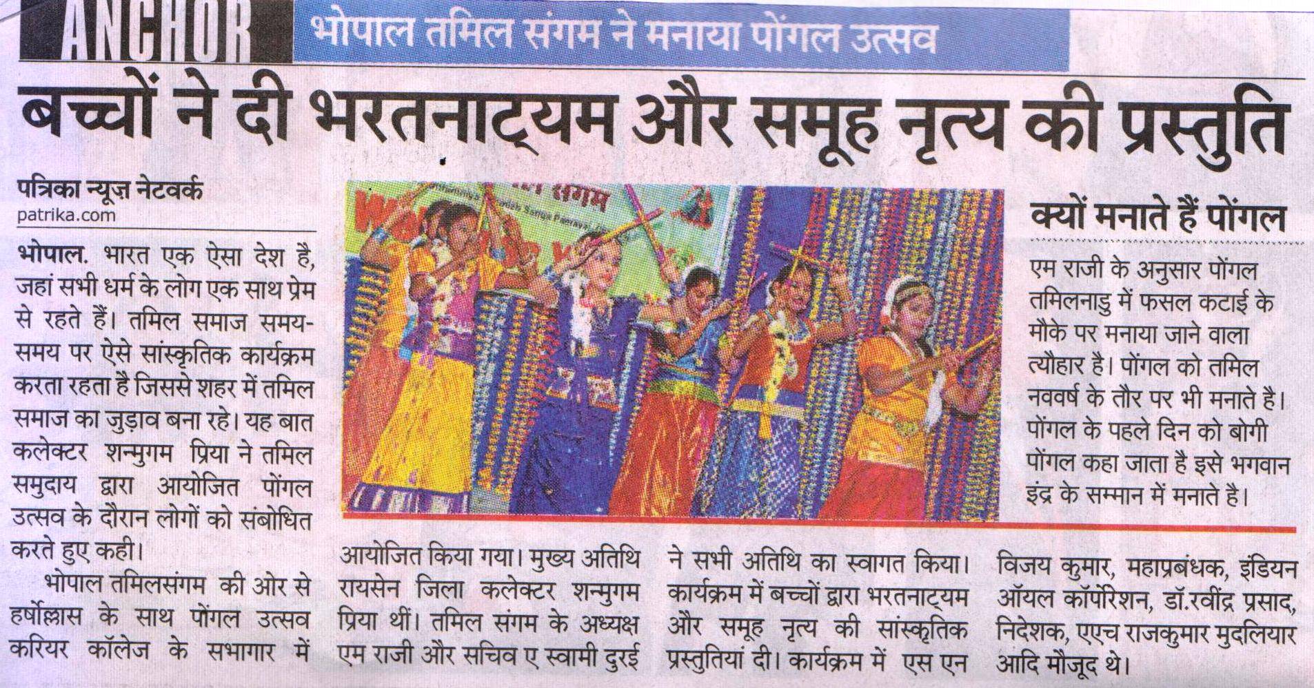 ஜனவரி 19 ஆம் நாள் 2020 ஆம் ஆண்டு போபால் தமிழ்ச் சங்கம் சார்பில் பொங்கல் விழா கொண்டாடப்பட்டது. இந்த பொங்கல் விழாவில் முதன்முறையாக போபாலின் வரலாற்றில், தமிழக அரசின் சார்பாக, தமிழ்நாடு இயல் இசை நாடக மன்றத்தால் அனுப்பப்பட்டது கிராமிய கலைக்குழு. இந்தக்குழுவின் பரத கலைஞர் பரத நாட்டியம் மிகச்சிறப்பாக ஆடினார்கள். கரகாட்டம் மற்றும் கிராமிய கலை நிகழ்ச்சிகள், நடனம், பாடல் மற்றும் கலைநிகழ்ச்சிகளை மக்கள் மனதை கவரும் வகையில் மிகச் சிறப்பாக வழங்கி சிறப்பித்தனர். நடன நிகழ்ச்சி விழா அரங்கை பார்வையாளர்களின் கரவோசையால் அதிர வைத்தது, பார்வையாளர்களை மகிழ்வித்தனர். போபாலில் நடத்திய முதல், தமிழக அரசின் சார்பாக அனுப்பப்பட்ட கிராமிய கலைக்குழு சரித்திரம் நாடகம் இது. தமிழக அரசு அனுப்பிய சிறந்த கலைஞர்களை கௌரவிக்கும் வாய்ப்பும் மற்றும் வருகை தந்த அதிகாரிகளை கௌரவிக்கும் அருமையான வாய்ப்பும் போபால் தமிழ்ச் சங்கத்திற்கு கிடைத்தது.