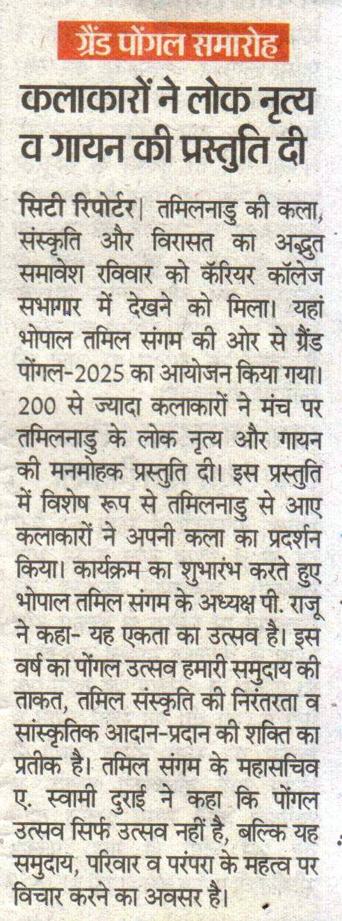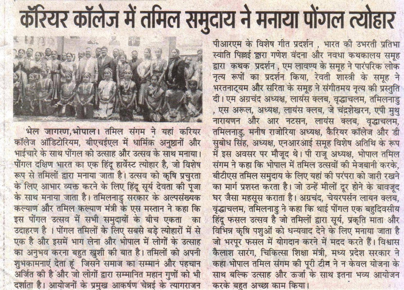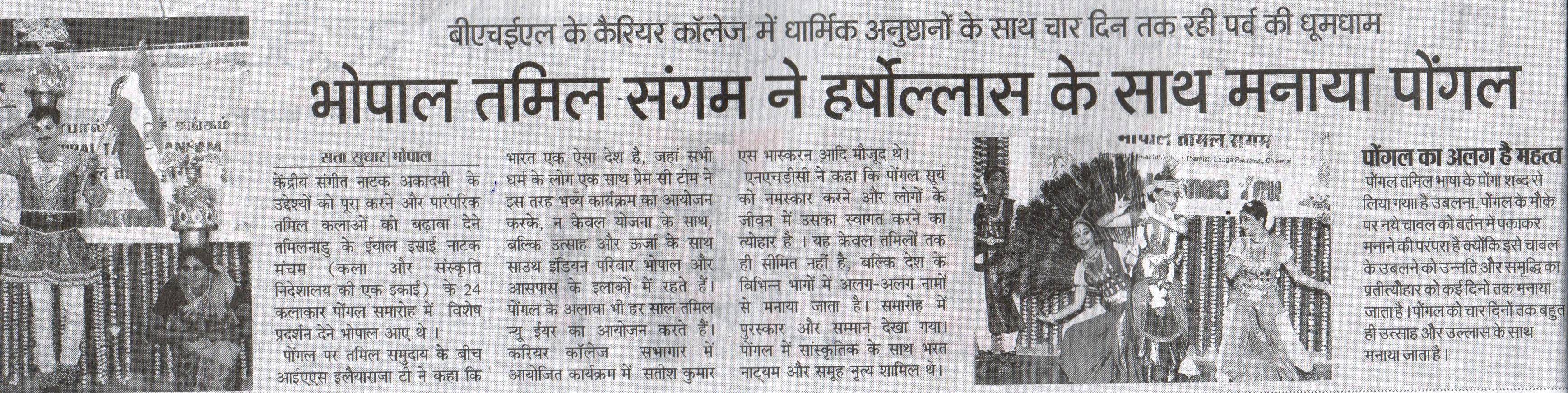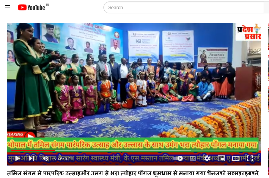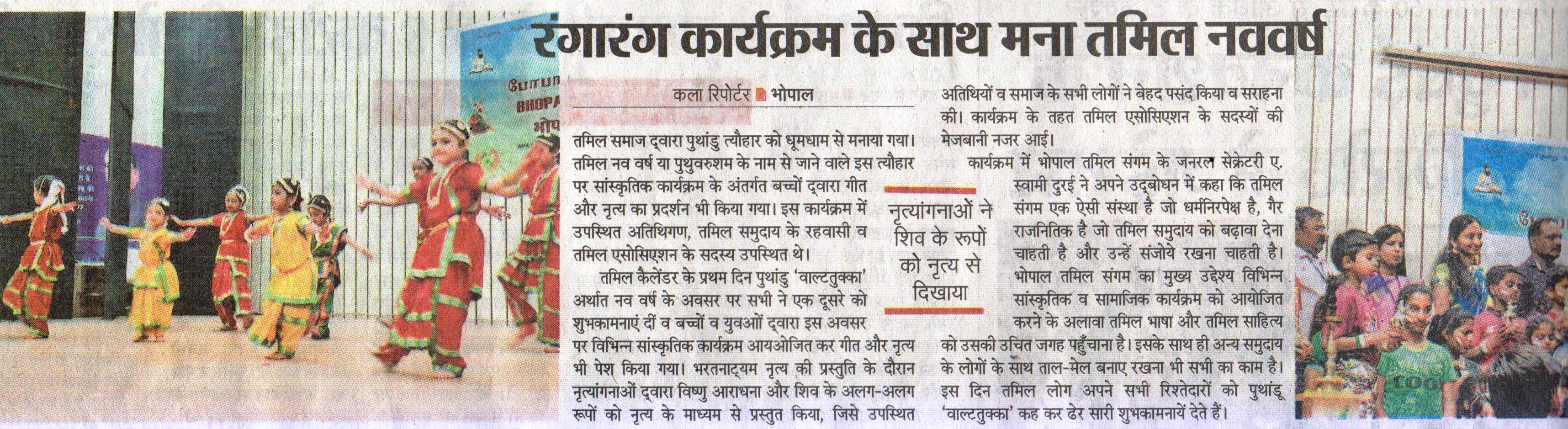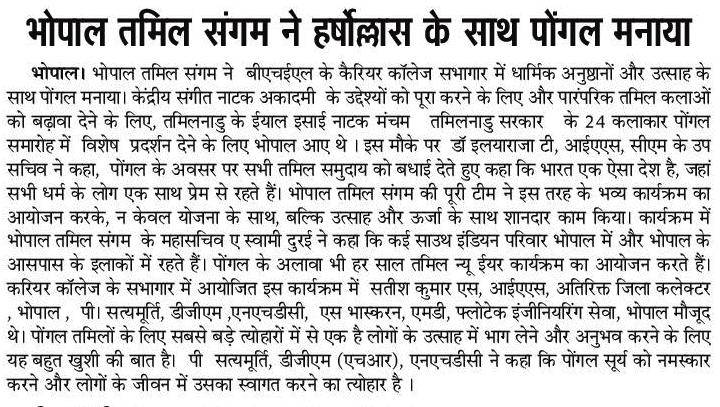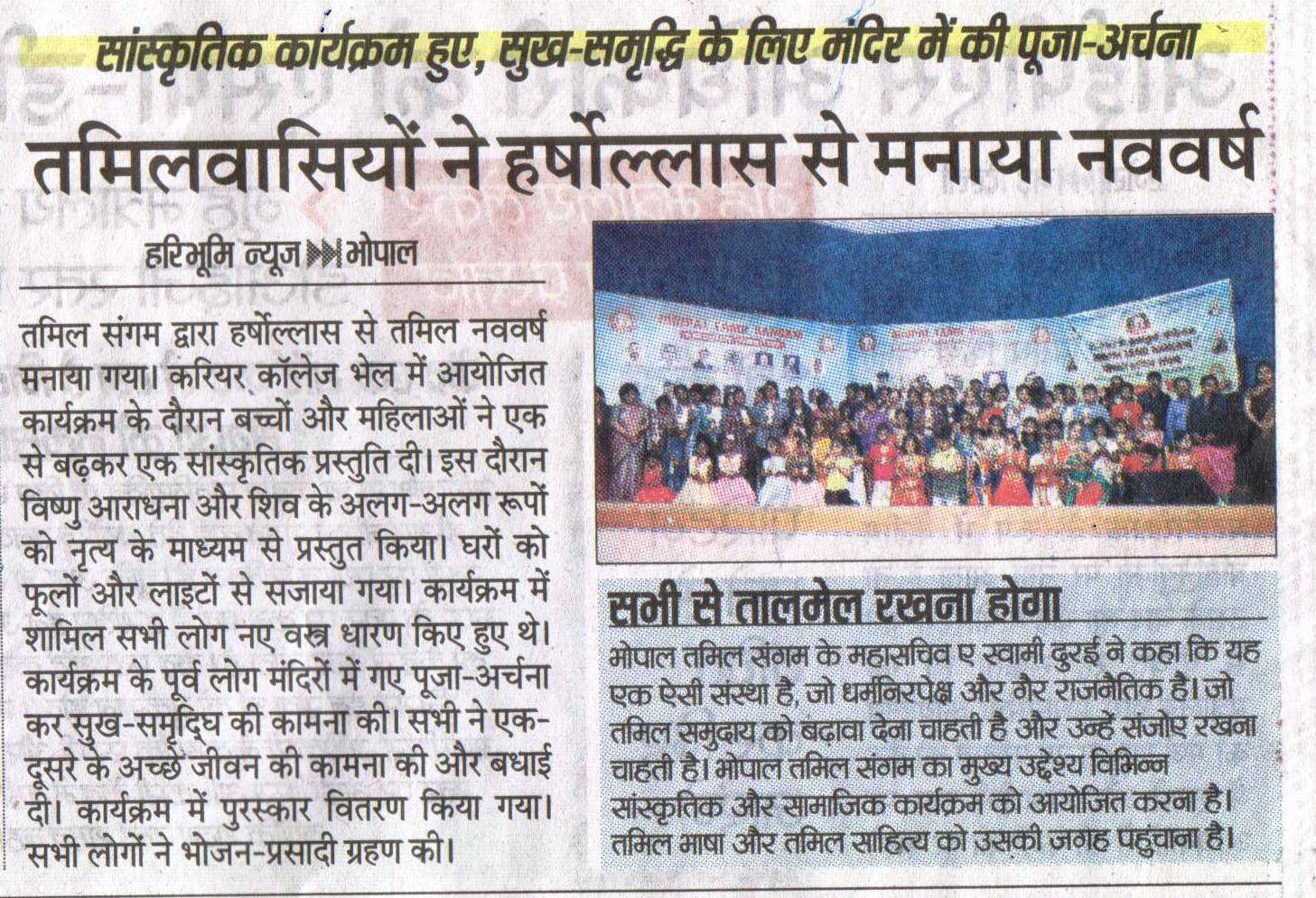 ஜனவரி 19 ஆம் நாள் 2020 ஆம் ஆண்டு போபால் தமிழ்ச் சங்கம் சார்பில் பொங்கல் விழா கொண்டாடப்பட்டது. இந்த பொங்கல் விழாவில் முதன்முறையாக போபாலின் வரலாற்றில், தமிழக அரசின் சார்பாக, தமிழ்நாடு இயல் இசை நாடக மன்றத்தால் அனுப்பப்பட்டது கிராமிய கலைக்குழு. இந்தக்குழுவின் பரத கலைஞர் பரத நாட்டியம் மிகச்சிறப்பாக ஆடினார்கள். கரகாட்டம் மற்றும் கிராமிய கலை நிகழ்ச்சிகள், நடனம், பாடல் மற்றும் கலைநிகழ்ச்சிகளை மக்கள் மனதை கவரும் வகையில் மிகச் சிறப்பாக வழங்கி சிறப்பித்தனர். நடன நிகழ்ச்சி விழா அரங்கை பார்வையாளர்களின் கரவோசையால் அதிர வைத்தது, பார்வையாளர்களை மகிழ்வித்தனர். போபாலில் நடத்திய முதல், தமிழக அரசின் சார்பாக அனுப்பப்பட்ட கிராமிய கலைக்குழு சரித்திரம் நாடகம் இது. தமிழக அரசு அனுப்பிய சிறந்த கலைஞர்களை கௌரவிக்கும் வாய்ப்பும் மற்றும் வருகை தந்த அதிகாரிகளை கௌரவிக்கும் அருமையான வாய்ப்பும் போபால் தமிழ்ச் சங்கத்திற்கு கிடைத்தது.