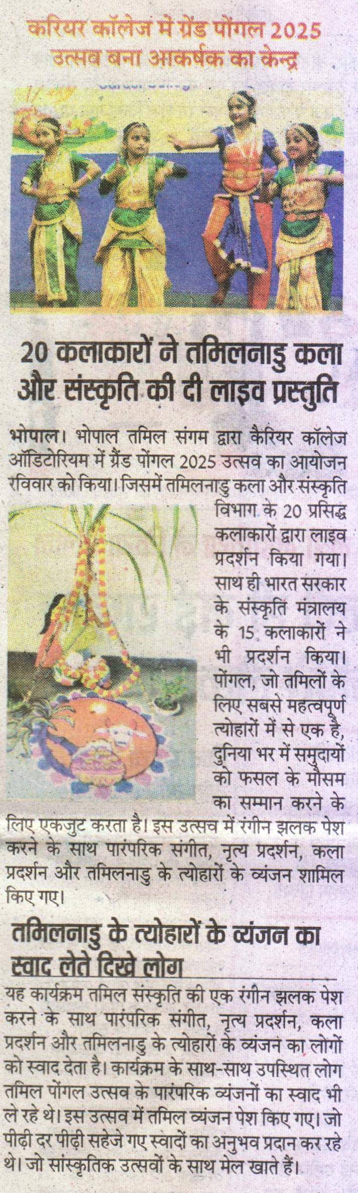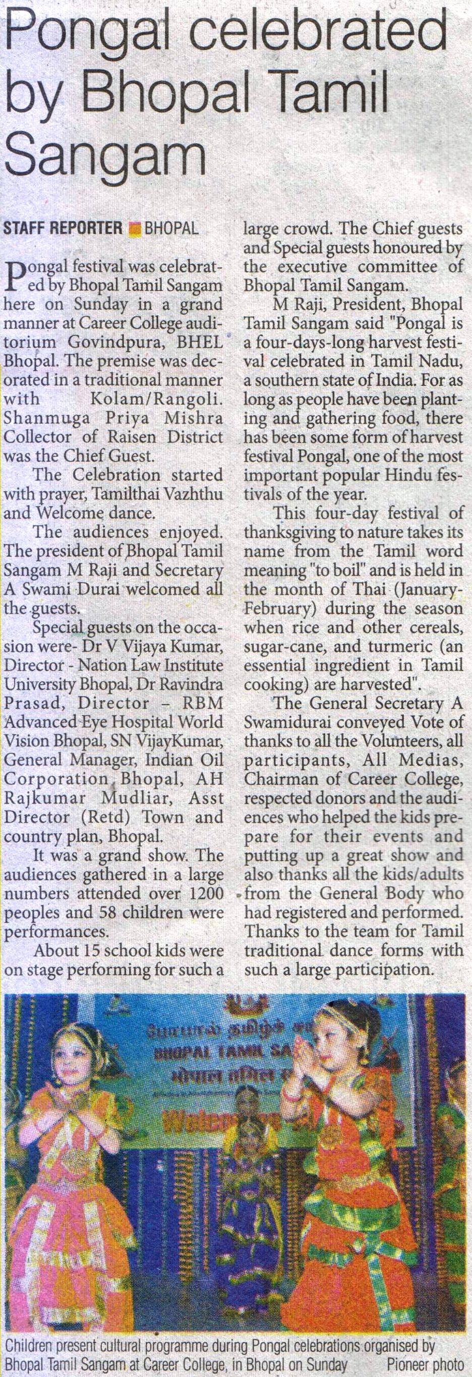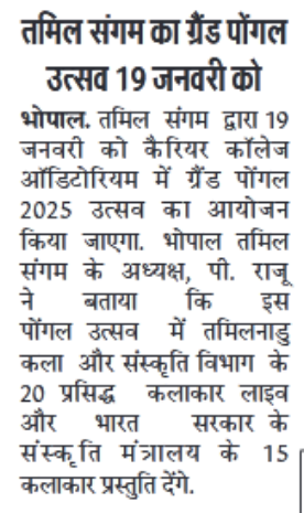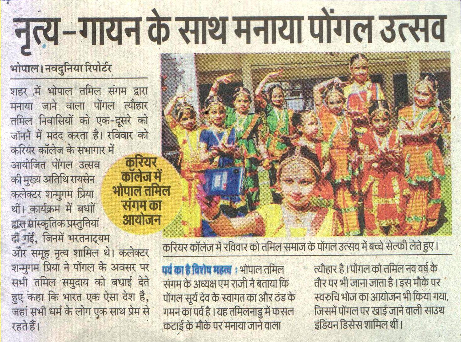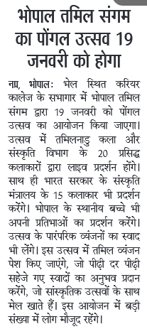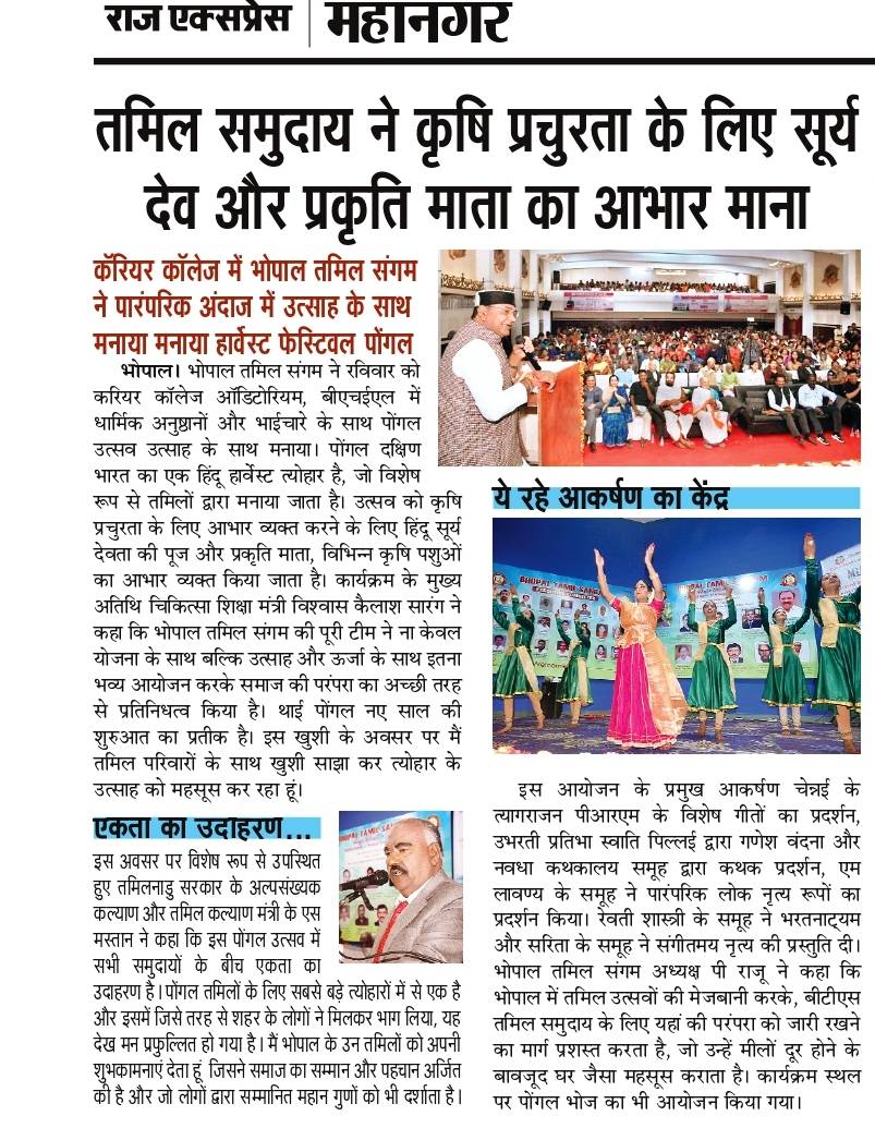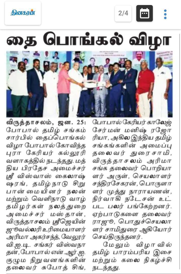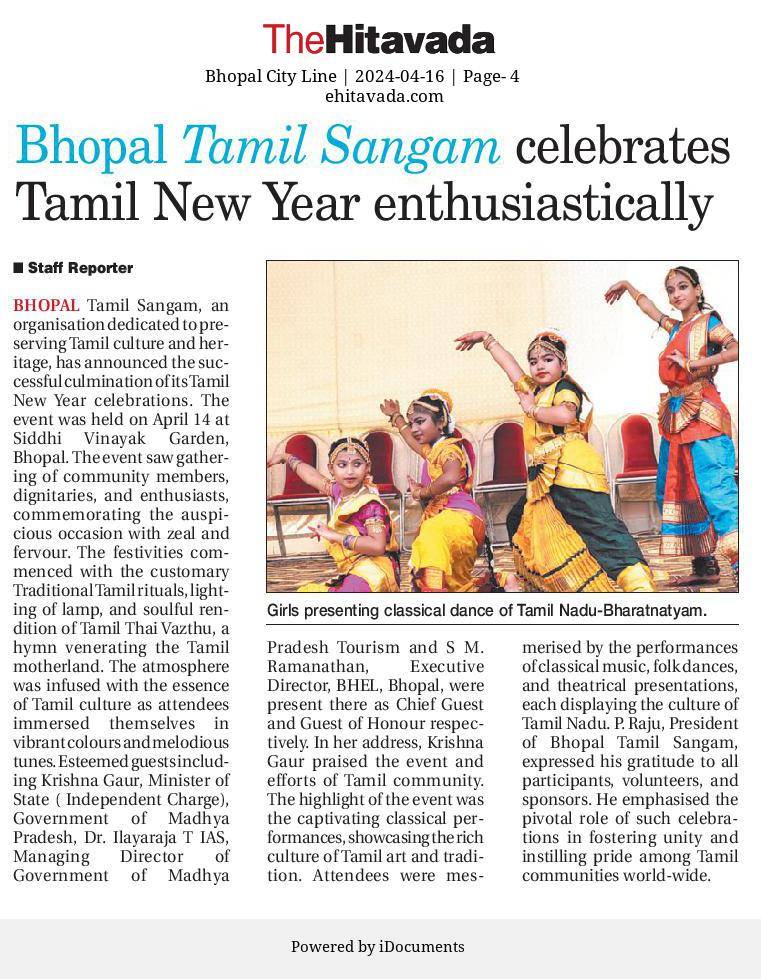 ஜனவரி 19 ஆம் நாள் 2020 ஆம் ஆண்டு போபால் தமிழ்ச் சங்கம் சார்பில் பொங்கல் விழா கொண்டாடப்பட்டது. இந்த பொங்கல் விழாவில் முதன்முறையாக போபாலின் வரலாற்றில், தமிழக அரசின் சார்பாக, தமிழ்நாடு இயல் இசை நாடக மன்றத்தால் அனுப்பப்பட்டது கிராமிய கலைக்குழு. இந்தக்குழுவின் பரத கலைஞர் பரத நாட்டியம் மிகச்சிறப்பாக ஆடினார்கள். கரகாட்டம் மற்றும் கிராமிய கலை நிகழ்ச்சிகள், நடனம், பாடல் மற்றும் கலைநிகழ்ச்சிகளை மக்கள் மனதை கவரும் வகையில் மிகச் சிறப்பாக வழங்கி சிறப்பித்தனர். நடன நிகழ்ச்சி விழா அரங்கை பார்வையாளர்களின் கரவோசையால் அதிர வைத்தது, பார்வையாளர்களை மகிழ்வித்தனர். போபாலில் நடத்திய முதல், தமிழக அரசின் சார்பாக அனுப்பப்பட்ட கிராமிய கலைக்குழு சரித்திரம் நாடகம் இது. தமிழக அரசு அனுப்பிய சிறந்த கலைஞர்களை கௌரவிக்கும் வாய்ப்பும் மற்றும் வருகை தந்த அதிகாரிகளை கௌரவிக்கும் அருமையான வாய்ப்பும் போபால் தமிழ்ச் சங்கத்திற்கு கிடைத்தது.