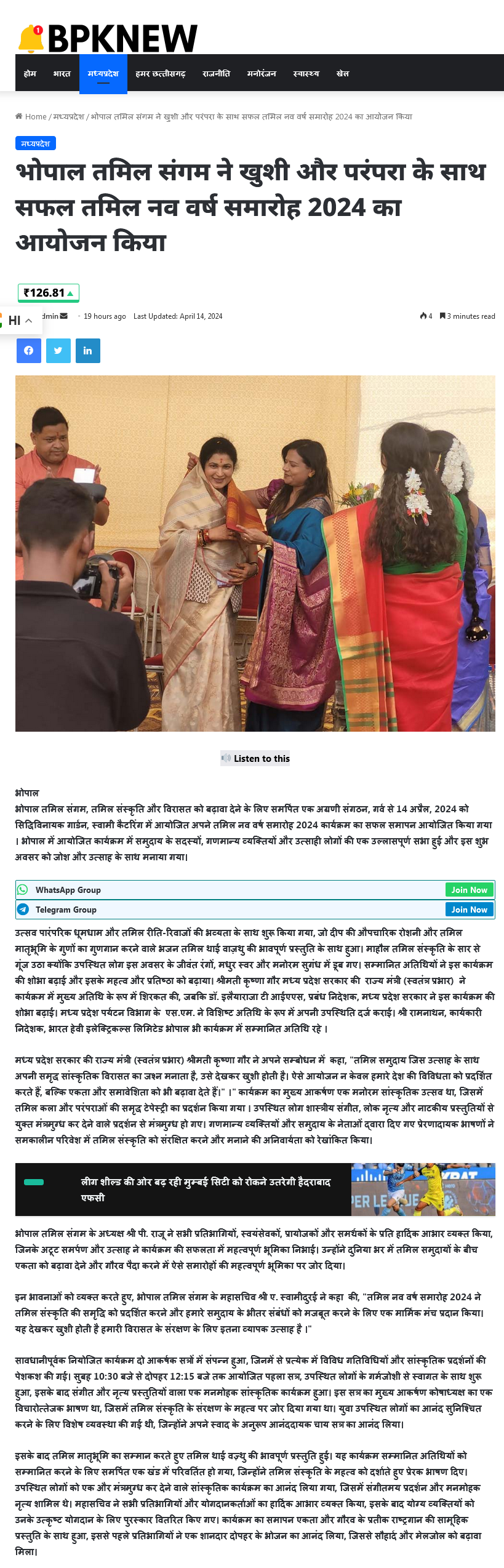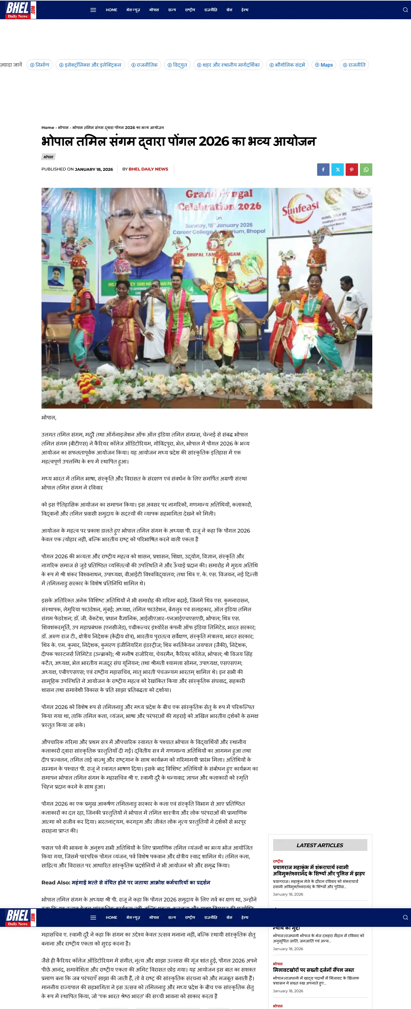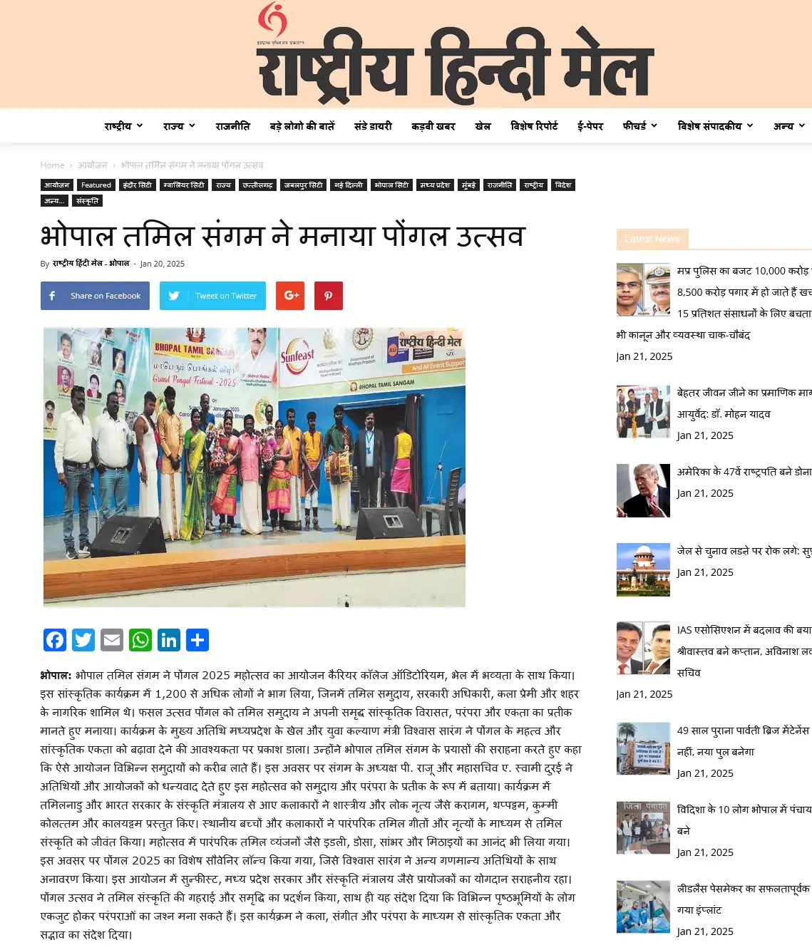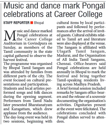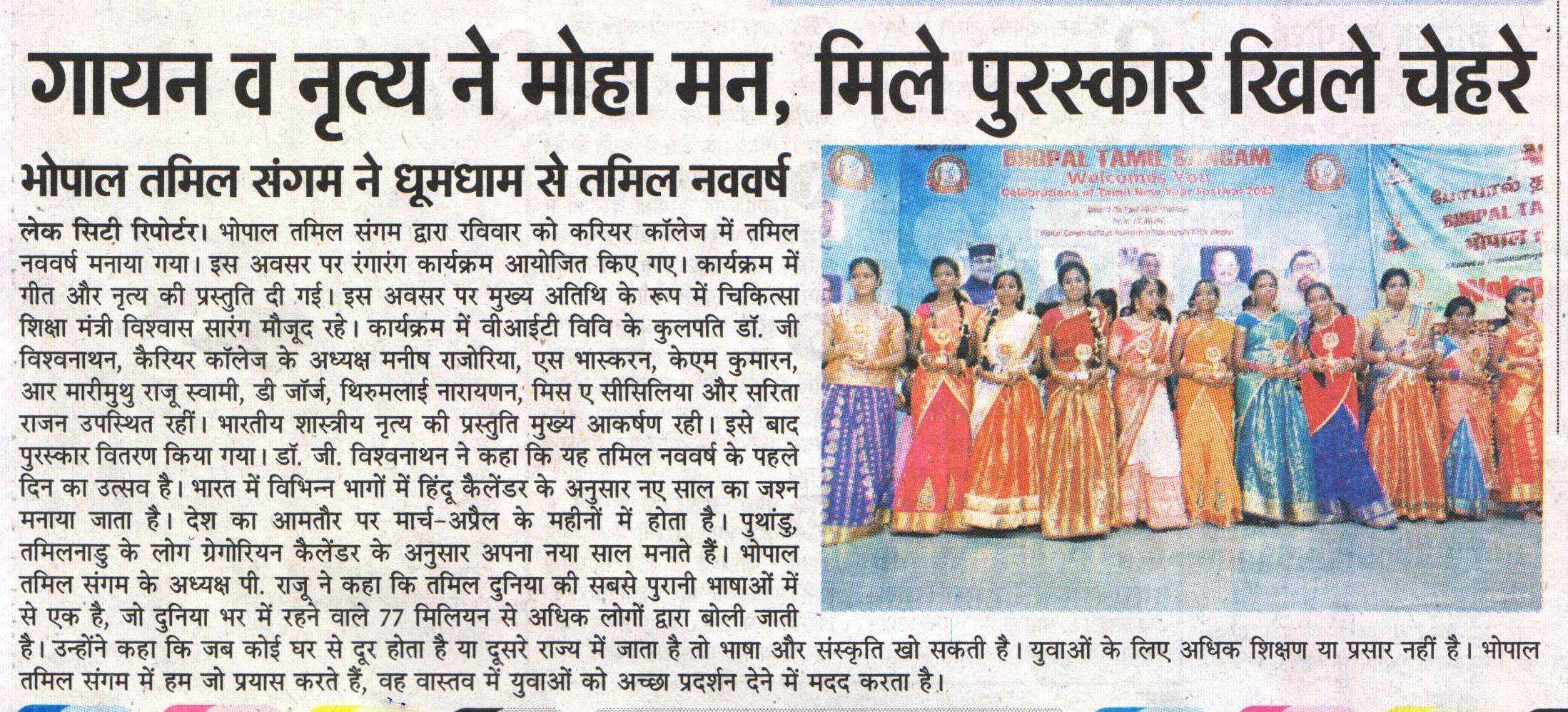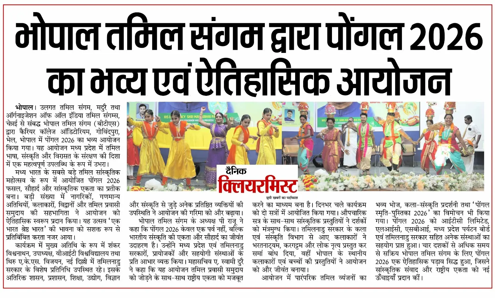 ஜனவரி 19 ஆம் நாள் 2020 ஆம் ஆண்டு போபால் தமிழ்ச் சங்கம் சார்பில் பொங்கல் விழா கொண்டாடப்பட்டது. இந்த பொங்கல் விழாவில் முதன்முறையாக போபாலின் வரலாற்றில், தமிழக அரசின் சார்பாக, தமிழ்நாடு இயல் இசை நாடக மன்றத்தால் அனுப்பப்பட்டது கிராமிய கலைக்குழு. இந்தக்குழுவின் பரத கலைஞர் பரத நாட்டியம் மிகச்சிறப்பாக ஆடினார்கள். கரகாட்டம் மற்றும் கிராமிய கலை நிகழ்ச்சிகள், நடனம், பாடல் மற்றும் கலைநிகழ்ச்சிகளை மக்கள் மனதை கவரும் வகையில் மிகச் சிறப்பாக வழங்கி சிறப்பித்தனர். நடன நிகழ்ச்சி விழா அரங்கை பார்வையாளர்களின் கரவோசையால் அதிர வைத்தது, பார்வையாளர்களை மகிழ்வித்தனர். போபாலில் நடத்திய முதல், தமிழக அரசின் சார்பாக அனுப்பப்பட்ட கிராமிய கலைக்குழு சரித்திரம் நாடகம் இது. தமிழக அரசு அனுப்பிய சிறந்த கலைஞர்களை கௌரவிக்கும் வாய்ப்பும் மற்றும் வருகை தந்த அதிகாரிகளை கௌரவிக்கும் அருமையான வாய்ப்பும் போபால் தமிழ்ச் சங்கத்திற்கு கிடைத்தது.