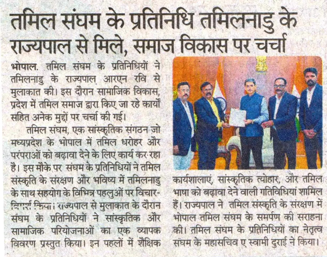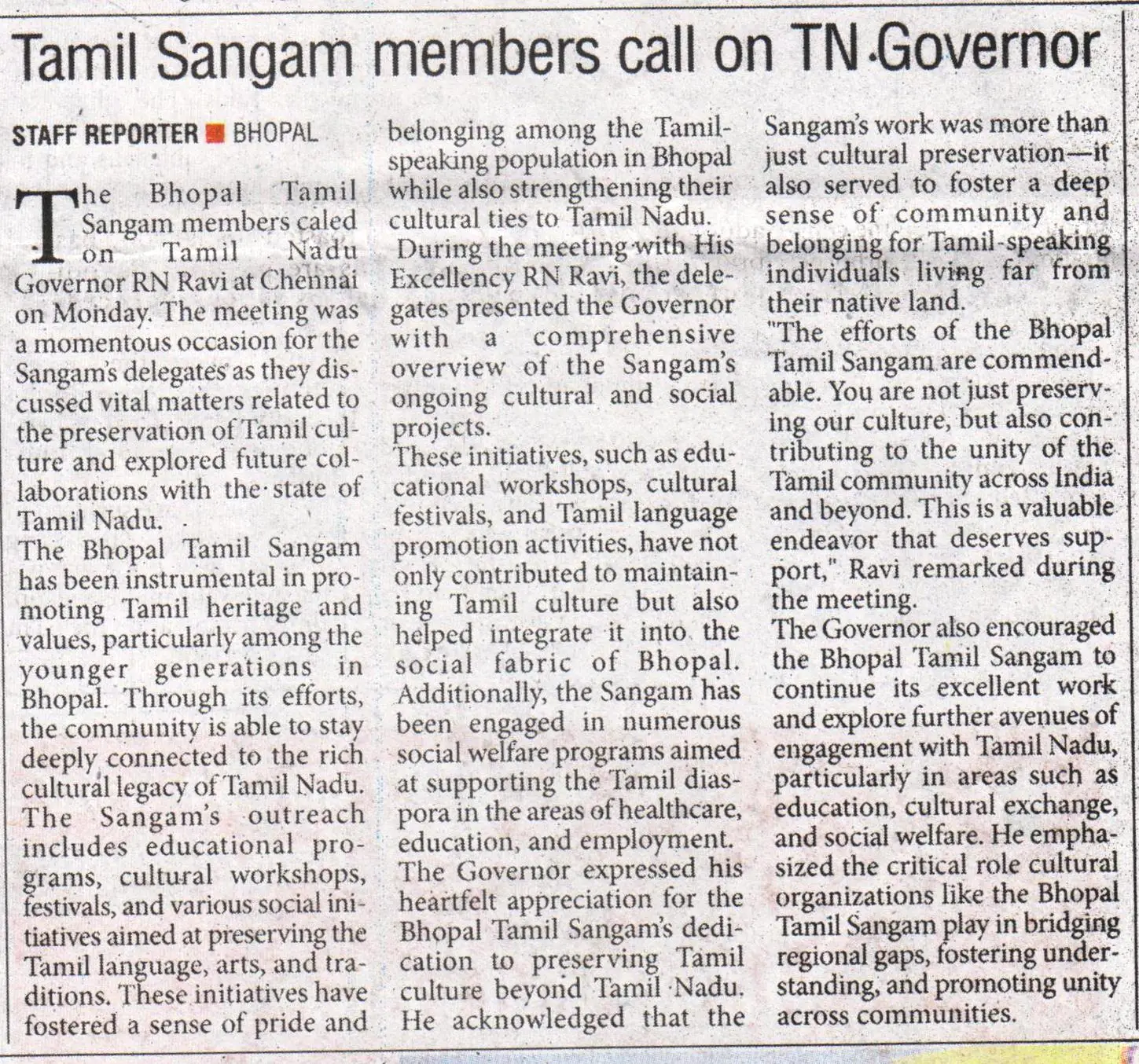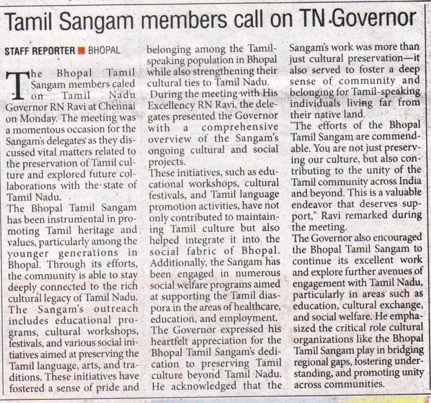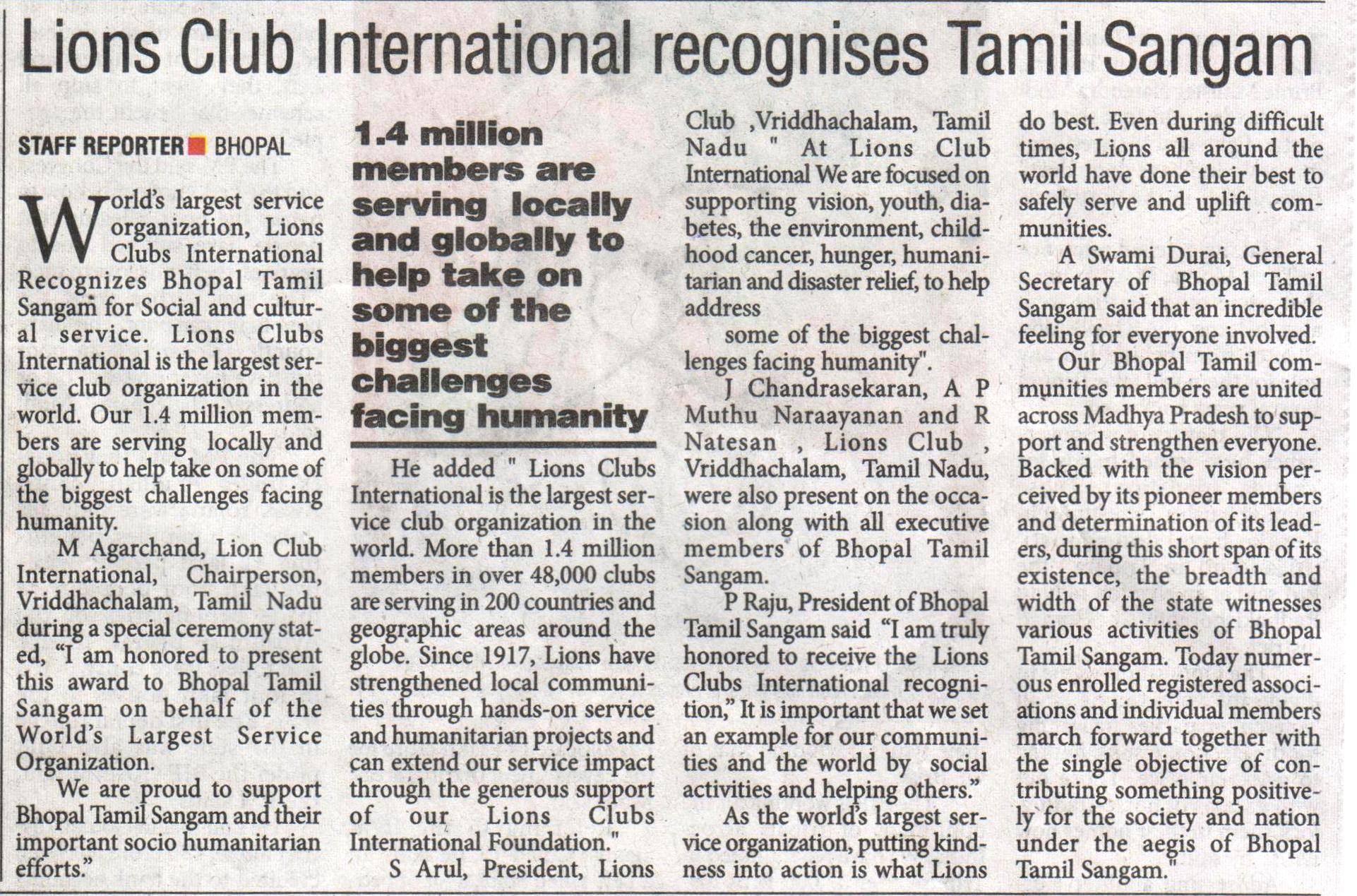 தமிழக அரசு உலகத் தமிழ்ச் சங்கத்தில்லும் மற்றும் அனைத்திந்திய தமிழ்ச் சங்கங்களின் பேரவையிலும் போபால் தமிழ்ச் சங்கம் பதிவு செய்யப்பட்டுள்ளது என்பதை நெகிழ்வோடு தெரிவிக்க விரும்புகிறோம். பதிவு செய்யப்பெற்ற இந்த அமைப்பு சாதி மதம் மற்றும் அரசியல் கட்சி மாறுபாடுகளுக்கப்பால் இயங்கிக்கொண்டு வருவதாகும்.