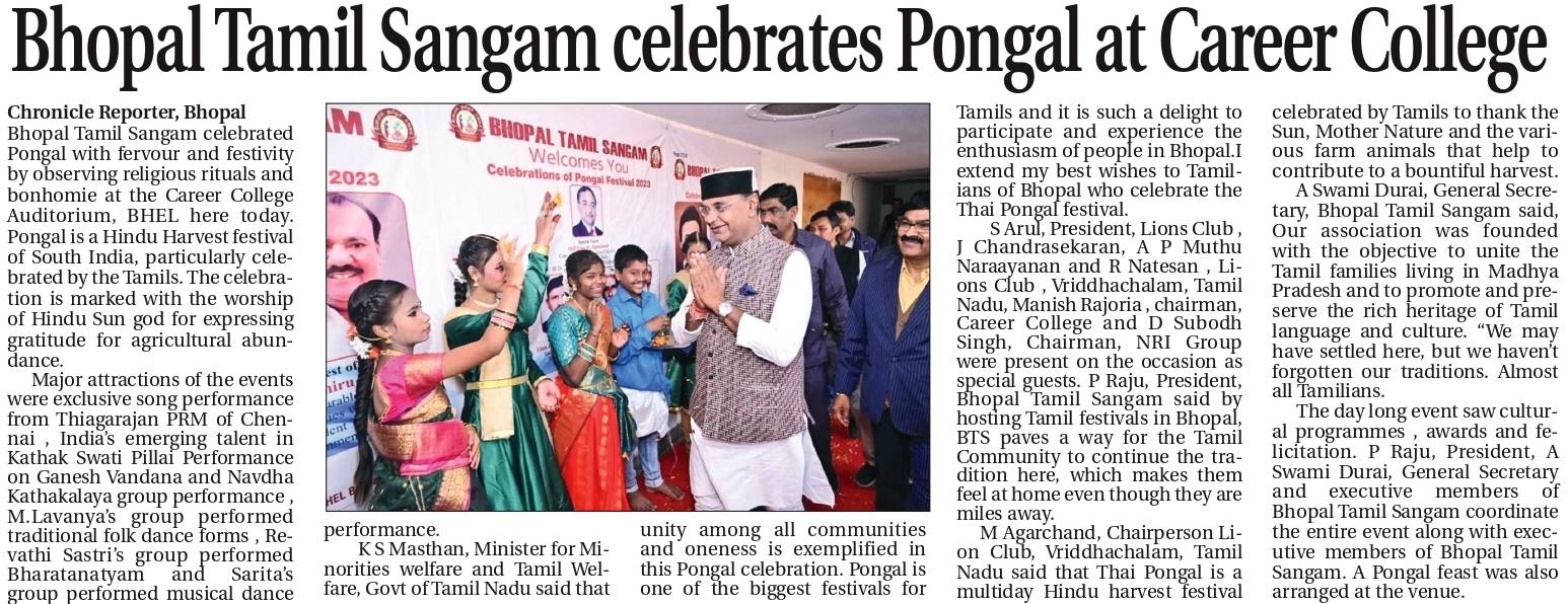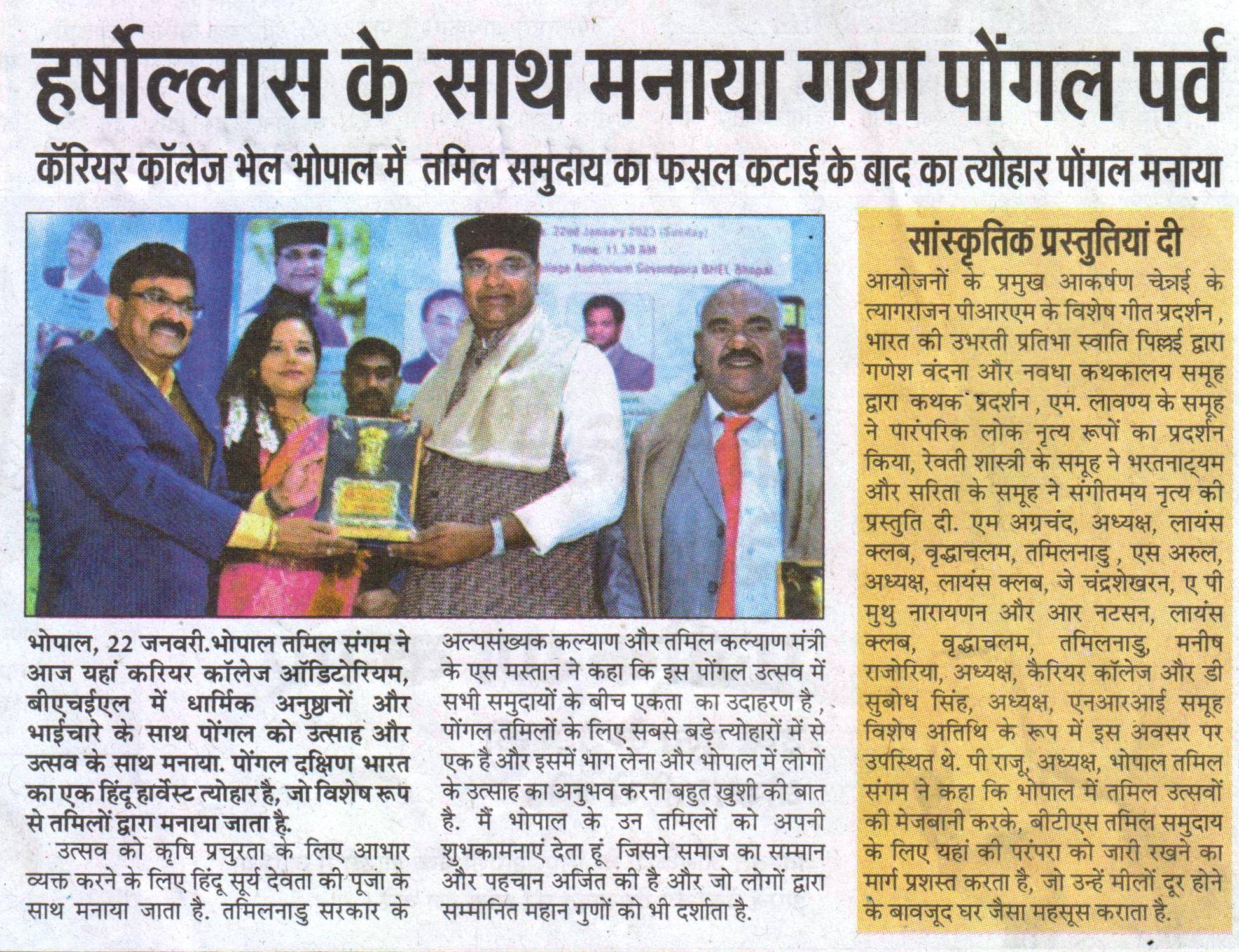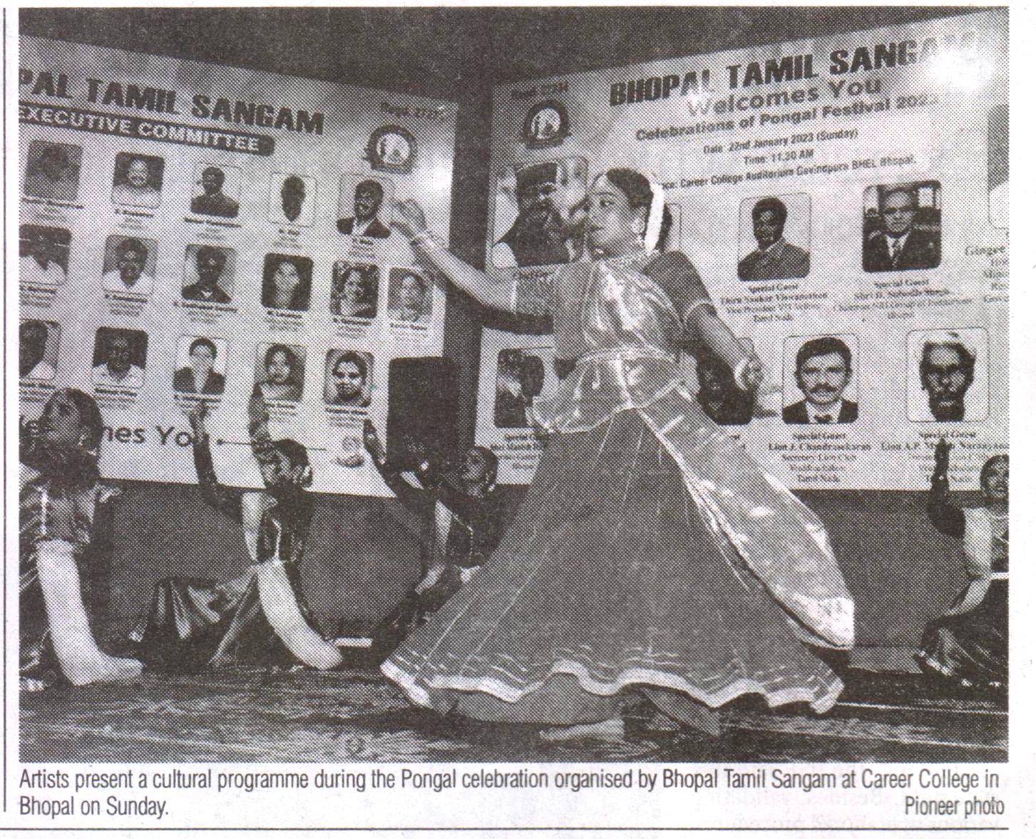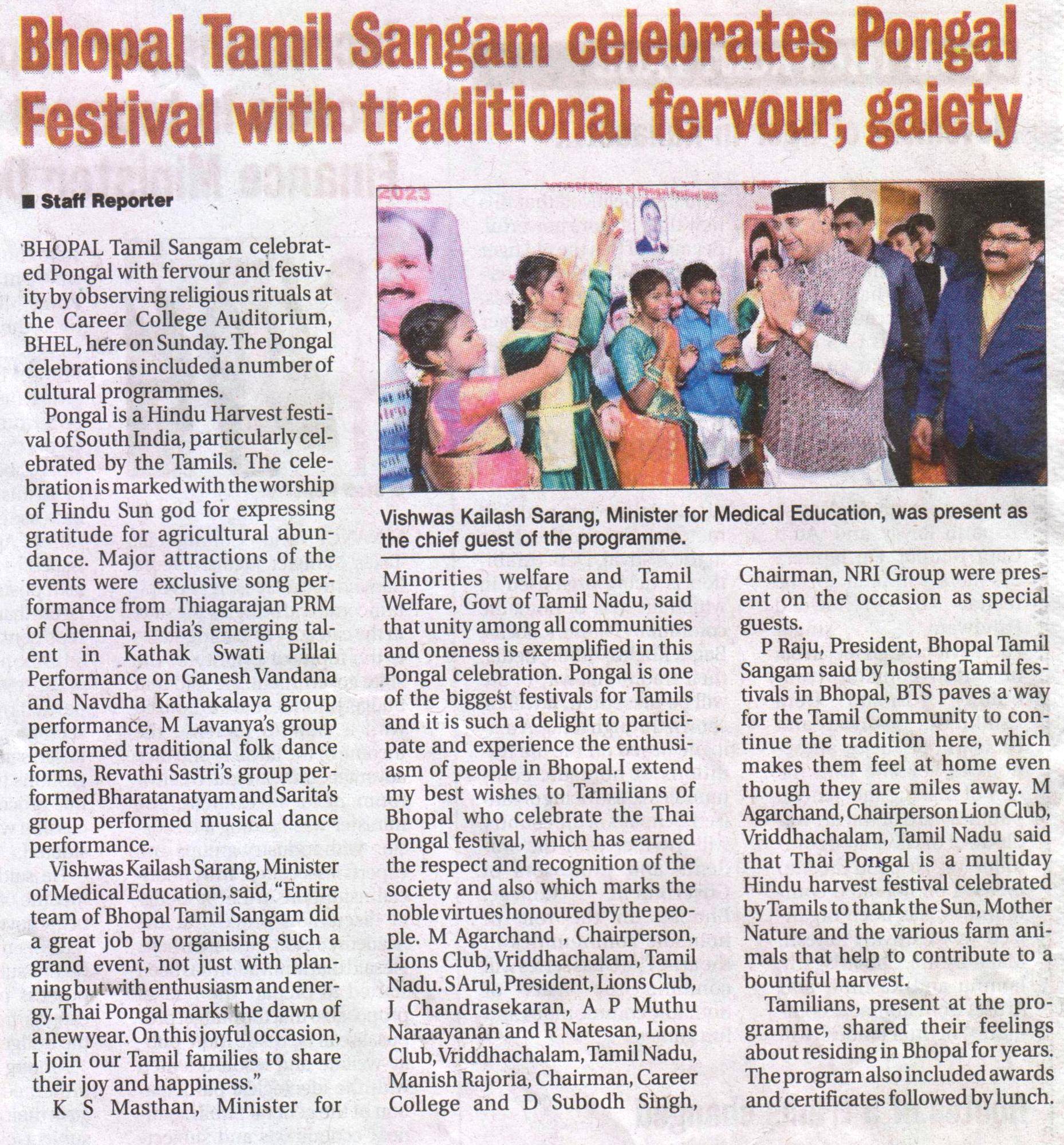 ஜனவரி 22 ஆம் நாள் 2023 ஆம் ஆண்டு போபால் தமிழ்ச் சங்கம் சார்பில் பொங்கல் விழா கொண்டாடப்பட்டது. இந்த பொங்கல் விழாவில் முதன்முறையாக போபாலின் வரலாற்றில், தமிழக அரசின் சார்பாக, தமிழக அரசு அனுப்பிய அயலகத் தமிழர் நலத்துறை மாண்புமிகு அமைச்சர் செஞ்சி திரு கே.எஸ்.மஸ்தான் அவர்கள் பிரதம விருந்தினராக விழாவில் பங்கேற்றார். மத்தியப் பிரதேசம் அரசின் சார்பாக மருத்துவக் கல்வி துறை மாண்புமிகு அமைச்சர் திரு விஸ்வாஸ் கைலாஷ் சாரங் அவர்கள் சிறப்பு விருந்தினராக விழாவில் பங்கேற்றார். மாநாட்டுத் தலைவர் லயன் கிளப், நிர்வாக இயக்குநர் ஸ்ரீ ஜெயின் ஜூவல்லரி பிரைவேட் லிமிடெட் MJF லயன் எம். அகர்சந்த் அவர்கள் சிறப்பு விருந்தினராக விழாவில் பங்கேற்றார். விருத்தாசலம் தமிழ்நாடு லயன் கமிட்டி குழுவினர்கள் சிறப்பு விருந்தினராக விழாவில் பங்கேற்றார்கள் மற்றும் பல்வேறு ஆட்சியாளர்கள் சிறப்பு விருந்தினராக விழாவில் பங்கேற்றார்கள். மாநாட்டுத் தலைவர் லயன் கிளப் நிர்வாக இயக்குநர் ஸ்ரீ ஜெயின் ஜூவல்லரி பிரைவேட் லிமிடெட் MJF லயன் எம். அகர்சந்த் அவர்கள் விழாவில் கலந்து கொண்டு சமூக மற்றும் கலாச்சார சேவைக்காக பாராட்டி போபால் தமிழ் சங்கத்திற்கு வழங்கப்பட்ட சர்வதேச ஜனாதிபதியின் பாராட்டு சான்றிதழை எங்களுக்கு வழங்கியுள்ளனர். மாண்புமிகு அமைச்சர் செஞ்சி திரு கே.எஸ்.மஸ்தான் அவர்கள் பேசுகையில் போபால் தமிழ்ச் சங்கத்தை மிகவும் பெரிதும் பாராட்டினார். இரு மாநிலங்களுக்கான அமைச்சர்களும் போபால் தமிழ்ச் சங்கத்தின் கலை நிகழ்ச்சி விழாவில் கலந்து கொண்டது பெரு நிகழ்வாகும் அவர்களின் ஆதரவும் கிடைக்கப்பெற்ற சங்கமாக போபால் தமிழ்ச் சங்கம் எழுந்து நிற்கிறது. இரு மாநிலங்களுக்கான அமைச்சர்கள் கலந்துகொண்டு சிறப்பித்த இந்த மைல்கல் விழாவில் தமிழர்களின் வளர்ச்சியிலும் தமிழர்களின் பங்கு என்றும் என்றும் போற்றப்படும் என்று புகழ்ந்துரைத்தார்கள். மாணவ, மாணவிகளும் கிராமிய நடனமாடி பார்வையாளர்களை மகிழ்வித்தனர். சிறப்பு மிக்க இந்த மிகப்பெரிய விழாவில் போபால் தமிழ்ச் சங்கத்திற்க்கா தமிழ் மையம் கட்டுவதற்கு அன்பளிப்பு வழங்க ஏற்பாடுசெய்யலாம் என்று மாண்புமிகு அமைச்சர் செஞ்சி திரு கே.எஸ்.மஸ்தான் அவர்கள், மற்றும் MJF லயன் எம். அகர்சந்த் அவர்கள் உறுதி கூறினார்கள். மேடை கலைநிகழ்ச்சிகள் பார்வையாளருக்கு இரசிகர்களுக்கு ஒரு நல்விருந்தாக அமைந்தது என்பதற்கு முதல் காட்சி அரங்கு நிறைந்த பார்வையாளர்கள் காட்சியாக இருந்ததே சான்று. போபாலில் நடத்திய முதல் தமிழக அரசின் சார்பாக மாண்புமிகு அமைச்சர் அனுப்பப்பட்டது சரித்திரம் இது.