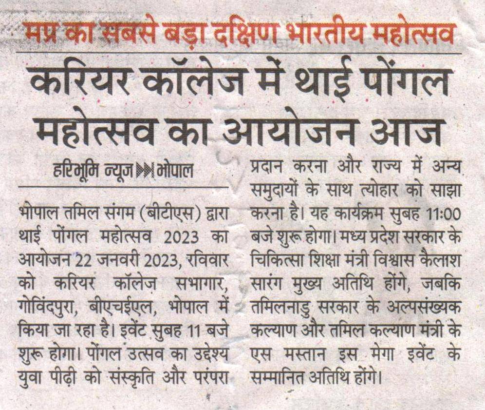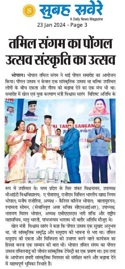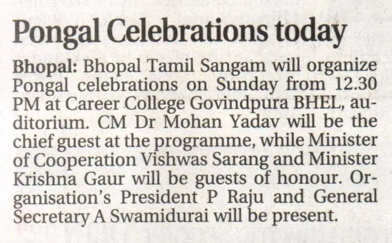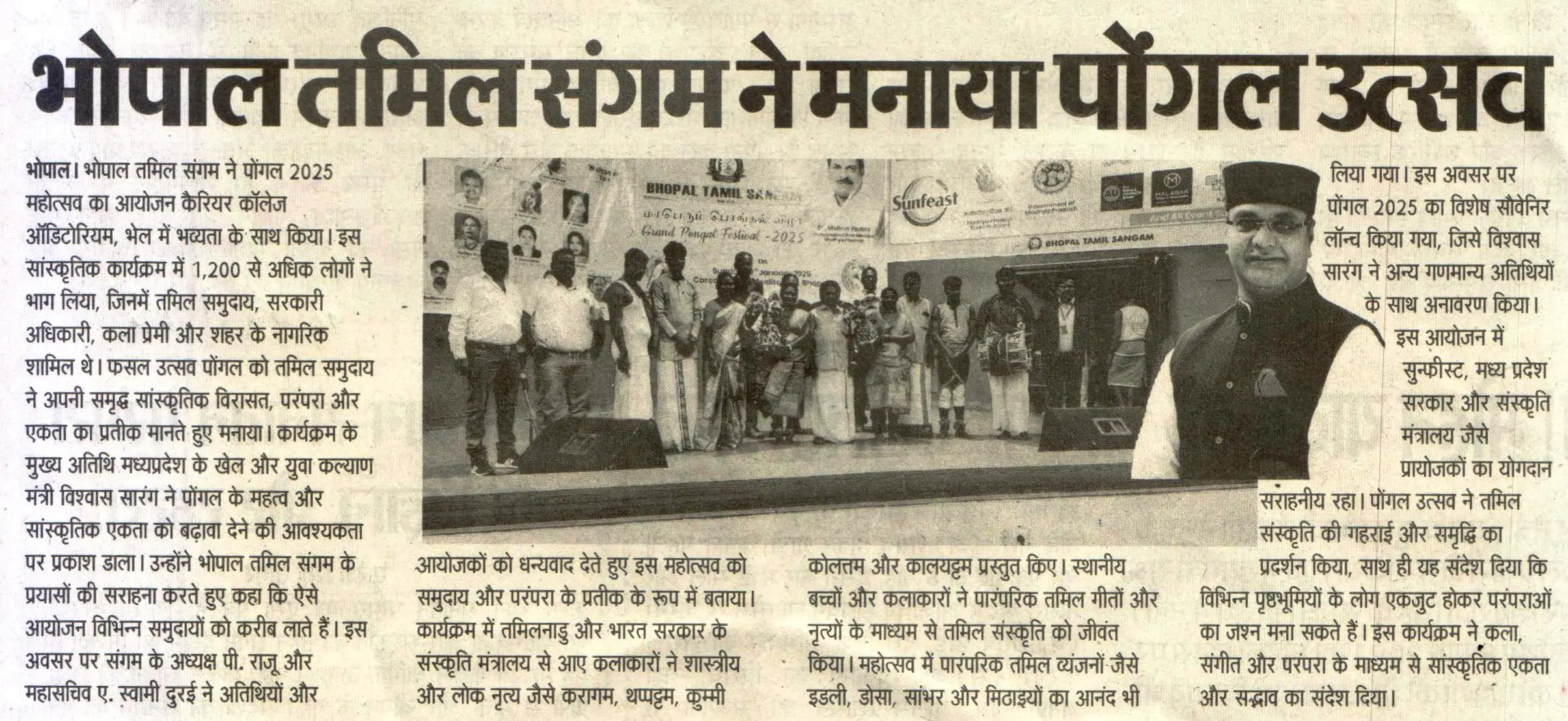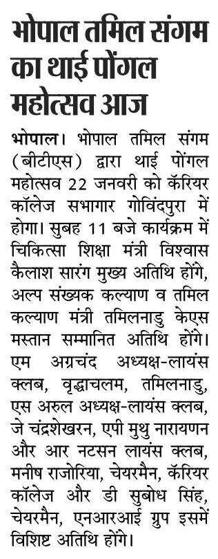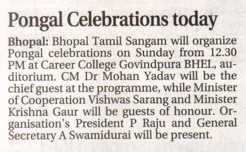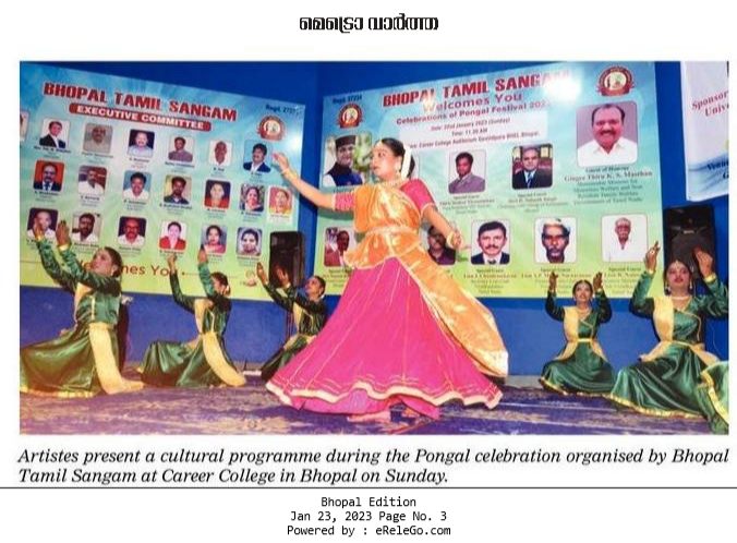ஜனவரி 22 ஆம் நாள் 2023 ஆம் ஆண்டு போபால் தமிழ்ச் சங்கம் சார்பில் பொங்கல் விழா கொண்டாடப்பட்டது. இந்த பொங்கல் விழாவில் முதன்முறையாக போபாலின் வரலாற்றில், தமிழக அரசின் சார்பாக, தமிழக அரசு அனுப்பிய அயலகத் தமிழர் நலத்துறை மாண்புமிகு அமைச்சர் செஞ்சி திரு கே.எஸ்.மஸ்தான் அவர்கள் பிரதம விருந்தினராக விழாவில் பங்கேற்றார். மத்தியப் பிரதேசம் அரசின் சார்பாக மருத்துவக் கல்வி துறை மாண்புமிகு அமைச்சர் திரு விஸ்வாஸ் கைலாஷ் சாரங் அவர்கள் சிறப்பு விருந்தினராக விழாவில் பங்கேற்றார். மாநாட்டுத் தலைவர் லயன் கிளப், நிர்வாக இயக்குநர் ஸ்ரீ ஜெயின் ஜூவல்லரி பிரைவேட் லிமிடெட் MJF லயன் எம். அகர்சந்த் அவர்கள் சிறப்பு விருந்தினராக விழாவில் பங்கேற்றார். விருத்தாசலம் தமிழ்நாடு லயன் கமிட்டி குழுவினர்கள் சிறப்பு விருந்தினராக விழாவில் பங்கேற்றார்கள் மற்றும் பல்வேறு ஆட்சியாளர்கள் சிறப்பு விருந்தினராக விழாவில் பங்கேற்றார்கள். மாநாட்டுத் தலைவர் லயன் கிளப் நிர்வாக இயக்குநர் ஸ்ரீ ஜெயின் ஜூவல்லரி பிரைவேட் லிமிடெட் MJF லயன் எம். அகர்சந்த் அவர்கள் விழாவில் கலந்து கொண்டு சமூக மற்றும் கலாச்சார சேவைக்காக பாராட்டி போபால் தமிழ் சங்கத்திற்கு வழங்கப்பட்ட சர்வதேச ஜனாதிபதியின் பாராட்டு சான்றிதழை எங்களுக்கு வழங்கியுள்ளனர். மாண்புமிகு அமைச்சர் செஞ்சி திரு கே.எஸ்.மஸ்தான் அவர்கள் பேசுகையில் போபால் தமிழ்ச் சங்கத்தை மிகவும் பெரிதும் பாராட்டினார். இரு மாநிலங்களுக்கான அமைச்சர்களும் போபால் தமிழ்ச் சங்கத்தின் கலை நிகழ்ச்சி விழாவில் கலந்து கொண்டது பெரு நிகழ்வாகும் அவர்களின் ஆதரவும் கிடைக்கப்பெற்ற சங்கமாக போபால் தமிழ்ச் சங்கம் எழுந்து நிற்கிறது. இரு மாநிலங்களுக்கான அமைச்சர்கள் கலந்துகொண்டு சிறப்பித்த இந்த மைல்கல் விழாவில் தமிழர்களின் வளர்ச்சியிலும் தமிழர்களின் பங்கு என்றும் என்றும் போற்றப்படும் என்று புகழ்ந்துரைத்தார்கள். மாணவ, மாணவிகளும் கிராமிய நடனமாடி பார்வையாளர்களை மகிழ்வித்தனர். சிறப்பு மிக்க இந்த மிகப்பெரிய விழாவில் போபால் தமிழ்ச் சங்கத்திற்க்கா தமிழ் மையம் கட்டுவதற்கு அன்பளிப்பு வழங்க ஏற்பாடுசெய்யலாம் என்று மாண்புமிகு அமைச்சர் செஞ்சி திரு கே.எஸ்.மஸ்தான் அவர்கள், மற்றும் MJF லயன் எம். அகர்சந்த் அவர்கள் உறுதி கூறினார்கள். மேடை கலைநிகழ்ச்சிகள் பார்வையாளருக்கு இரசிகர்களுக்கு ஒரு நல்விருந்தாக அமைந்தது என்பதற்கு முதல் காட்சி அரங்கு நிறைந்த பார்வையாளர்கள் காட்சியாக இருந்ததே சான்று. போபாலில் நடத்திய முதல் தமிழக அரசின் சார்பாக மாண்புமிகு அமைச்சர் அனுப்பப்பட்டது சரித்திரம் இது.