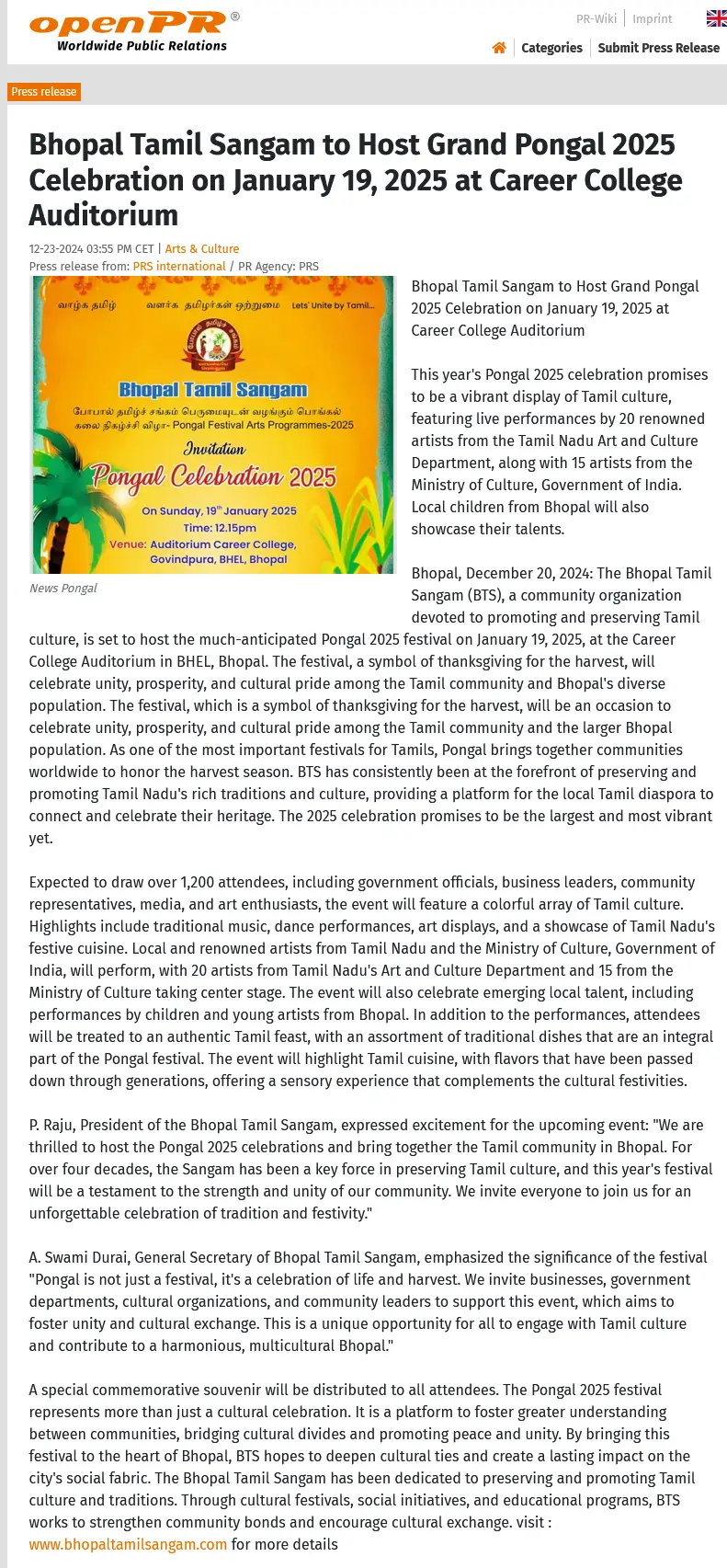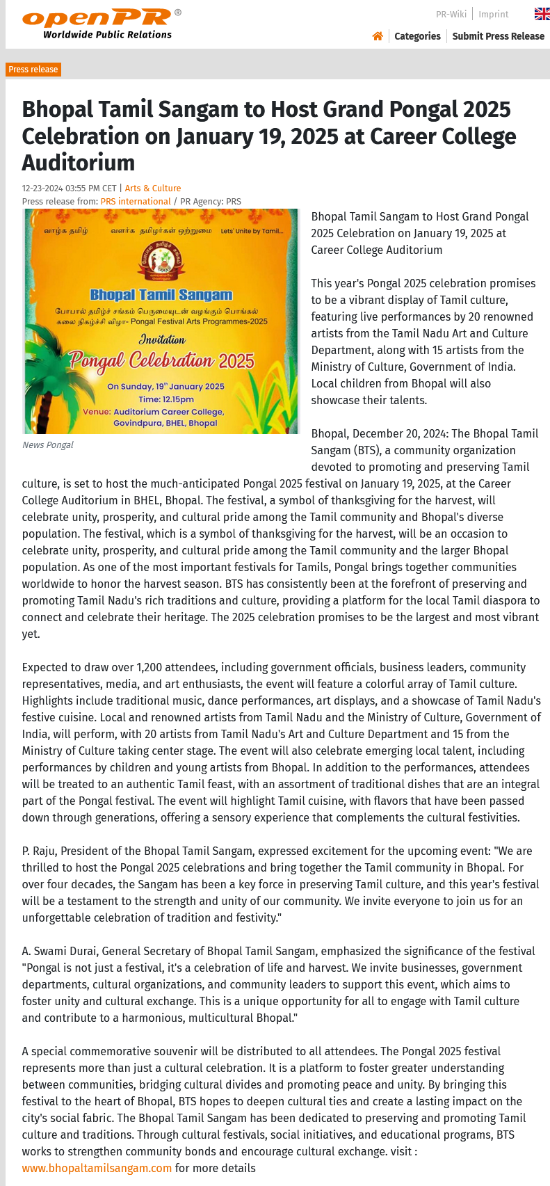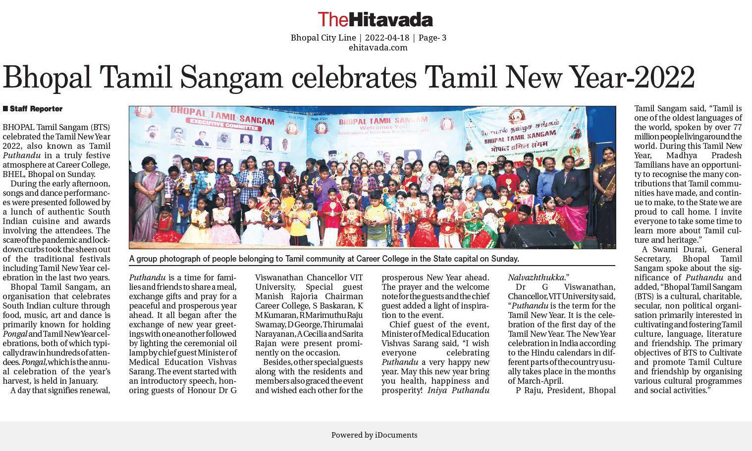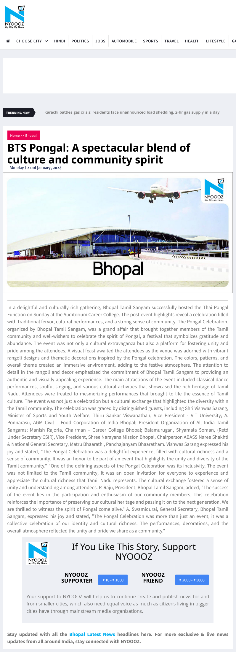 ஜனவரி 22 ஆம் நாள் 2023 ஆம் ஆண்டு போபால் தமிழ்ச் சங்கம் சார்பில் பொங்கல் விழா கொண்டாடப்பட்டது. இந்த பொங்கல் விழாவில் முதன்முறையாக போபாலின் வரலாற்றில், தமிழக அரசின் சார்பாக, தமிழக அரசு அனுப்பிய அயலகத் தமிழர் நலத்துறை மாண்புமிகு அமைச்சர் செஞ்சி திரு கே.எஸ்.மஸ்தான் அவர்கள் பிரதம விருந்தினராக விழாவில் பங்கேற்றார். மத்தியப் பிரதேசம் அரசின் சார்பாக மருத்துவக் கல்வி துறை மாண்புமிகு அமைச்சர் திரு விஸ்வாஸ் கைலாஷ் சாரங் அவர்கள் சிறப்பு விருந்தினராக விழாவில் பங்கேற்றார். மாநாட்டுத் தலைவர் லயன் கிளப், நிர்வாக இயக்குநர் ஸ்ரீ ஜெயின் ஜூவல்லரி பிரைவேட் லிமிடெட் MJF லயன் எம். அகர்சந்த் அவர்கள் சிறப்பு விருந்தினராக விழாவில் பங்கேற்றார். விருத்தாசலம் தமிழ்நாடு லயன் கமிட்டி குழுவினர்கள் சிறப்பு விருந்தினராக விழாவில் பங்கேற்றார்கள் மற்றும் பல்வேறு ஆட்சியாளர்கள் சிறப்பு விருந்தினராக விழாவில் பங்கேற்றார்கள். மாநாட்டுத் தலைவர் லயன் கிளப் நிர்வாக இயக்குநர் ஸ்ரீ ஜெயின் ஜூவல்லரி பிரைவேட் லிமிடெட் MJF லயன் எம். அகர்சந்த் அவர்கள் விழாவில் கலந்து கொண்டு சமூக மற்றும் கலாச்சார சேவைக்காக பாராட்டி போபால் தமிழ் சங்கத்திற்கு வழங்கப்பட்ட சர்வதேச ஜனாதிபதியின் பாராட்டு சான்றிதழை எங்களுக்கு வழங்கியுள்ளனர். மாண்புமிகு அமைச்சர் செஞ்சி திரு கே.எஸ்.மஸ்தான் அவர்கள் பேசுகையில் போபால் தமிழ்ச் சங்கத்தை மிகவும் பெரிதும் பாராட்டினார். இரு மாநிலங்களுக்கான அமைச்சர்களும் போபால் தமிழ்ச் சங்கத்தின் கலை நிகழ்ச்சி விழாவில் கலந்து கொண்டது பெரு நிகழ்வாகும் அவர்களின் ஆதரவும் கிடைக்கப்பெற்ற சங்கமாக போபால் தமிழ்ச் சங்கம் எழுந்து நிற்கிறது. இரு மாநிலங்களுக்கான அமைச்சர்கள் கலந்துகொண்டு சிறப்பித்த இந்த மைல்கல் விழாவில் தமிழர்களின் வளர்ச்சியிலும் தமிழர்களின் பங்கு என்றும் என்றும் போற்றப்படும் என்று புகழ்ந்துரைத்தார்கள். மாணவ, மாணவிகளும் கிராமிய நடனமாடி பார்வையாளர்களை மகிழ்வித்தனர். சிறப்பு மிக்க இந்த மிகப்பெரிய விழாவில் போபால் தமிழ்ச் சங்கத்திற்க்கா தமிழ் மையம் கட்டுவதற்கு அன்பளிப்பு வழங்க ஏற்பாடுசெய்யலாம் என்று மாண்புமிகு அமைச்சர் செஞ்சி திரு கே.எஸ்.மஸ்தான் அவர்கள், மற்றும் MJF லயன் எம். அகர்சந்த் அவர்கள் உறுதி கூறினார்கள். மேடை கலைநிகழ்ச்சிகள் பார்வையாளருக்கு இரசிகர்களுக்கு ஒரு நல்விருந்தாக அமைந்தது என்பதற்கு முதல் காட்சி அரங்கு நிறைந்த பார்வையாளர்கள் காட்சியாக இருந்ததே சான்று. போபாலில் நடத்திய முதல் தமிழக அரசின் சார்பாக மாண்புமிகு அமைச்சர் அனுப்பப்பட்டது சரித்திரம் இது.